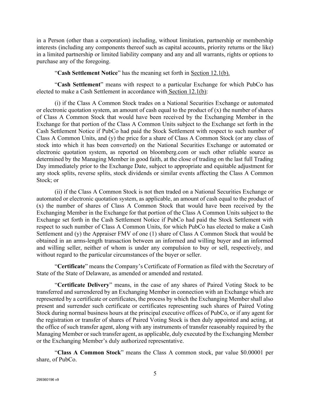 299360196 v9 5 in a Person (other than a corporation) including, without limitation, partnership or membership interests (including any components thereof such as capital accounts, priority returns or the like) in a limited partnership or limited liability company and any and all warrants, rights or options to purchase any of the foregoing. “Cash Settlement Notice” has the meaning set forth in Section 12.1(b). “Cash Settlement” means with respect to a particular Exchange for which PubCo has elected to make a Cash Settlement in accordance with Section 12.1(b): (i) if the Class A Common Stock trades on a National Securities Exchange or automated or electronic quotation system, an amount of cash equal to the product of (x) the number of shares of Class A Common Stock that would have been received by the Exchanging Member in the Exchange for that portion of the Class A Common Units subject to the Exchange set forth in the Cash Settlement Notice if PubCo had paid the Stock Settlement with respect to such number of Class A Common Units, and (y) the price for a share of Class A Common Stock (or any class of stock into which it has been converted) on the National Securities Exchange or automated or electronic quotation system, as reported on bloomberg.com or such other reliable source as determined by the Managing Member in good faith, at the close of trading on the last full Trading Day immediately prior to the Exchange Date, subject to appropriate and equitable adjustment for any stock splits, reverse splits, stock dividends or similar events affecting the Class A Common Stock; or (ii) if the Class A Common Stock is not then traded on a National Securities Exchange or automated or electronic quotation system, as applicable, an amount of cash equal to the product of (x) the number of shares of Class A Common Stock that would have been received by the Exchanging Member in the Exchange for that portion of the Class A Common Units subject to the Exchange set forth in the Cash Settlement Notice if PubCo had paid the Stock Settlement with respect to such number of Class A Common Units, for which PubCo has elected to make a Cash Settlement and (y) the Appraiser FMV of one (1) share of Class A Common Stock that would be obtained in an arms-length transaction between an informed and willing buyer and an informed and willing seller, neither of whom is under any compulsion to buy or sell, respectively, and without regard to the particular circumstances of the buyer or seller. “Certificate” means the Company’s Certificate of Formation as filed with the Secretary of State of the State of Delaware, as amended or amended and restated. “Certificate Delivery” means, in the case of any shares of Paired Voting Stock to be transferred and surrendered by an Exchanging Member in connection with an Exchange which are represented by a certificate or certificates, the process by which the Exchanging Member shall also present and surrender such certificate or certificates representing such shares of Paired Voting Stock during normal business hours at the principal executive offices of PubCo, or if any agent for the registration or transfer of shares of Paired Voting Stock is then duly appointed and acting, at the office of such transfer agent, along with any instruments of transfer reasonably required by the Managing Member or such transfer agent, as applicable, duly executed by the Exchanging Member or the Exchanging Member’s duly authorized representative. “Class A Common Stock” means the Class A common stock, par value $0.00001 per share, of PubCo.