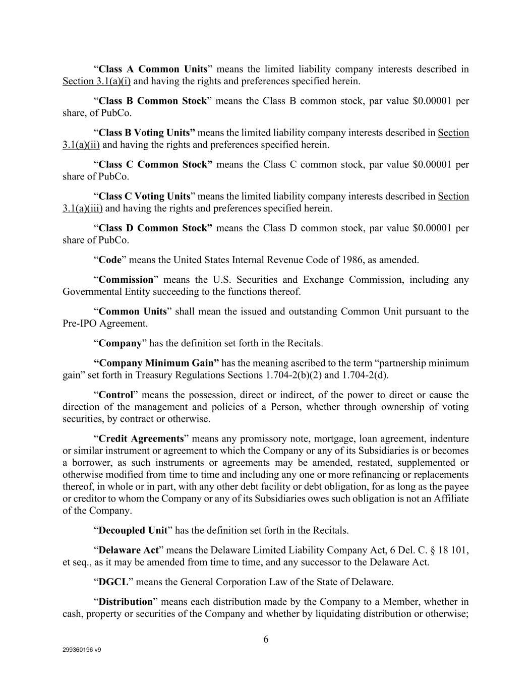 299360196 v9 6 “Class A Common Units” means the limited liability company interests described in Section 3.1(a)(i) and having the rights and preferences specified herein. “Class B Common Stock” means the Class B common stock, par value $0.00001 per share, of PubCo. “Class B Voting Units” means the limited liability company interests described in Section 3.1(a)(ii) and having the rights and preferences specified herein. “Class C Common Stock” means the Class C common stock, par value $0.00001 per share of PubCo. “Class C Voting Units” means the limited liability company interests described in Section 3.1(a)(iii) and having the rights and preferences specified herein. “Class D Common Stock” means the Class D common stock, par value $0.00001 per share of PubCo. “Code” means the United States Internal Revenue Code of 1986, as amended. “Commission” means the U.S. Securities and Exchange Commission, including any Governmental Entity succeeding to the functions thereof. “Common Units” shall mean the issued and outstanding Common Unit pursuant to the Pre-IPO Agreement. “Company” has the definition set forth in the Recitals. “Company Minimum Gain” has the meaning ascribed to the term “partnership minimum gain” set forth in Treasury Regulations Sections 1.704-2(b)(2) and 1.704-2(d). “Control” means the possession, direct or indirect, of the power to direct or cause the direction of the management and policies of a Person, whether through ownership of voting securities, by contract or otherwise. “Credit Agreements” means any promissory note, mortgage, loan agreement, indenture or similar instrument or agreement to which the Company or any of its Subsidiaries is or becomes a borrower, as such instruments or agreements may be amended, restated, supplemented or otherwise modified from time to time and including any one or more refinancing or replacements thereof, in whole or in part, with any other debt facility or debt obligation, for as long as the payee or creditor to whom the Company or any of its Subsidiaries owes such obligation is not an Affiliate of the Company. “Decoupled Unit” has the definition set forth in the Recitals. “Delaware Act” means the Delaware Limited Liability Company Act, 6 Del. C. § 18 101, et seq., as it may be amended from time to time, and any successor to the Delaware Act. “DGCL” means the General Corporation Law of the State of Delaware. “Distribution” means each distribution made by the Company to a Member, whether in cash, property or securities of the Company and whether by liquidating distribution or otherwise;