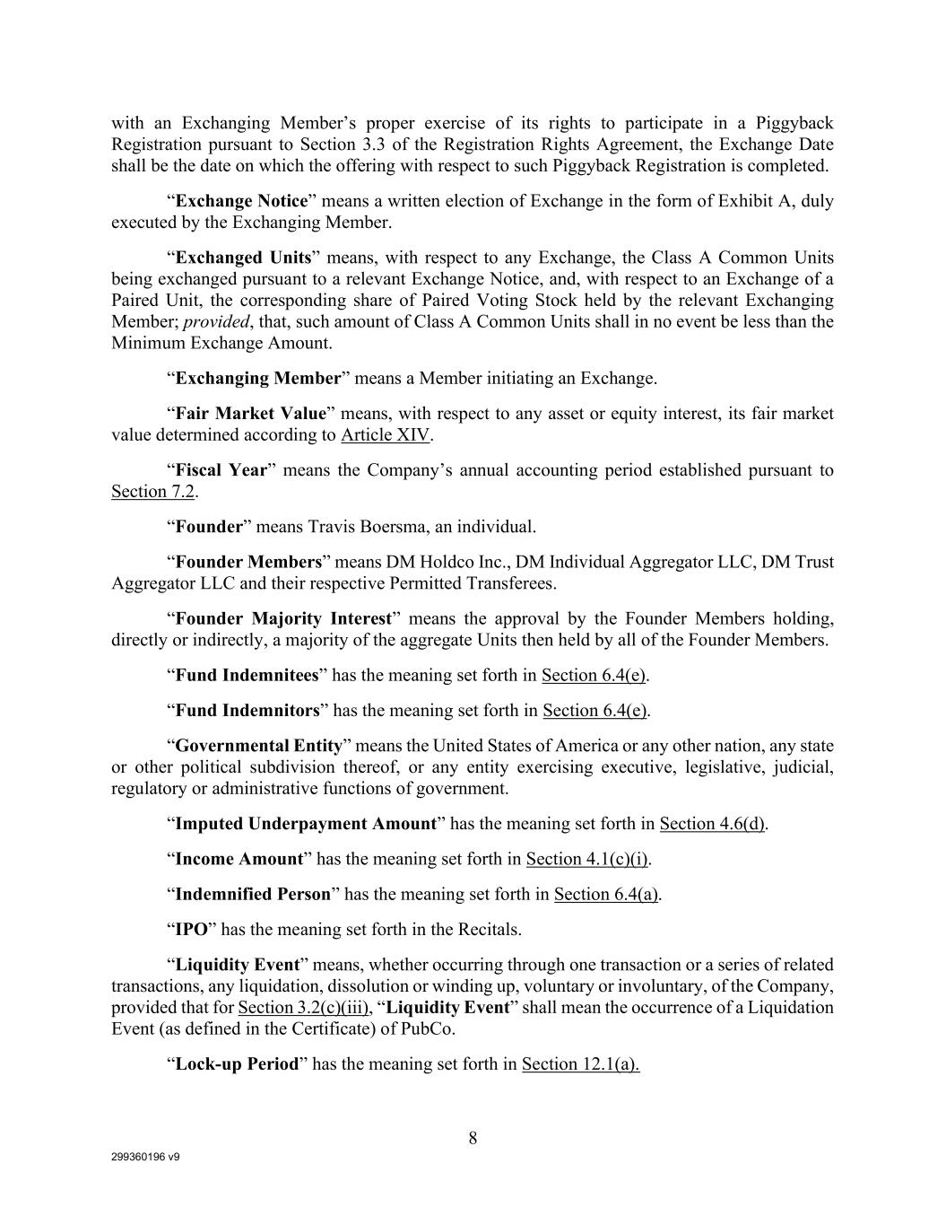 299360196 v9 8 with an Exchanging Member’s proper exercise of its rights to participate in a Piggyback Registration pursuant to Section 3.3 of the Registration Rights Agreement, the Exchange Date shall be the date on which the offering with respect to such Piggyback Registration is completed. “Exchange Notice” means a written election of Exchange in the form of Exhibit A, duly executed by the Exchanging Member. “Exchanged Units” means, with respect to any Exchange, the Class A Common Units being exchanged pursuant to a relevant Exchange Notice, and, with respect to an Exchange of a Paired Unit, the corresponding share of Paired Voting Stock held by the relevant Exchanging Member; provided, that, such amount of Class A Common Units shall in no event be less than the Minimum Exchange Amount. “Exchanging Member” means a Member initiating an Exchange. “Fair Market Value” means, with respect to any asset or equity interest, its fair market value determined according to Article XIV. “Fiscal Year” means the Company’s annual accounting period established pursuant to Section 7.2. “Founder” means Travis Boersma, an individual. “Founder Members” means DM Holdco Inc., DM Individual Aggregator LLC, DM Trust Aggregator LLC and their respective Permitted Transferees. “Founder Majority Interest” means the approval by the Founder Members holding, directly or indirectly, a majority of the aggregate Units then held by all of the Founder Members. “Fund Indemnitees” has the meaning set forth in Section 6.4(e). “Fund Indemnitors” has the meaning set forth in Section 6.4(e). “Governmental Entity” means the United States of America or any other nation, any state or other political subdivision thereof, or any entity exercising executive, legislative, judicial, regulatory or administrative functions of government. “Imputed Underpayment Amount” has the meaning set forth in Section 4.6(d). “Income Amount” has the meaning set forth in Section 4.1(c)(i). “Indemnified Person” has the meaning set forth in Section 6.4(a). “IPO” has the meaning set forth in the Recitals. “Liquidity Event” means, whether occurring through one transaction or a series of related transactions, any liquidation, dissolution or winding up, voluntary or involuntary, of the Company, provided that for Section 3.2(c)(iii), “Liquidity Event” shall mean the occurrence of a Liquidation Event (as defined in the Certificate) of PubCo. “Lock-up Period” has the meaning set forth in Section 12.1(a).