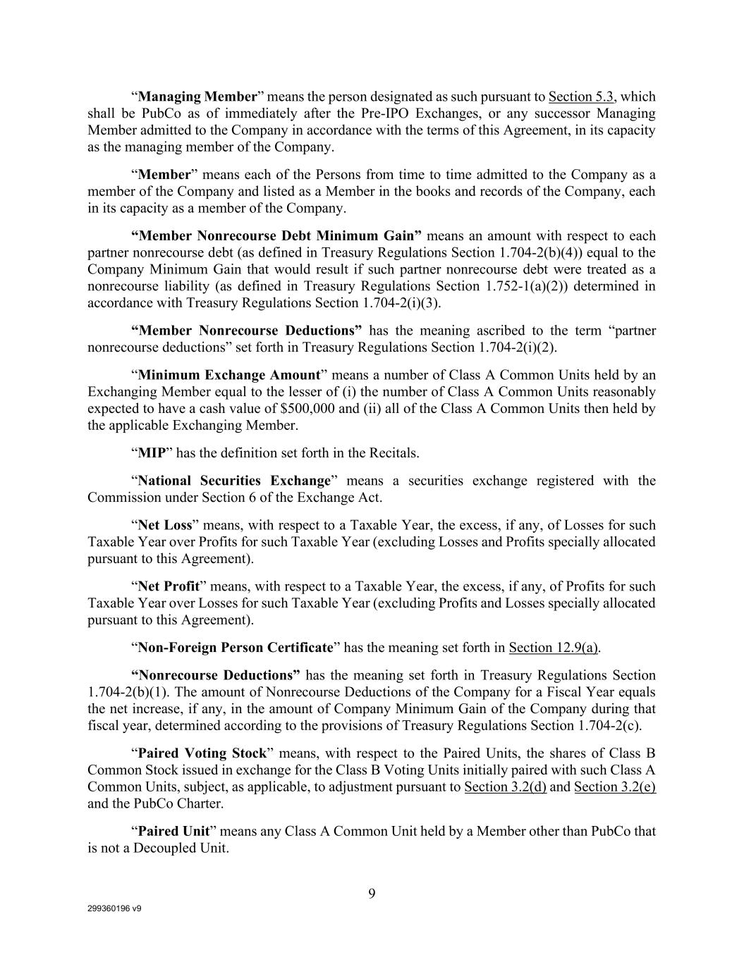 299360196 v9 9 “Managing Member” means the person designated as such pursuant to Section 5.3, which shall be PubCo as of immediately after the Pre-IPO Exchanges, or any successor Managing Member admitted to the Company in accordance with the terms of this Agreement, in its capacity as the managing member of the Company. “Member” means each of the Persons from time to time admitted to the Company as a member of the Company and listed as a Member in the books and records of the Company, each in its capacity as a member of the Company. “Member Nonrecourse Debt Minimum Gain” means an amount with respect to each partner nonrecourse debt (as defined in Treasury Regulations Section 1.704-2(b)(4)) equal to the Company Minimum Gain that would result if such partner nonrecourse debt were treated as a nonrecourse liability (as defined in Treasury Regulations Section 1.752-1(a)(2)) determined in accordance with Treasury Regulations Section 1.704-2(i)(3). “Member Nonrecourse Deductions” has the meaning ascribed to the term “partner nonrecourse deductions” set forth in Treasury Regulations Section 1.704-2(i)(2). “Minimum Exchange Amount” means a number of Class A Common Units held by an Exchanging Member equal to the lesser of (i) the number of Class A Common Units reasonably expected to have a cash value of $500,000 and (ii) all of the Class A Common Units then held by the applicable Exchanging Member. “MIP” has the definition set forth in the Recitals. “National Securities Exchange” means a securities exchange registered with the Commission under Section 6 of the Exchange Act. “Net Loss” means, with respect to a Taxable Year, the excess, if any, of Losses for such Taxable Year over Profits for such Taxable Year (excluding Losses and Profits specially allocated pursuant to this Agreement). “Net Profit” means, with respect to a Taxable Year, the excess, if any, of Profits for such Taxable Year over Losses for such Taxable Year (excluding Profits and Losses specially allocated pursuant to this Agreement). “Non-Foreign Person Certificate” has the meaning set forth in Section 12.9(a). “Nonrecourse Deductions” has the meaning set forth in Treasury Regulations Section 1.704-2(b)(1). The amount of Nonrecourse Deductions of the Company for a Fiscal Year equals the net increase, if any, in the amount of Company Minimum Gain of the Company during that fiscal year, determined according to the provisions of Treasury Regulations Section 1.704-2(c). “Paired Voting Stock” means, with respect to the Paired Units, the shares of Class B Common Stock issued in exchange for the Class B Voting Units initially paired with such Class A Common Units, subject, as applicable, to adjustment pursuant to Section 3.2(d) and Section 3.2(e) and the PubCo Charter. “Paired Unit” means any Class A Common Unit held by a Member other than PubCo that is not a Decoupled Unit.