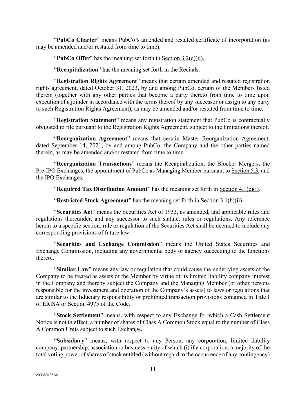 299360196 v9 11 “PubCo Charter” means PubCo’s amended and restated certificate of incorporation (as may be amended and/or restated from time to time). “PubCo Offer” has the meaning set forth in Section 3.2(c)(ii). “Recapitalization” has the meaning set forth in the Recitals. “Registration Rights Agreement” means that certain amended and restated registration rights agreement, dated October 31, 2023, by and among PubCo, certain of the Members listed therein (together with any other parties that become a party thereto from time to time upon execution of a joinder in accordance with the terms thereof by any successor or assign to any party to such Registration Rights Agreement), as may be amended and/or restated from time to time. “Registration Statement” means any registration statement that PubCo is contractually obligated to file pursuant to the Registration Rights Agreement, subject to the limitations thereof. “Reorganization Agreement” means that certain Master Reorganization Agreement, dated September 14, 2021, by and among PubCo, the Company and the other parties named therein, as may be amended and/or restated from time to time. “Reorganization Transactions” means the Recapitalization, the Blocker Mergers, the Pre-IPO Exchanges, the appointment of PubCo as Managing Member pursuant to Section 5.3, and the IPO Exchanges. “Required Tax Distribution Amount” has the meaning set forth in Section 4.1(c)(i). “Restricted Stock Agreement” has the meaning set forth in Section 3.1(b)(ii). “Securities Act” means the Securities Act of 1933, as amended, and applicable rules and regulations thereunder, and any successor to such statute, rules or regulations. Any reference herein to a specific section, rule or regulation of the Securities Act shall be deemed to include any corresponding provisions of future law. “Securities and Exchange Commission” means the United States Securities and Exchange Commission, including any governmental body or agency succeeding to the functions thereof. “Similar Law” means any law or regulation that could cause the underlying assets of the Company to be treated as assets of the Member by virtue of its limited liability company interest in the Company and thereby subject the Company and the Managing Member (or other persons responsible for the investment and operation of the Company’s assets) to laws or regulations that are similar to the fiduciary responsibility or prohibited transaction provisions contained in Title I of ERISA or Section 4975 of the Code. “Stock Settlement” means, with respect to any Exchange for which a Cash Settlement Notice is not in effect, a number of shares of Class A Common Stock equal to the number of Class A Common Units subject to such Exchange. “Subsidiary” means, with respect to any Person, any corporation, limited liability company, partnership, association or business entity of which (i) if a corporation, a majority of the total voting power of shares of stock entitled (without regard to the occurrence of any contingency)