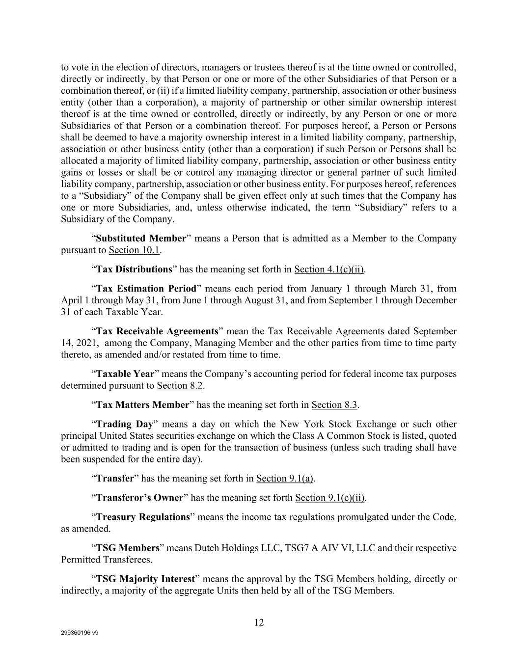 299360196 v9 12 to vote in the election of directors, managers or trustees thereof is at the time owned or controlled, directly or indirectly, by that Person or one or more of the other Subsidiaries of that Person or a combination thereof, or (ii) if a limited liability company, partnership, association or other business entity (other than a corporation), a majority of partnership or other similar ownership interest thereof is at the time owned or controlled, directly or indirectly, by any Person or one or more Subsidiaries of that Person or a combination thereof. For purposes hereof, a Person or Persons shall be deemed to have a majority ownership interest in a limited liability company, partnership, association or other business entity (other than a corporation) if such Person or Persons shall be allocated a majority of limited liability company, partnership, association or other business entity gains or losses or shall be or control any managing director or general partner of such limited liability company, partnership, association or other business entity. For purposes hereof, references to a “Subsidiary” of the Company shall be given effect only at such times that the Company has one or more Subsidiaries, and, unless otherwise indicated, the term “Subsidiary” refers to a Subsidiary of the Company. “Substituted Member” means a Person that is admitted as a Member to the Company pursuant to Section 10.1. “Tax Distributions” has the meaning set forth in Section 4.1(c)(ii). “Tax Estimation Period” means each period from January 1 through March 31, from April 1 through May 31, from June 1 through August 31, and from September 1 through December 31 of each Taxable Year. “Tax Receivable Agreements” mean the Tax Receivable Agreements dated September 14, 2021, among the Company, Managing Member and the other parties from time to time party thereto, as amended and/or restated from time to time. “Taxable Year” means the Company’s accounting period for federal income tax purposes determined pursuant to Section 8.2. “Tax Matters Member” has the meaning set forth in Section 8.3. “Trading Day” means a day on which the New York Stock Exchange or such other principal United States securities exchange on which the Class A Common Stock is listed, quoted or admitted to trading and is open for the transaction of business (unless such trading shall have been suspended for the entire day). “Transfer” has the meaning set forth in Section 9.1(a). “Transferor’s Owner” has the meaning set forth Section 9.1(c)(ii). “Treasury Regulations” means the income tax regulations promulgated under the Code, as amended. “TSG Members” means Dutch Holdings LLC, TSG7 A AIV VI, LLC and their respective Permitted Transferees. “TSG Majority Interest” means the approval by the TSG Members holding, directly or indirectly, a majority of the aggregate Units then held by all of the TSG Members.