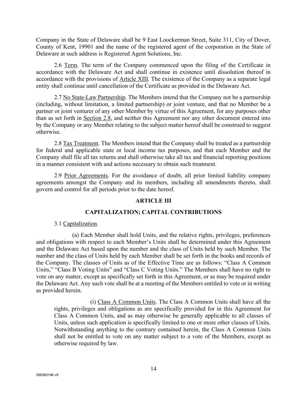 299360196 v9 14 Company in the State of Delaware shall be 9 East Loockerman Street, Suite 311, City of Dover, County of Kent, 19901 and the name of the registered agent of the corporation in the State of Delaware at such address is Registered Agent Solutions, Inc. 2.6 Term. The term of the Company commenced upon the filing of the Certificate in accordance with the Delaware Act and shall continue in existence until dissolution thereof in accordance with the provisions of Article XIII. The existence of the Company as a separate legal entity shall continue until cancellation of the Certificate as provided in the Delaware Act. 2.7 No State-Law Partnership. The Members intend that the Company not be a partnership (including, without limitation, a limited partnership) or joint venture, and that no Member be a partner or joint venturer of any other Member by virtue of this Agreement, for any purposes other than as set forth in Section 2.8, and neither this Agreement nor any other document entered into by the Company or any Member relating to the subject matter hereof shall be construed to suggest otherwise. 2.8 Tax Treatment. The Members intend that the Company shall be treated as a partnership for federal and applicable state or local income tax purposes, and that each Member and the Company shall file all tax returns and shall otherwise take all tax and financial reporting positions in a manner consistent with and actions necessary to obtain such treatment. 2.9 Prior Agreements. For the avoidance of doubt, all prior limited liability company agreements amongst the Company and its members, including all amendments thereto, shall govern and control for all periods prior to the date hereof. ARTICLE III CAPITALIZATION; CAPITAL CONTRIBUTIONS 3.1 Capitalization. (a) Each Member shall hold Units, and the relative rights, privileges, preferences and obligations with respect to each Member’s Units shall be determined under this Agreement and the Delaware Act based upon the number and the class of Units held by such Member. The number and the class of Units held by each Member shall be set forth in the books and records of the Company. The classes of Units as of the Effective Time are as follows: “Class A Common Units,” “Class B Voting Units” and “Class C Voting Units.” The Members shall have no right to vote on any matter, except as specifically set forth in this Agreement, or as may be required under the Delaware Act. Any such vote shall be at a meeting of the Members entitled to vote or in writing as provided herein. (i) Class A Common Units. The Class A Common Units shall have all the rights, privileges and obligations as are specifically provided for in this Agreement for Class A Common Units, and as may otherwise be generally applicable to all classes of Units, unless such application is specifically limited to one or more other classes of Units. Notwithstanding anything to the contrary contained herein, the Class A Common Units shall not be entitled to vote on any matter subject to a vote of the Members, except as otherwise required by law.