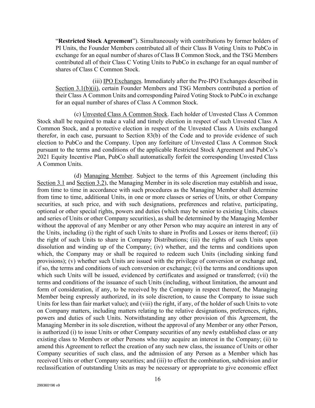 299360196 v9 16 “Restricted Stock Agreement”). Simultaneously with contributions by former holders of PI Units, the Founder Members contributed all of their Class B Voting Units to PubCo in exchange for an equal number of shares of Class B Common Stock, and the TSG Members contributed all of their Class C Voting Units to PubCo in exchange for an equal number of shares of Class C Common Stock. (iii) IPO Exchanges. Immediately after the Pre-IPO Exchanges described in Section 3.1(b)(ii), certain Founder Members and TSG Members contributed a portion of their Class A Common Units and corresponding Paired Voting Stock to PubCo in exchange for an equal number of shares of Class A Common Stock. (c) Unvested Class A Common Stock. Each holder of Unvested Class A Common Stock shall be required to make a valid and timely election in respect of such Unvested Class A Common Stock, and a protective election in respect of the Unvested Class A Units exchanged therefor, in each case, pursuant to Section 83(b) of the Code and to provide evidence of such election to PubCo and the Company. Upon any forfeiture of Unvested Class A Common Stock pursuant to the terms and conditions of the applicable Restricted Stock Agreement and PubCo’s 2021 Equity Incentive Plan, PubCo shall automatically forfeit the corresponding Unvested Class A Common Units. (d) Managing Member. Subject to the terms of this Agreement (including this Section 3.1 and Section 3.2), the Managing Member in its sole discretion may establish and issue, from time to time in accordance with such procedures as the Managing Member shall determine from time to time, additional Units, in one or more classes or series of Units, or other Company securities, at such price, and with such designations, preferences and relative, participating, optional or other special rights, powers and duties (which may be senior to existing Units, classes and series of Units or other Company securities), as shall be determined by the Managing Member without the approval of any Member or any other Person who may acquire an interest in any of the Units, including (i) the right of such Units to share in Profits and Losses or items thereof; (ii) the right of such Units to share in Company Distributions; (iii) the rights of such Units upon dissolution and winding up of the Company; (iv) whether, and the terms and conditions upon which, the Company may or shall be required to redeem such Units (including sinking fund provisions); (v) whether such Units are issued with the privilege of conversion or exchange and, if so, the terms and conditions of such conversion or exchange; (vi) the terms and conditions upon which such Units will be issued, evidenced by certificates and assigned or transferred; (vii) the terms and conditions of the issuance of such Units (including, without limitation, the amount and form of consideration, if any, to be received by the Company in respect thereof, the Managing Member being expressly authorized, in its sole discretion, to cause the Company to issue such Units for less than fair market value); and (viii) the right, if any, of the holder of such Units to vote on Company matters, including matters relating to the relative designations, preferences, rights, powers and duties of such Units. Notwithstanding any other provision of this Agreement, the Managing Member in its sole discretion, without the approval of any Member or any other Person, is authorized (i) to issue Units or other Company securities of any newly established class or any existing class to Members or other Persons who may acquire an interest in the Company; (ii) to amend this Agreement to reflect the creation of any such new class, the issuance of Units or other Company securities of such class, and the admission of any Person as a Member which has received Units or other Company securities; and (iii) to effect the combination, subdivision and/or reclassification of outstanding Units as may be necessary or appropriate to give economic effect