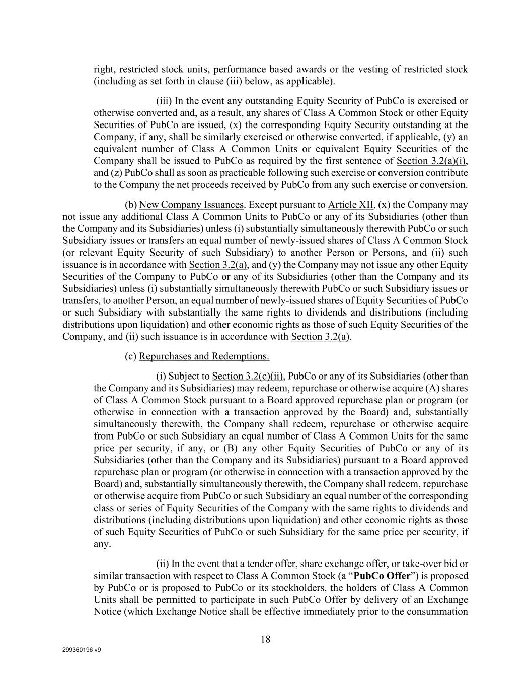 299360196 v9 18 right, restricted stock units, performance based awards or the vesting of restricted stock (including as set forth in clause (iii) below, as applicable). (iii) In the event any outstanding Equity Security of PubCo is exercised or otherwise converted and, as a result, any shares of Class A Common Stock or other Equity Securities of PubCo are issued, (x) the corresponding Equity Security outstanding at the Company, if any, shall be similarly exercised or otherwise converted, if applicable, (y) an equivalent number of Class A Common Units or equivalent Equity Securities of the Company shall be issued to PubCo as required by the first sentence of Section 3.2(a)(i), and (z) PubCo shall as soon as practicable following such exercise or conversion contribute to the Company the net proceeds received by PubCo from any such exercise or conversion. (b) New Company Issuances. Except pursuant to Article XII, (x) the Company may not issue any additional Class A Common Units to PubCo or any of its Subsidiaries (other than the Company and its Subsidiaries) unless (i) substantially simultaneously therewith PubCo or such Subsidiary issues or transfers an equal number of newly-issued shares of Class A Common Stock (or relevant Equity Security of such Subsidiary) to another Person or Persons, and (ii) such issuance is in accordance with Section 3.2(a), and (y) the Company may not issue any other Equity Securities of the Company to PubCo or any of its Subsidiaries (other than the Company and its Subsidiaries) unless (i) substantially simultaneously therewith PubCo or such Subsidiary issues or transfers, to another Person, an equal number of newly-issued shares of Equity Securities of PubCo or such Subsidiary with substantially the same rights to dividends and distributions (including distributions upon liquidation) and other economic rights as those of such Equity Securities of the Company, and (ii) such issuance is in accordance with Section 3.2(a). (c) Repurchases and Redemptions. (i) Subject to Section 3.2(c)(ii), PubCo or any of its Subsidiaries (other than the Company and its Subsidiaries) may redeem, repurchase or otherwise acquire (A) shares of Class A Common Stock pursuant to a Board approved repurchase plan or program (or otherwise in connection with a transaction approved by the Board) and, substantially simultaneously therewith, the Company shall redeem, repurchase or otherwise acquire from PubCo or such Subsidiary an equal number of Class A Common Units for the same price per security, if any, or (B) any other Equity Securities of PubCo or any of its Subsidiaries (other than the Company and its Subsidiaries) pursuant to a Board approved repurchase plan or program (or otherwise in connection with a transaction approved by the Board) and, substantially simultaneously therewith, the Company shall redeem, repurchase or otherwise acquire from PubCo or such Subsidiary an equal number of the corresponding class or series of Equity Securities of the Company with the same rights to dividends and distributions (including distributions upon liquidation) and other economic rights as those of such Equity Securities of PubCo or such Subsidiary for the same price per security, if any. (ii) In the event that a tender offer, share exchange offer, or take-over bid or similar transaction with respect to Class A Common Stock (a “PubCo Offer”) is proposed by PubCo or is proposed to PubCo or its stockholders, the holders of Class A Common Units shall be permitted to participate in such PubCo Offer by delivery of an Exchange Notice (which Exchange Notice shall be effective immediately prior to the consummation