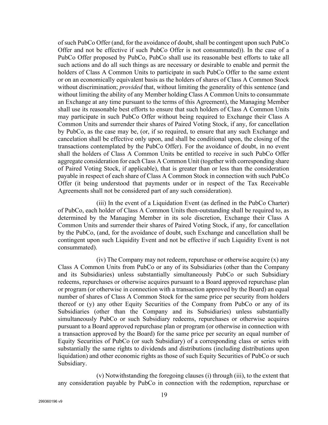 299360196 v9 19 of such PubCo Offer (and, for the avoidance of doubt, shall be contingent upon such PubCo Offer and not be effective if such PubCo Offer is not consummated)). In the case of a PubCo Offer proposed by PubCo, PubCo shall use its reasonable best efforts to take all such actions and do all such things as are necessary or desirable to enable and permit the holders of Class A Common Units to participate in such PubCo Offer to the same extent or on an economically equivalent basis as the holders of shares of Class A Common Stock without discrimination; provided that, without limiting the generality of this sentence (and without limiting the ability of any Member holding Class A Common Units to consummate an Exchange at any time pursuant to the terms of this Agreement), the Managing Member shall use its reasonable best efforts to ensure that such holders of Class A Common Units may participate in such PubCo Offer without being required to Exchange their Class A Common Units and surrender their shares of Paired Voting Stock, if any, for cancellation by PubCo, as the case may be, (or, if so required, to ensure that any such Exchange and cancelation shall be effective only upon, and shall be conditional upon, the closing of the transactions contemplated by the PubCo Offer). For the avoidance of doubt, in no event shall the holders of Class A Common Units be entitled to receive in such PubCo Offer aggregate consideration for each Class A Common Unit (together with corresponding share of Paired Voting Stock, if applicable), that is greater than or less than the consideration payable in respect of each share of Class A Common Stock in connection with such PubCo Offer (it being understood that payments under or in respect of the Tax Receivable Agreements shall not be considered part of any such consideration). (iii) In the event of a Liquidation Event (as defined in the PubCo Charter) of PubCo, each holder of Class A Common Units then-outstanding shall be required to, as determined by the Managing Member in its sole discretion, Exchange their Class A Common Units and surrender their shares of Paired Voting Stock, if any, for cancellation by the PubCo, (and, for the avoidance of doubt, such Exchange and cancellation shall be contingent upon such Liquidity Event and not be effective if such Liquidity Event is not consummated). (iv) The Company may not redeem, repurchase or otherwise acquire (x) any Class A Common Units from PubCo or any of its Subsidiaries (other than the Company and its Subsidiaries) unless substantially simultaneously PubCo or such Subsidiary redeems, repurchases or otherwise acquires pursuant to a Board approved repurchase plan or program (or otherwise in connection with a transaction approved by the Board) an equal number of shares of Class A Common Stock for the same price per security from holders thereof or (y) any other Equity Securities of the Company from PubCo or any of its Subsidiaries (other than the Company and its Subsidiaries) unless substantially simultaneously PubCo or such Subsidiary redeems, repurchases or otherwise acquires pursuant to a Board approved repurchase plan or program (or otherwise in connection with a transaction approved by the Board) for the same price per security an equal number of Equity Securities of PubCo (or such Subsidiary) of a corresponding class or series with substantially the same rights to dividends and distributions (including distributions upon liquidation) and other economic rights as those of such Equity Securities of PubCo or such Subsidiary. (v) Notwithstanding the foregoing clauses (i) through (iii), to the extent that any consideration payable by PubCo in connection with the redemption, repurchase or