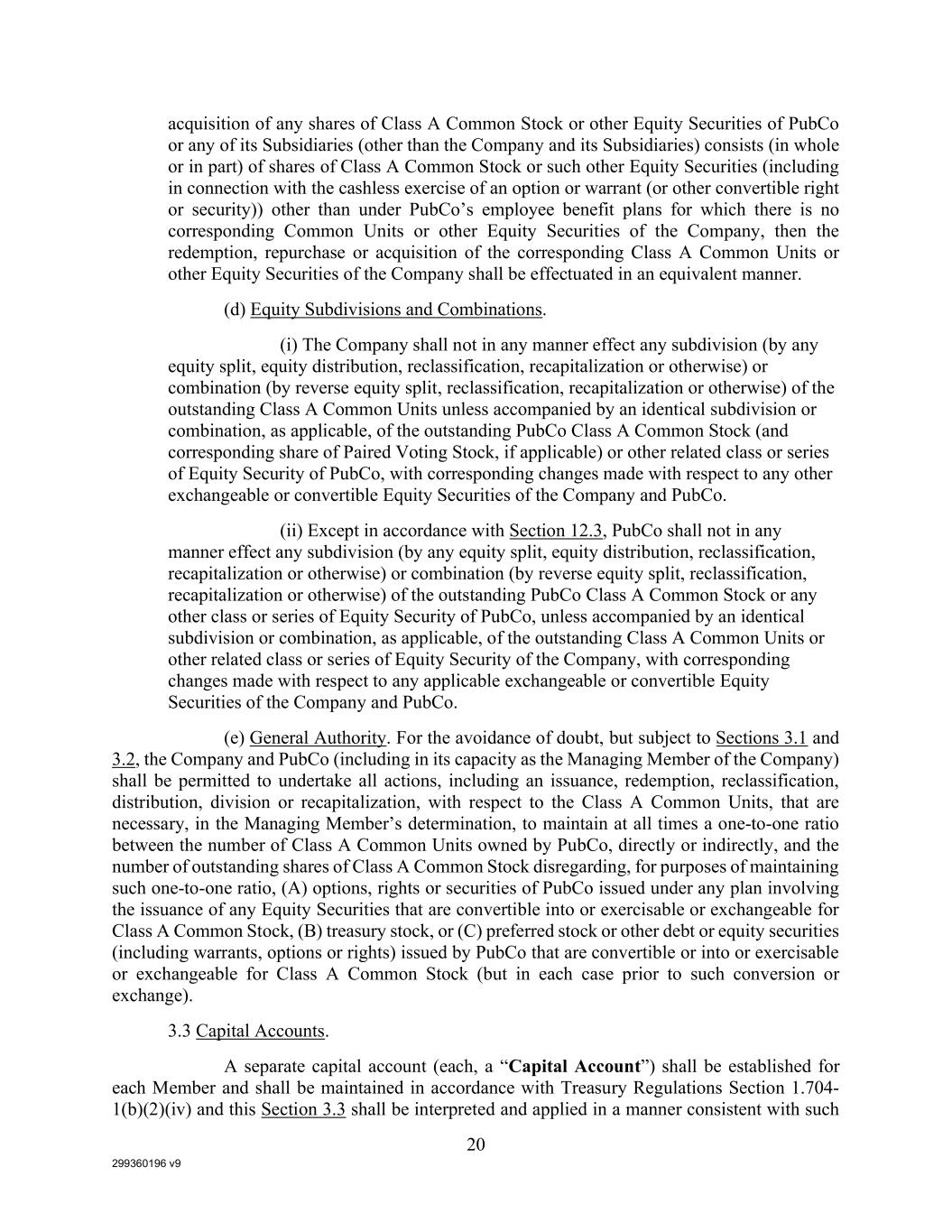 299360196 v9 20 acquisition of any shares of Class A Common Stock or other Equity Securities of PubCo or any of its Subsidiaries (other than the Company and its Subsidiaries) consists (in whole or in part) of shares of Class A Common Stock or such other Equity Securities (including in connection with the cashless exercise of an option or warrant (or other convertible right or security)) other than under PubCo’s employee benefit plans for which there is no corresponding Common Units or other Equity Securities of the Company, then the redemption, repurchase or acquisition of the corresponding Class A Common Units or other Equity Securities of the Company shall be effectuated in an equivalent manner. (d) Equity Subdivisions and Combinations. (i) The Company shall not in any manner effect any subdivision (by any equity split, equity distribution, reclassification, recapitalization or otherwise) or combination (by reverse equity split, reclassification, recapitalization or otherwise) of the outstanding Class A Common Units unless accompanied by an identical subdivision or combination, as applicable, of the outstanding PubCo Class A Common Stock (and corresponding share of Paired Voting Stock, if applicable) or other related class or series of Equity Security of PubCo, with corresponding changes made with respect to any other exchangeable or convertible Equity Securities of the Company and PubCo. (ii) Except in accordance with Section 12.3, PubCo shall not in any manner effect any subdivision (by any equity split, equity distribution, reclassification, recapitalization or otherwise) or combination (by reverse equity split, reclassification, recapitalization or otherwise) of the outstanding PubCo Class A Common Stock or any other class or series of Equity Security of PubCo, unless accompanied by an identical subdivision or combination, as applicable, of the outstanding Class A Common Units or other related class or series of Equity Security of the Company, with corresponding changes made with respect to any applicable exchangeable or convertible Equity Securities of the Company and PubCo. (e) General Authority. For the avoidance of doubt, but subject to Sections 3.1 and 3.2, the Company and PubCo (including in its capacity as the Managing Member of the Company) shall be permitted to undertake all actions, including an issuance, redemption, reclassification, distribution, division or recapitalization, with respect to the Class A Common Units, that are necessary, in the Managing Member’s determination, to maintain at all times a one-to-one ratio between the number of Class A Common Units owned by PubCo, directly or indirectly, and the number of outstanding shares of Class A Common Stock disregarding, for purposes of maintaining such one-to-one ratio, (A) options, rights or securities of PubCo issued under any plan involving the issuance of any Equity Securities that are convertible into or exercisable or exchangeable for Class A Common Stock, (B) treasury stock, or (C) preferred stock or other debt or equity securities (including warrants, options or rights) issued by PubCo that are convertible or into or exercisable or exchangeable for Class A Common Stock (but in each case prior to such conversion or exchange). 3.3 Capital Accounts. A separate capital account (each, a “Capital Account”) shall be established for each Member and shall be maintained in accordance with Treasury Regulations Section 1.704- 1(b)(2)(iv) and this Section 3.3 shall be interpreted and applied in a manner consistent with such