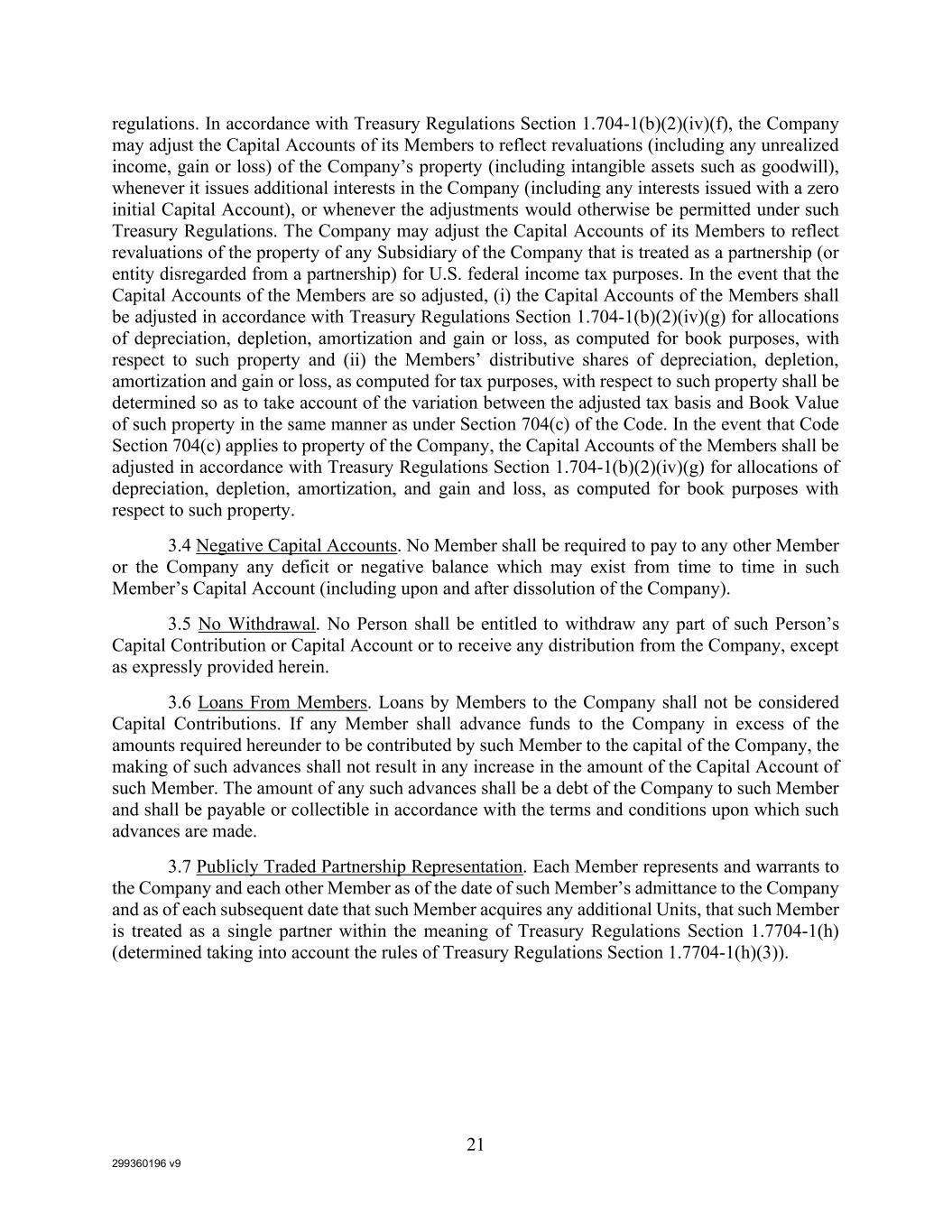 299360196 v9 21 regulations. In accordance with Treasury Regulations Section 1.704-1(b)(2)(iv)(f), the Company may adjust the Capital Accounts of its Members to reflect revaluations (including any unrealized income, gain or loss) of the Company’s property (including intangible assets such as goodwill), whenever it issues additional interests in the Company (including any interests issued with a zero initial Capital Account), or whenever the adjustments would otherwise be permitted under such Treasury Regulations. The Company may adjust the Capital Accounts of its Members to reflect revaluations of the property of any Subsidiary of the Company that is treated as a partnership (or entity disregarded from a partnership) for U.S. federal income tax purposes. In the event that the Capital Accounts of the Members are so adjusted, (i) the Capital Accounts of the Members shall be adjusted in accordance with Treasury Regulations Section 1.704-1(b)(2)(iv)(g) for allocations of depreciation, depletion, amortization and gain or loss, as computed for book purposes, with respect to such property and (ii) the Members’ distributive shares of depreciation, depletion, amortization and gain or loss, as computed for tax purposes, with respect to such property shall be determined so as to take account of the variation between the adjusted tax basis and Book Value of such property in the same manner as under Section 704(c) of the Code. In the event that Code Section 704(c) applies to property of the Company, the Capital Accounts of the Members shall be adjusted in accordance with Treasury Regulations Section 1.704-1(b)(2)(iv)(g) for allocations of depreciation, depletion, amortization, and gain and loss, as computed for book purposes with respect to such property. 3.4 Negative Capital Accounts. No Member shall be required to pay to any other Member or the Company any deficit or negative balance which may exist from time to time in such Member’s Capital Account (including upon and after dissolution of the Company). 3.5 No Withdrawal. No Person shall be entitled to withdraw any part of such Person’s Capital Contribution or Capital Account or to receive any distribution from the Company, except as expressly provided herein. 3.6 Loans From Members. Loans by Members to the Company shall not be considered Capital Contributions. If any Member shall advance funds to the Company in excess of the amounts required hereunder to be contributed by such Member to the capital of the Company, the making of such advances shall not result in any increase in the amount of the Capital Account of such Member. The amount of any such advances shall be a debt of the Company to such Member and shall be payable or collectible in accordance with the terms and conditions upon which such advances are made. 3.7 Publicly Traded Partnership Representation. Each Member represents and warrants to the Company and each other Member as of the date of such Member’s admittance to the Company and as of each subsequent date that such Member acquires any additional Units, that such Member is treated as a single partner within the meaning of Treasury Regulations Section 1.7704-1(h) (determined taking into account the rules of Treasury Regulations Section 1.7704-1(h)(3)).