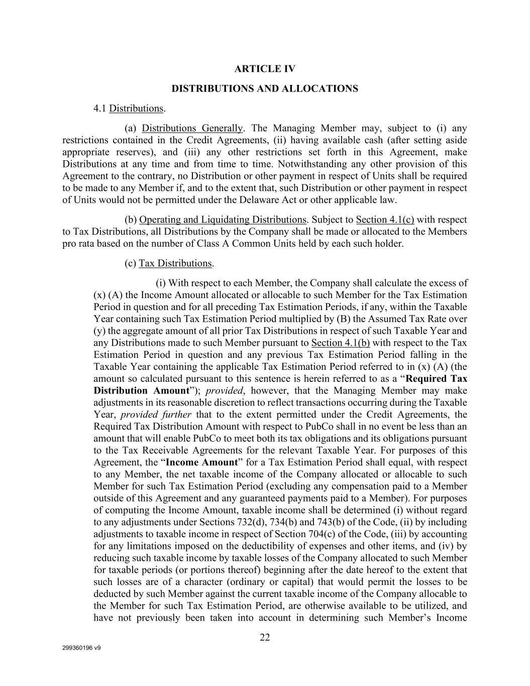 299360196 v9 22 ARTICLE IV DISTRIBUTIONS AND ALLOCATIONS 4.1 Distributions. (a) Distributions Generally. The Managing Member may, subject to (i) any restrictions contained in the Credit Agreements, (ii) having available cash (after setting aside appropriate reserves), and (iii) any other restrictions set forth in this Agreement, make Distributions at any time and from time to time. Notwithstanding any other provision of this Agreement to the contrary, no Distribution or other payment in respect of Units shall be required to be made to any Member if, and to the extent that, such Distribution or other payment in respect of Units would not be permitted under the Delaware Act or other applicable law. (b) Operating and Liquidating Distributions. Subject to Section 4.1(c) with respect to Tax Distributions, all Distributions by the Company shall be made or allocated to the Members pro rata based on the number of Class A Common Units held by each such holder. (c) Tax Distributions. (i) With respect to each Member, the Company shall calculate the excess of (x) (A) the Income Amount allocated or allocable to such Member for the Tax Estimation Period in question and for all preceding Tax Estimation Periods, if any, within the Taxable Year containing such Tax Estimation Period multiplied by (B) the Assumed Tax Rate over (y) the aggregate amount of all prior Tax Distributions in respect of such Taxable Year and any Distributions made to such Member pursuant to Section 4.1(b) with respect to the Tax Estimation Period in question and any previous Tax Estimation Period falling in the Taxable Year containing the applicable Tax Estimation Period referred to in (x) (A) (the amount so calculated pursuant to this sentence is herein referred to as a “Required Tax Distribution Amount”); provided, however, that the Managing Member may make adjustments in its reasonable discretion to reflect transactions occurring during the Taxable Year, provided further that to the extent permitted under the Credit Agreements, the Required Tax Distribution Amount with respect to PubCo shall in no event be less than an amount that will enable PubCo to meet both its tax obligations and its obligations pursuant to the Tax Receivable Agreements for the relevant Taxable Year. For purposes of this Agreement, the “Income Amount” for a Tax Estimation Period shall equal, with respect to any Member, the net taxable income of the Company allocated or allocable to such Member for such Tax Estimation Period (excluding any compensation paid to a Member outside of this Agreement and any guaranteed payments paid to a Member). For purposes of computing the Income Amount, taxable income shall be determined (i) without regard to any adjustments under Sections 732(d), 734(b) and 743(b) of the Code, (ii) by including adjustments to taxable income in respect of Section 704(c) of the Code, (iii) by accounting for any limitations imposed on the deductibility of expenses and other items, and (iv) by reducing such taxable income by taxable losses of the Company allocated to such Member for taxable periods (or portions thereof) beginning after the date hereof to the extent that such losses are of a character (ordinary or capital) that would permit the losses to be deducted by such Member against the current taxable income of the Company allocable to the Member for such Tax Estimation Period, are otherwise available to be utilized, and have not previously been taken into account in determining such Member’s Income