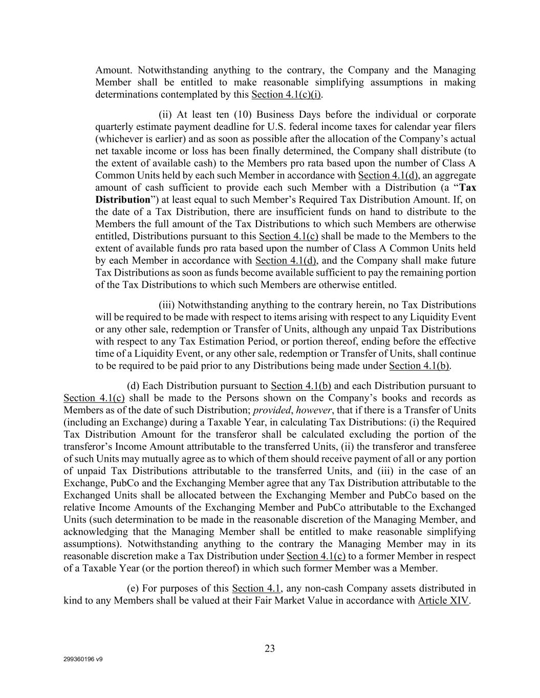 299360196 v9 23 Amount. Notwithstanding anything to the contrary, the Company and the Managing Member shall be entitled to make reasonable simplifying assumptions in making determinations contemplated by this Section 4.1(c)(i). (ii) At least ten (10) Business Days before the individual or corporate quarterly estimate payment deadline for U.S. federal income taxes for calendar year filers (whichever is earlier) and as soon as possible after the allocation of the Company’s actual net taxable income or loss has been finally determined, the Company shall distribute (to the extent of available cash) to the Members pro rata based upon the number of Class A Common Units held by each such Member in accordance with Section 4.1(d), an aggregate amount of cash sufficient to provide each such Member with a Distribution (a “Tax Distribution”) at least equal to such Member’s Required Tax Distribution Amount. If, on the date of a Tax Distribution, there are insufficient funds on hand to distribute to the Members the full amount of the Tax Distributions to which such Members are otherwise entitled, Distributions pursuant to this Section 4.1(c) shall be made to the Members to the extent of available funds pro rata based upon the number of Class A Common Units held by each Member in accordance with Section 4.1(d), and the Company shall make future Tax Distributions as soon as funds become available sufficient to pay the remaining portion of the Tax Distributions to which such Members are otherwise entitled. (iii) Notwithstanding anything to the contrary herein, no Tax Distributions will be required to be made with respect to items arising with respect to any Liquidity Event or any other sale, redemption or Transfer of Units, although any unpaid Tax Distributions with respect to any Tax Estimation Period, or portion thereof, ending before the effective time of a Liquidity Event, or any other sale, redemption or Transfer of Units, shall continue to be required to be paid prior to any Distributions being made under Section 4.1(b). (d) Each Distribution pursuant to Section 4.1(b) and each Distribution pursuant to Section 4.1(c) shall be made to the Persons shown on the Company’s books and records as Members as of the date of such Distribution; provided, however, that if there is a Transfer of Units (including an Exchange) during a Taxable Year, in calculating Tax Distributions: (i) the Required Tax Distribution Amount for the transferor shall be calculated excluding the portion of the transferor’s Income Amount attributable to the transferred Units, (ii) the transferor and transferee of such Units may mutually agree as to which of them should receive payment of all or any portion of unpaid Tax Distributions attributable to the transferred Units, and (iii) in the case of an Exchange, PubCo and the Exchanging Member agree that any Tax Distribution attributable to the Exchanged Units shall be allocated between the Exchanging Member and PubCo based on the relative Income Amounts of the Exchanging Member and PubCo attributable to the Exchanged Units (such determination to be made in the reasonable discretion of the Managing Member, and acknowledging that the Managing Member shall be entitled to make reasonable simplifying assumptions). Notwithstanding anything to the contrary the Managing Member may in its reasonable discretion make a Tax Distribution under Section 4.1(c) to a former Member in respect of a Taxable Year (or the portion thereof) in which such former Member was a Member. (e) For purposes of this Section 4.1, any non-cash Company assets distributed in kind to any Members shall be valued at their Fair Market Value in accordance with Article XIV.