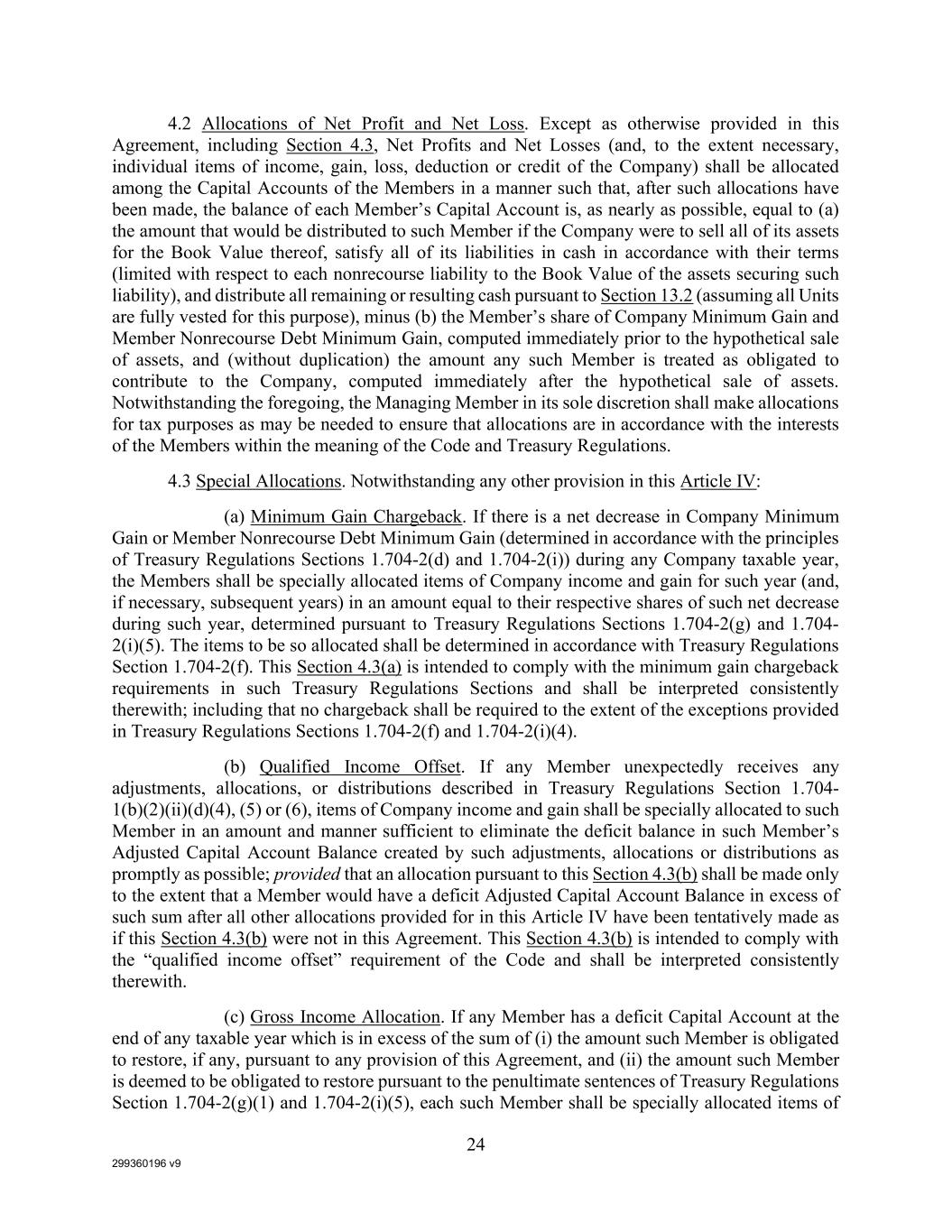 299360196 v9 24 4.2 Allocations of Net Profit and Net Loss. Except as otherwise provided in this Agreement, including Section 4.3, Net Profits and Net Losses (and, to the extent necessary, individual items of income, gain, loss, deduction or credit of the Company) shall be allocated among the Capital Accounts of the Members in a manner such that, after such allocations have been made, the balance of each Member’s Capital Account is, as nearly as possible, equal to (a) the amount that would be distributed to such Member if the Company were to sell all of its assets for the Book Value thereof, satisfy all of its liabilities in cash in accordance with their terms (limited with respect to each nonrecourse liability to the Book Value of the assets securing such liability), and distribute all remaining or resulting cash pursuant to Section 13.2 (assuming all Units are fully vested for this purpose), minus (b) the Member’s share of Company Minimum Gain and Member Nonrecourse Debt Minimum Gain, computed immediately prior to the hypothetical sale of assets, and (without duplication) the amount any such Member is treated as obligated to contribute to the Company, computed immediately after the hypothetical sale of assets. Notwithstanding the foregoing, the Managing Member in its sole discretion shall make allocations for tax purposes as may be needed to ensure that allocations are in accordance with the interests of the Members within the meaning of the Code and Treasury Regulations. 4.3 Special Allocations. Notwithstanding any other provision in this Article IV: (a) Minimum Gain Chargeback. If there is a net decrease in Company Minimum Gain or Member Nonrecourse Debt Minimum Gain (determined in accordance with the principles of Treasury Regulations Sections 1.704-2(d) and 1.704-2(i)) during any Company taxable year, the Members shall be specially allocated items of Company income and gain for such year (and, if necessary, subsequent years) in an amount equal to their respective shares of such net decrease during such year, determined pursuant to Treasury Regulations Sections 1.704-2(g) and 1.704- 2(i)(5). The items to be so allocated shall be determined in accordance with Treasury Regulations Section 1.704-2(f). This Section 4.3(a) is intended to comply with the minimum gain chargeback requirements in such Treasury Regulations Sections and shall be interpreted consistently therewith; including that no chargeback shall be required to the extent of the exceptions provided in Treasury Regulations Sections 1.704-2(f) and 1.704-2(i)(4). (b) Qualified Income Offset. If any Member unexpectedly receives any adjustments, allocations, or distributions described in Treasury Regulations Section 1.704- 1(b)(2)(ii)(d)(4), (5) or (6), items of Company income and gain shall be specially allocated to such Member in an amount and manner sufficient to eliminate the deficit balance in such Member’s Adjusted Capital Account Balance created by such adjustments, allocations or distributions as promptly as possible; provided that an allocation pursuant to this Section 4.3(b) shall be made only to the extent that a Member would have a deficit Adjusted Capital Account Balance in excess of such sum after all other allocations provided for in this Article IV have been tentatively made as if this Section 4.3(b) were not in this Agreement. This Section 4.3(b) is intended to comply with the “qualified income offset” requirement of the Code and shall be interpreted consistently therewith. (c) Gross Income Allocation. If any Member has a deficit Capital Account at the end of any taxable year which is in excess of the sum of (i) the amount such Member is obligated to restore, if any, pursuant to any provision of this Agreement, and (ii) the amount such Member is deemed to be obligated to restore pursuant to the penultimate sentences of Treasury Regulations Section 1.704-2(g)(1) and 1.704-2(i)(5), each such Member shall be specially allocated items of