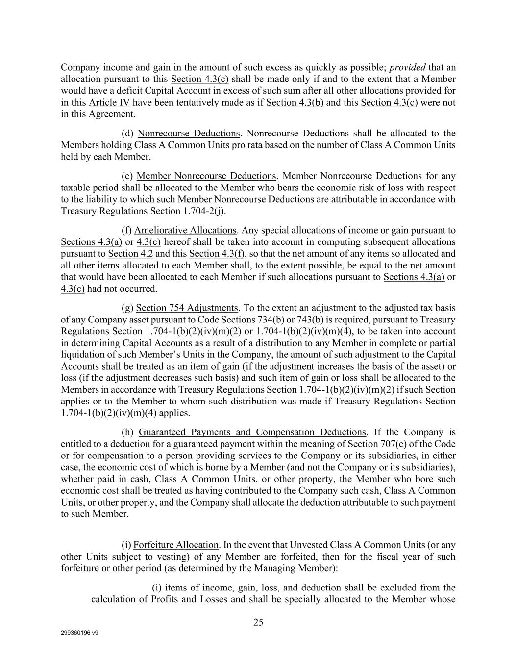 299360196 v9 25 Company income and gain in the amount of such excess as quickly as possible; provided that an allocation pursuant to this Section 4.3(c) shall be made only if and to the extent that a Member would have a deficit Capital Account in excess of such sum after all other allocations provided for in this Article IV have been tentatively made as if Section 4.3(b) and this Section 4.3(c) were not in this Agreement. (d) Nonrecourse Deductions. Nonrecourse Deductions shall be allocated to the Members holding Class A Common Units pro rata based on the number of Class A Common Units held by each Member. (e) Member Nonrecourse Deductions. Member Nonrecourse Deductions for any taxable period shall be allocated to the Member who bears the economic risk of loss with respect to the liability to which such Member Nonrecourse Deductions are attributable in accordance with Treasury Regulations Section 1.704-2(j). (f) Ameliorative Allocations. Any special allocations of income or gain pursuant to Sections 4.3(a) or 4.3(c) hereof shall be taken into account in computing subsequent allocations pursuant to Section 4.2 and this Section 4.3(f), so that the net amount of any items so allocated and all other items allocated to each Member shall, to the extent possible, be equal to the net amount that would have been allocated to each Member if such allocations pursuant to Sections 4.3(a) or 4.3(c) had not occurred. (g) Section 754 Adjustments. To the extent an adjustment to the adjusted tax basis of any Company asset pursuant to Code Sections 734(b) or 743(b) is required, pursuant to Treasury Regulations Section 1.704-1(b)(2)(iv)(m)(2) or 1.704-1(b)(2)(iv)(m)(4), to be taken into account in determining Capital Accounts as a result of a distribution to any Member in complete or partial liquidation of such Member’s Units in the Company, the amount of such adjustment to the Capital Accounts shall be treated as an item of gain (if the adjustment increases the basis of the asset) or loss (if the adjustment decreases such basis) and such item of gain or loss shall be allocated to the Members in accordance with Treasury Regulations Section 1.704-1(b)(2)(iv)(m)(2) if such Section applies or to the Member to whom such distribution was made if Treasury Regulations Section 1.704-1(b)(2)(iv)(m)(4) applies. (h) Guaranteed Payments and Compensation Deductions. If the Company is entitled to a deduction for a guaranteed payment within the meaning of Section 707(c) of the Code or for compensation to a person providing services to the Company or its subsidiaries, in either case, the economic cost of which is borne by a Member (and not the Company or its subsidiaries), whether paid in cash, Class A Common Units, or other property, the Member who bore such economic cost shall be treated as having contributed to the Company such cash, Class A Common Units, or other property, and the Company shall allocate the deduction attributable to such payment to such Member. (i) Forfeiture Allocation. In the event that Unvested Class A Common Units (or any other Units subject to vesting) of any Member are forfeited, then for the fiscal year of such forfeiture or other period (as determined by the Managing Member): (i) items of income, gain, loss, and deduction shall be excluded from the calculation of Profits and Losses and shall be specially allocated to the Member whose