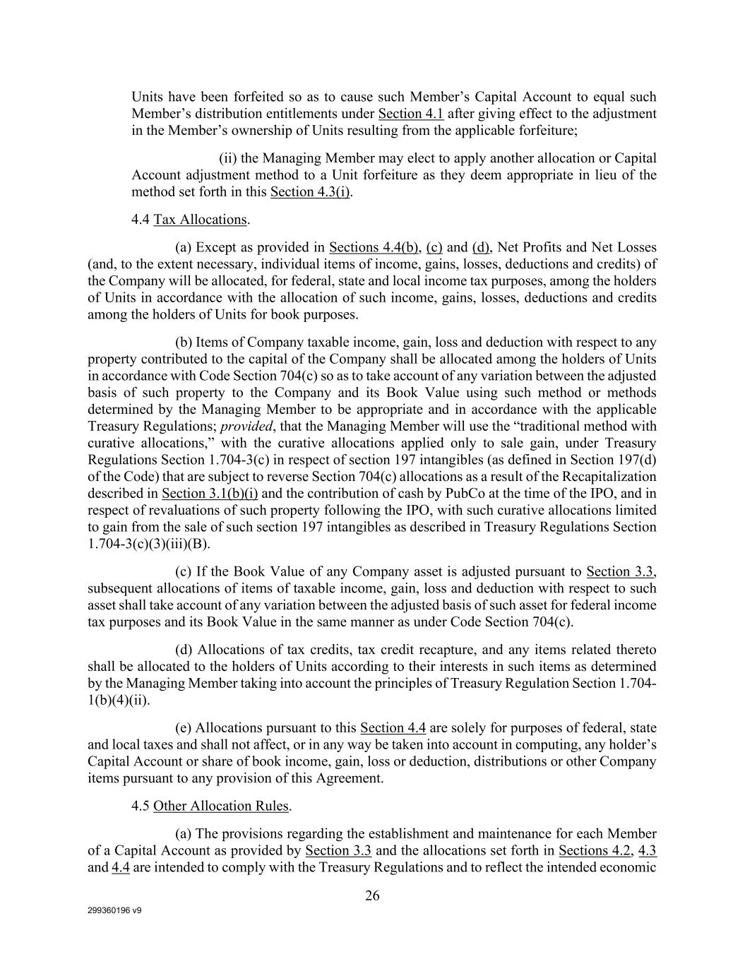 299360196 v9 26 Units have been forfeited so as to cause such Member’s Capital Account to equal such Member’s distribution entitlements under Section 4.1 after giving effect to the adjustment in the Member’s ownership of Units resulting from the applicable forfeiture; (ii) the Managing Member may elect to apply another allocation or Capital Account adjustment method to a Unit forfeiture as they deem appropriate in lieu of the method set forth in this Section 4.3(i). 4.4 Tax Allocations. (a) Except as provided in Sections 4.4(b), (c) and (d), Net Profits and Net Losses (and, to the extent necessary, individual items of income, gains, losses, deductions and credits) of the Company will be allocated, for federal, state and local income tax purposes, among the holders of Units in accordance with the allocation of such income, gains, losses, deductions and credits among the holders of Units for book purposes. (b) Items of Company taxable income, gain, loss and deduction with respect to any property contributed to the capital of the Company shall be allocated among the holders of Units in accordance with Code Section 704(c) so as to take account of any variation between the adjusted basis of such property to the Company and its Book Value using such method or methods determined by the Managing Member to be appropriate and in accordance with the applicable Treasury Regulations; provided, that the Managing Member will use the “traditional method with curative allocations,” with the curative allocations applied only to sale gain, under Treasury Regulations Section 1.704-3(c) in respect of section 197 intangibles (as defined in Section 197(d) of the Code) that are subject to reverse Section 704(c) allocations as a result of the Recapitalization described in Section 3.1(b)(i) and the contribution of cash by PubCo at the time of the IPO, and in respect of revaluations of such property following the IPO, with such curative allocations limited to gain from the sale of such section 197 intangibles as described in Treasury Regulations Section 1.704-3(c)(3)(iii)(B). (c) If the Book Value of any Company asset is adjusted pursuant to Section 3.3, subsequent allocations of items of taxable income, gain, loss and deduction with respect to such asset shall take account of any variation between the adjusted basis of such asset for federal income tax purposes and its Book Value in the same manner as under Code Section 704(c). (d) Allocations of tax credits, tax credit recapture, and any items related thereto shall be allocated to the holders of Units according to their interests in such items as determined by the Managing Member taking into account the principles of Treasury Regulation Section 1.704- 1(b)(4)(ii). (e) Allocations pursuant to this Section 4.4 are solely for purposes of federal, state and local taxes and shall not affect, or in any way be taken into account in computing, any holder’s Capital Account or share of book income, gain, loss or deduction, distributions or other Company items pursuant to any provision of this Agreement. 4.5 Other Allocation Rules. (a) The provisions regarding the establishment and maintenance for each Member of a Capital Account as provided by Section 3.3 and the allocations set forth in Sections 4.2, 4.3 and 4.4 are intended to comply with the Treasury Regulations and to reflect the intended economic