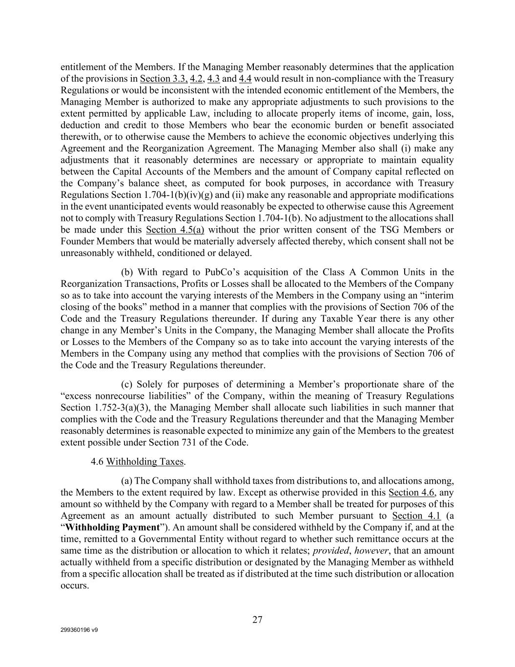 299360196 v9 27 entitlement of the Members. If the Managing Member reasonably determines that the application of the provisions in Section 3.3, 4.2, 4.3 and 4.4 would result in non-compliance with the Treasury Regulations or would be inconsistent with the intended economic entitlement of the Members, the Managing Member is authorized to make any appropriate adjustments to such provisions to the extent permitted by applicable Law, including to allocate properly items of income, gain, loss, deduction and credit to those Members who bear the economic burden or benefit associated therewith, or to otherwise cause the Members to achieve the economic objectives underlying this Agreement and the Reorganization Agreement. The Managing Member also shall (i) make any adjustments that it reasonably determines are necessary or appropriate to maintain equality between the Capital Accounts of the Members and the amount of Company capital reflected on the Company’s balance sheet, as computed for book purposes, in accordance with Treasury Regulations Section 1.704-1(b)(iv)(g) and (ii) make any reasonable and appropriate modifications in the event unanticipated events would reasonably be expected to otherwise cause this Agreement not to comply with Treasury Regulations Section 1.704-1(b). No adjustment to the allocations shall be made under this Section 4.5(a) without the prior written consent of the TSG Members or Founder Members that would be materially adversely affected thereby, which consent shall not be unreasonably withheld, conditioned or delayed. (b) With regard to PubCo’s acquisition of the Class A Common Units in the Reorganization Transactions, Profits or Losses shall be allocated to the Members of the Company so as to take into account the varying interests of the Members in the Company using an “interim closing of the books” method in a manner that complies with the provisions of Section 706 of the Code and the Treasury Regulations thereunder. If during any Taxable Year there is any other change in any Member’s Units in the Company, the Managing Member shall allocate the Profits or Losses to the Members of the Company so as to take into account the varying interests of the Members in the Company using any method that complies with the provisions of Section 706 of the Code and the Treasury Regulations thereunder. (c) Solely for purposes of determining a Member’s proportionate share of the “excess nonrecourse liabilities” of the Company, within the meaning of Treasury Regulations Section 1.752-3(a)(3), the Managing Member shall allocate such liabilities in such manner that complies with the Code and the Treasury Regulations thereunder and that the Managing Member reasonably determines is reasonable expected to minimize any gain of the Members to the greatest extent possible under Section 731 of the Code. 4.6 Withholding Taxes. (a) The Company shall withhold taxes from distributions to, and allocations among, the Members to the extent required by law. Except as otherwise provided in this Section 4.6, any amount so withheld by the Company with regard to a Member shall be treated for purposes of this Agreement as an amount actually distributed to such Member pursuant to Section 4.1 (a “Withholding Payment”). An amount shall be considered withheld by the Company if, and at the time, remitted to a Governmental Entity without regard to whether such remittance occurs at the same time as the distribution or allocation to which it relates; provided, however, that an amount actually withheld from a specific distribution or designated by the Managing Member as withheld from a specific allocation shall be treated as if distributed at the time such distribution or allocation occurs.