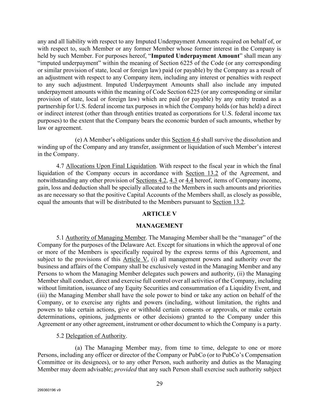 299360196 v9 29 any and all liability with respect to any Imputed Underpayment Amounts required on behalf of, or with respect to, such Member or any former Member whose former interest in the Company is held by such Member. For purposes hereof, “Imputed Underpayment Amount” shall mean any “imputed underpayment” within the meaning of Section 6225 of the Code (or any corresponding or similar provision of state, local or foreign law) paid (or payable) by the Company as a result of an adjustment with respect to any Company item, including any interest or penalties with respect to any such adjustment. Imputed Underpayment Amounts shall also include any imputed underpayment amounts within the meaning of Code Section 6225 (or any corresponding or similar provision of state, local or foreign law) which are paid (or payable) by any entity treated as a partnership for U.S. federal income tax purposes in which the Company holds (or has held) a direct or indirect interest (other than through entities treated as corporations for U.S. federal income tax purposes) to the extent that the Company bears the economic burden of such amounts, whether by law or agreement. (e) A Member’s obligations under this Section 4.6 shall survive the dissolution and winding up of the Company and any transfer, assignment or liquidation of such Member’s interest in the Company. 4.7 Allocations Upon Final Liquidation. With respect to the fiscal year in which the final liquidation of the Company occurs in accordance with Section 13.2 of the Agreement, and notwithstanding any other provision of Sections 4.2, 4.3 or 4.4 hereof, items of Company income, gain, loss and deduction shall be specially allocated to the Members in such amounts and priorities as are necessary so that the positive Capital Accounts of the Members shall, as closely as possible, equal the amounts that will be distributed to the Members pursuant to Section 13.2. ARTICLE V MANAGEMENT 5.1 Authority of Managing Member. The Managing Member shall be the “manager” of the Company for the purposes of the Delaware Act. Except for situations in which the approval of one or more of the Members is specifically required by the express terms of this Agreement, and subject to the provisions of this Article V, (i) all management powers and authority over the business and affairs of the Company shall be exclusively vested in the Managing Member and any Persons to whom the Managing Member delegates such powers and authority, (ii) the Managing Member shall conduct, direct and exercise full control over all activities of the Company, including without limitation, issuance of any Equity Securities and consummation of a Liquidity Event, and (iii) the Managing Member shall have the sole power to bind or take any action on behalf of the Company, or to exercise any rights and powers (including, without limitation, the rights and powers to take certain actions, give or withhold certain consents or approvals, or make certain determinations, opinions, judgments or other decisions) granted to the Company under this Agreement or any other agreement, instrument or other document to which the Company is a party. 5.2 Delegation of Authority. (a) The Managing Member may, from time to time, delegate to one or more Persons, including any officer or director of the Company or PubCo (or to PubCo’s Compensation Committee or its designees), or to any other Person, such authority and duties as the Managing Member may deem advisable; provided that any such Person shall exercise such authority subject