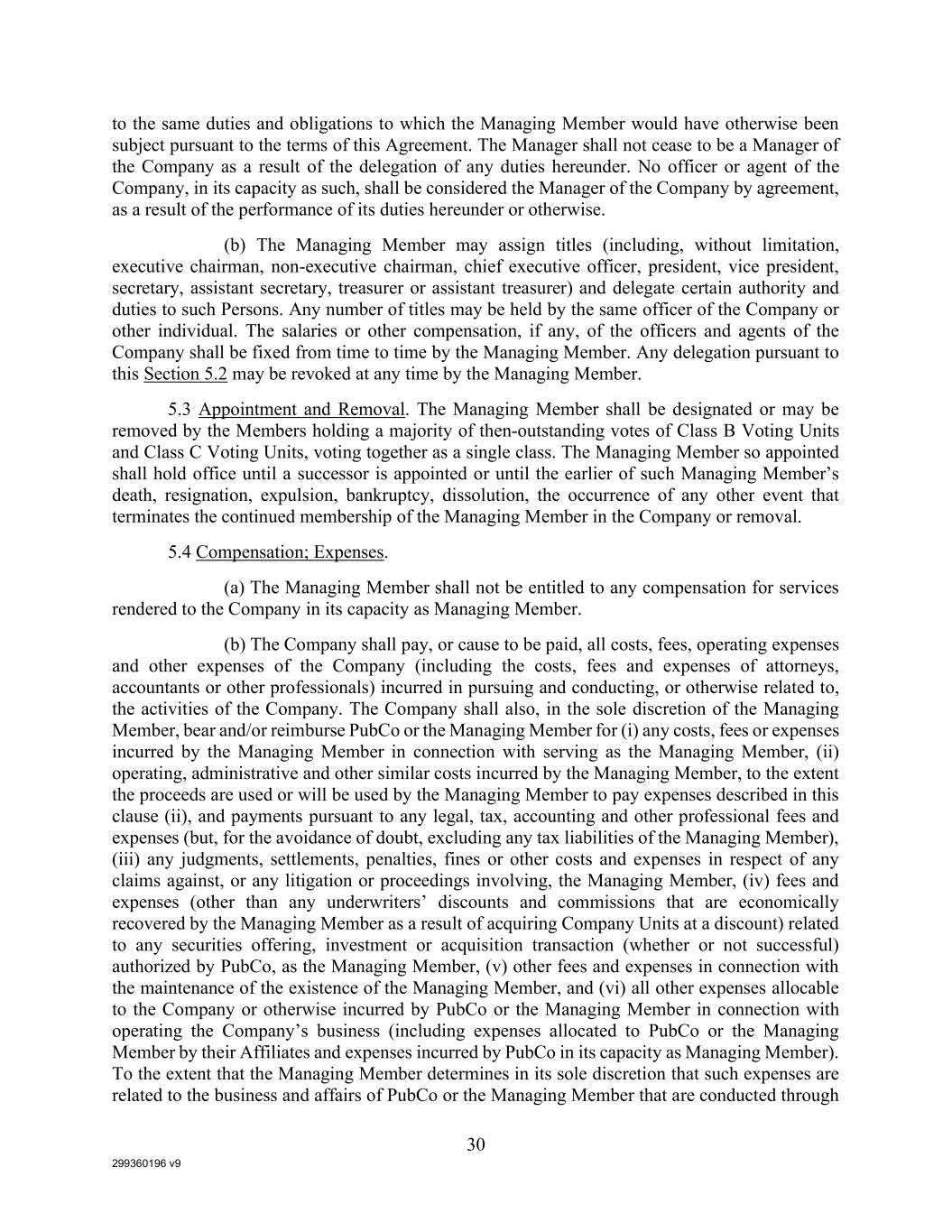 299360196 v9 30 to the same duties and obligations to which the Managing Member would have otherwise been subject pursuant to the terms of this Agreement. The Manager shall not cease to be a Manager of the Company as a result of the delegation of any duties hereunder. No officer or agent of the Company, in its capacity as such, shall be considered the Manager of the Company by agreement, as a result of the performance of its duties hereunder or otherwise. (b) The Managing Member may assign titles (including, without limitation, executive chairman, non-executive chairman, chief executive officer, president, vice president, secretary, assistant secretary, treasurer or assistant treasurer) and delegate certain authority and duties to such Persons. Any number of titles may be held by the same officer of the Company or other individual. The salaries or other compensation, if any, of the officers and agents of the Company shall be fixed from time to time by the Managing Member. Any delegation pursuant to this Section 5.2 may be revoked at any time by the Managing Member. 5.3 Appointment and Removal. The Managing Member shall be designated or may be removed by the Members holding a majority of then-outstanding votes of Class B Voting Units and Class C Voting Units, voting together as a single class. The Managing Member so appointed shall hold office until a successor is appointed or until the earlier of such Managing Member’s death, resignation, expulsion, bankruptcy, dissolution, the occurrence of any other event that terminates the continued membership of the Managing Member in the Company or removal. 5.4 Compensation; Expenses. (a) The Managing Member shall not be entitled to any compensation for services rendered to the Company in its capacity as Managing Member. (b) The Company shall pay, or cause to be paid, all costs, fees, operating expenses and other expenses of the Company (including the costs, fees and expenses of attorneys, accountants or other professionals) incurred in pursuing and conducting, or otherwise related to, the activities of the Company. The Company shall also, in the sole discretion of the Managing Member, bear and/or reimburse PubCo or the Managing Member for (i) any costs, fees or expenses incurred by the Managing Member in connection with serving as the Managing Member, (ii) operating, administrative and other similar costs incurred by the Managing Member, to the extent the proceeds are used or will be used by the Managing Member to pay expenses described in this clause (ii), and payments pursuant to any legal, tax, accounting and other professional fees and expenses (but, for the avoidance of doubt, excluding any tax liabilities of the Managing Member), (iii) any judgments, settlements, penalties, fines or other costs and expenses in respect of any claims against, or any litigation or proceedings involving, the Managing Member, (iv) fees and expenses (other than any underwriters’ discounts and commissions that are economically recovered by the Managing Member as a result of acquiring Company Units at a discount) related to any securities offering, investment or acquisition transaction (whether or not successful) authorized by PubCo, as the Managing Member, (v) other fees and expenses in connection with the maintenance of the existence of the Managing Member, and (vi) all other expenses allocable to the Company or otherwise incurred by PubCo or the Managing Member in connection with operating the Company’s business (including expenses allocated to PubCo or the Managing Member by their Affiliates and expenses incurred by PubCo in its capacity as Managing Member). To the extent that the Managing Member determines in its sole discretion that such expenses are related to the business and affairs of PubCo or the Managing Member that are conducted through