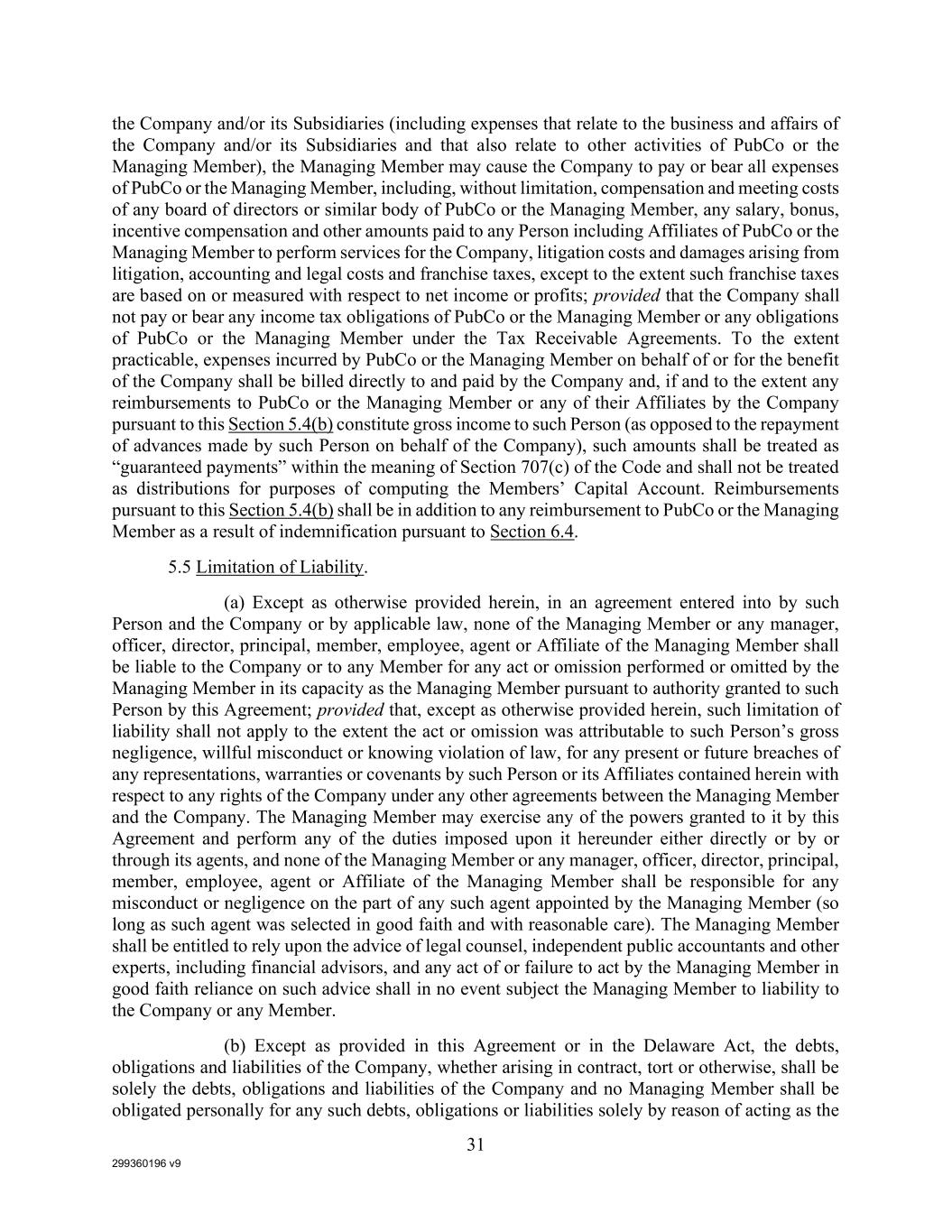 299360196 v9 31 the Company and/or its Subsidiaries (including expenses that relate to the business and affairs of the Company and/or its Subsidiaries and that also relate to other activities of PubCo or the Managing Member), the Managing Member may cause the Company to pay or bear all expenses of PubCo or the Managing Member, including, without limitation, compensation and meeting costs of any board of directors or similar body of PubCo or the Managing Member, any salary, bonus, incentive compensation and other amounts paid to any Person including Affiliates of PubCo or the Managing Member to perform services for the Company, litigation costs and damages arising from litigation, accounting and legal costs and franchise taxes, except to the extent such franchise taxes are based on or measured with respect to net income or profits; provided that the Company shall not pay or bear any income tax obligations of PubCo or the Managing Member or any obligations of PubCo or the Managing Member under the Tax Receivable Agreements. To the extent practicable, expenses incurred by PubCo or the Managing Member on behalf of or for the benefit of the Company shall be billed directly to and paid by the Company and, if and to the extent any reimbursements to PubCo or the Managing Member or any of their Affiliates by the Company pursuant to this Section 5.4(b) constitute gross income to such Person (as opposed to the repayment of advances made by such Person on behalf of the Company), such amounts shall be treated as “guaranteed payments” within the meaning of Section 707(c) of the Code and shall not be treated as distributions for purposes of computing the Members’ Capital Account. Reimbursements pursuant to this Section 5.4(b) shall be in addition to any reimbursement to PubCo or the Managing Member as a result of indemnification pursuant to Section 6.4. 5.5 Limitation of Liability. (a) Except as otherwise provided herein, in an agreement entered into by such Person and the Company or by applicable law, none of the Managing Member or any manager, officer, director, principal, member, employee, agent or Affiliate of the Managing Member shall be liable to the Company or to any Member for any act or omission performed or omitted by the Managing Member in its capacity as the Managing Member pursuant to authority granted to such Person by this Agreement; provided that, except as otherwise provided herein, such limitation of liability shall not apply to the extent the act or omission was attributable to such Person’s gross negligence, willful misconduct or knowing violation of law, for any present or future breaches of any representations, warranties or covenants by such Person or its Affiliates contained herein with respect to any rights of the Company under any other agreements between the Managing Member and the Company. The Managing Member may exercise any of the powers granted to it by this Agreement and perform any of the duties imposed upon it hereunder either directly or by or through its agents, and none of the Managing Member or any manager, officer, director, principal, member, employee, agent or Affiliate of the Managing Member shall be responsible for any misconduct or negligence on the part of any such agent appointed by the Managing Member (so long as such agent was selected in good faith and with reasonable care). The Managing Member shall be entitled to rely upon the advice of legal counsel, independent public accountants and other experts, including financial advisors, and any act of or failure to act by the Managing Member in good faith reliance on such advice shall in no event subject the Managing Member to liability to the Company or any Member. (b) Except as provided in this Agreement or in the Delaware Act, the debts, obligations and liabilities of the Company, whether arising in contract, tort or otherwise, shall be solely the debts, obligations and liabilities of the Company and no Managing Member shall be obligated personally for any such debts, obligations or liabilities solely by reason of acting as the