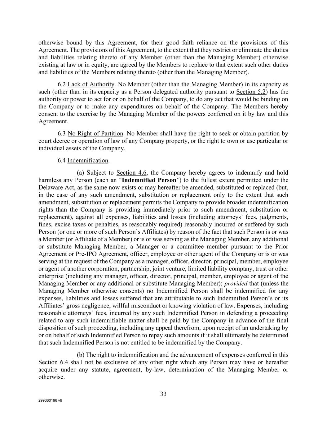 299360196 v9 33 otherwise bound by this Agreement, for their good faith reliance on the provisions of this Agreement. The provisions of this Agreement, to the extent that they restrict or eliminate the duties and liabilities relating thereto of any Member (other than the Managing Member) otherwise existing at law or in equity, are agreed by the Members to replace to that extent such other duties and liabilities of the Members relating thereto (other than the Managing Member). 6.2 Lack of Authority. No Member (other than the Managing Member) in its capacity as such (other than in its capacity as a Person delegated authority pursuant to Section 5.2) has the authority or power to act for or on behalf of the Company, to do any act that would be binding on the Company or to make any expenditures on behalf of the Company. The Members hereby consent to the exercise by the Managing Member of the powers conferred on it by law and this Agreement. 6.3 No Right of Partition. No Member shall have the right to seek or obtain partition by court decree or operation of law of any Company property, or the right to own or use particular or individual assets of the Company. 6.4 Indemnification. (a) Subject to Section 4.6, the Company hereby agrees to indemnify and hold harmless any Person (each an “Indemnified Person”) to the fullest extent permitted under the Delaware Act, as the same now exists or may hereafter be amended, substituted or replaced (but, in the case of any such amendment, substitution or replacement only to the extent that such amendment, substitution or replacement permits the Company to provide broader indemnification rights than the Company is providing immediately prior to such amendment, substitution or replacement), against all expenses, liabilities and losses (including attorneys’ fees, judgments, fines, excise taxes or penalties, as reasonably required) reasonably incurred or suffered by such Person (or one or more of such Person’s Affiliates) by reason of the fact that such Person is or was a Member (or Affiliate of a Member) or is or was serving as the Managing Member, any additional or substitute Managing Member, a Manager or a committee member pursuant to the Prior Agreement or Pre-IPO Agreement, officer, employee or other agent of the Company or is or was serving at the request of the Company as a manager, officer, director, principal, member, employee or agent of another corporation, partnership, joint venture, limited liability company, trust or other enterprise (including any manager, officer, director, principal, member, employee or agent of the Managing Member or any additional or substitute Managing Member); provided that (unless the Managing Member otherwise consents) no Indemnified Person shall be indemnified for any expenses, liabilities and losses suffered that are attributable to such Indemnified Person’s or its Affiliates’ gross negligence, willful misconduct or knowing violation of law. Expenses, including reasonable attorneys’ fees, incurred by any such Indemnified Person in defending a proceeding related to any such indemnifiable matter shall be paid by the Company in advance of the final disposition of such proceeding, including any appeal therefrom, upon receipt of an undertaking by or on behalf of such Indemnified Person to repay such amounts if it shall ultimately be determined that such Indemnified Person is not entitled to be indemnified by the Company. (b) The right to indemnification and the advancement of expenses conferred in this Section 6.4 shall not be exclusive of any other right which any Person may have or hereafter acquire under any statute, agreement, by-law, determination of the Managing Member or otherwise.