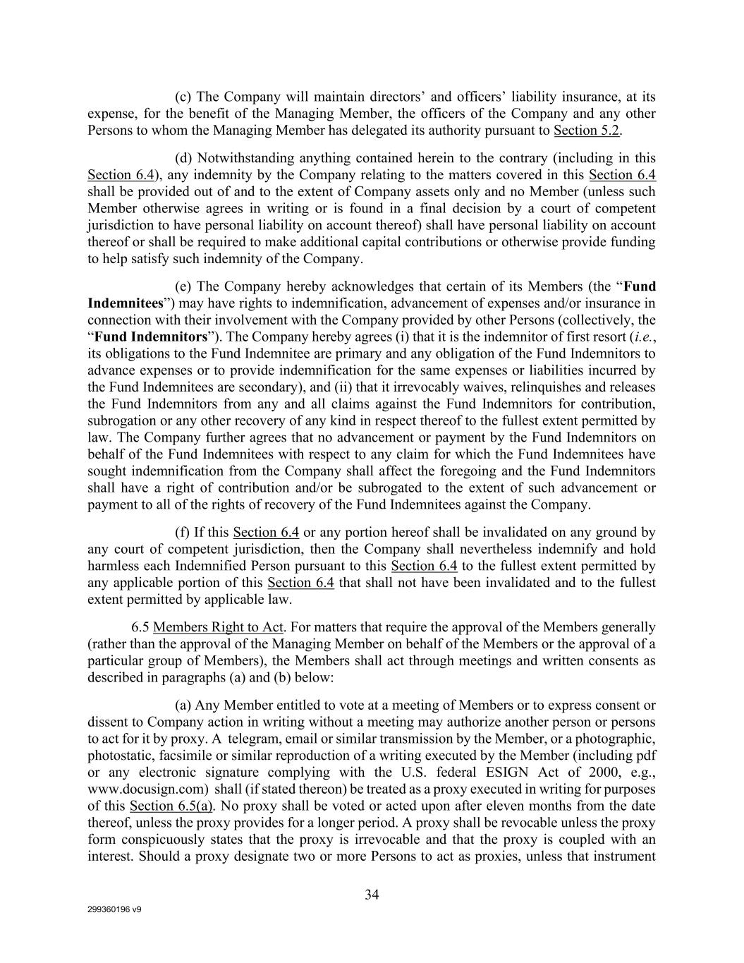 299360196 v9 34 (c) The Company will maintain directors’ and officers’ liability insurance, at its expense, for the benefit of the Managing Member, the officers of the Company and any other Persons to whom the Managing Member has delegated its authority pursuant to Section 5.2. (d) Notwithstanding anything contained herein to the contrary (including in this Section 6.4), any indemnity by the Company relating to the matters covered in this Section 6.4 shall be provided out of and to the extent of Company assets only and no Member (unless such Member otherwise agrees in writing or is found in a final decision by a court of competent jurisdiction to have personal liability on account thereof) shall have personal liability on account thereof or shall be required to make additional capital contributions or otherwise provide funding to help satisfy such indemnity of the Company. (e) The Company hereby acknowledges that certain of its Members (the “Fund Indemnitees”) may have rights to indemnification, advancement of expenses and/or insurance in connection with their involvement with the Company provided by other Persons (collectively, the “Fund Indemnitors”). The Company hereby agrees (i) that it is the indemnitor of first resort (i.e., its obligations to the Fund Indemnitee are primary and any obligation of the Fund Indemnitors to advance expenses or to provide indemnification for the same expenses or liabilities incurred by the Fund Indemnitees are secondary), and (ii) that it irrevocably waives, relinquishes and releases the Fund Indemnitors from any and all claims against the Fund Indemnitors for contribution, subrogation or any other recovery of any kind in respect thereof to the fullest extent permitted by law. The Company further agrees that no advancement or payment by the Fund Indemnitors on behalf of the Fund Indemnitees with respect to any claim for which the Fund Indemnitees have sought indemnification from the Company shall affect the foregoing and the Fund Indemnitors shall have a right of contribution and/or be subrogated to the extent of such advancement or payment to all of the rights of recovery of the Fund Indemnitees against the Company. (f) If this Section 6.4 or any portion hereof shall be invalidated on any ground by any court of competent jurisdiction, then the Company shall nevertheless indemnify and hold harmless each Indemnified Person pursuant to this Section 6.4 to the fullest extent permitted by any applicable portion of this Section 6.4 that shall not have been invalidated and to the fullest extent permitted by applicable law. 6.5 Members Right to Act. For matters that require the approval of the Members generally (rather than the approval of the Managing Member on behalf of the Members or the approval of a particular group of Members), the Members shall act through meetings and written consents as described in paragraphs (a) and (b) below: (a) Any Member entitled to vote at a meeting of Members or to express consent or dissent to Company action in writing without a meeting may authorize another person or persons to act for it by proxy. A telegram, email or similar transmission by the Member, or a photographic, photostatic, facsimile or similar reproduction of a writing executed by the Member (including pdf or any electronic signature complying with the U.S. federal ESIGN Act of 2000, e.g., www.docusign.com) shall (if stated thereon) be treated as a proxy executed in writing for purposes of this Section 6.5(a). No proxy shall be voted or acted upon after eleven months from the date thereof, unless the proxy provides for a longer period. A proxy shall be revocable unless the proxy form conspicuously states that the proxy is irrevocable and that the proxy is coupled with an interest. Should a proxy designate two or more Persons to act as proxies, unless that instrument