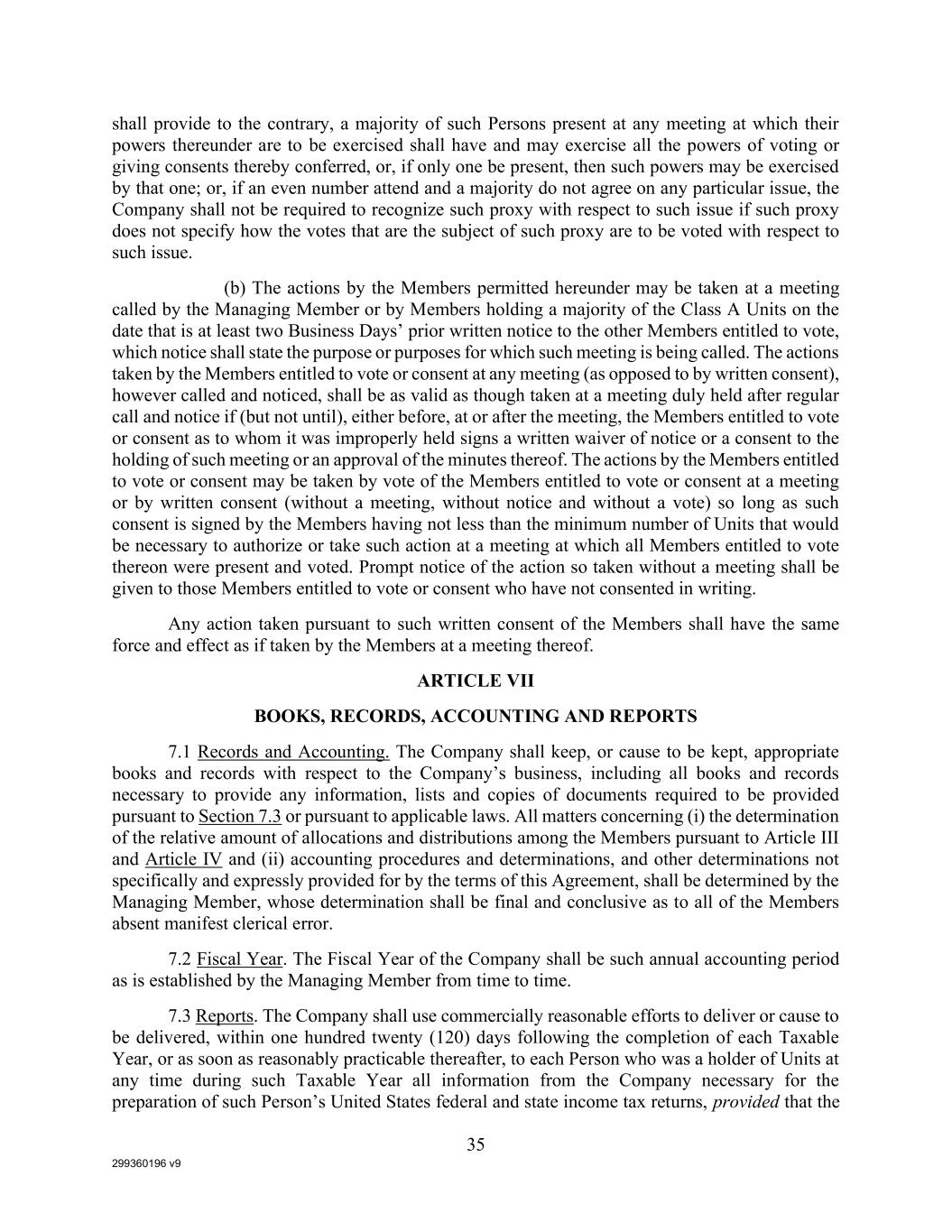 299360196 v9 35 shall provide to the contrary, a majority of such Persons present at any meeting at which their powers thereunder are to be exercised shall have and may exercise all the powers of voting or giving consents thereby conferred, or, if only one be present, then such powers may be exercised by that one; or, if an even number attend and a majority do not agree on any particular issue, the Company shall not be required to recognize such proxy with respect to such issue if such proxy does not specify how the votes that are the subject of such proxy are to be voted with respect to such issue. (b) The actions by the Members permitted hereunder may be taken at a meeting called by the Managing Member or by Members holding a majority of the Class A Units on the date that is at least two Business Days’ prior written notice to the other Members entitled to vote, which notice shall state the purpose or purposes for which such meeting is being called. The actions taken by the Members entitled to vote or consent at any meeting (as opposed to by written consent), however called and noticed, shall be as valid as though taken at a meeting duly held after regular call and notice if (but not until), either before, at or after the meeting, the Members entitled to vote or consent as to whom it was improperly held signs a written waiver of notice or a consent to the holding of such meeting or an approval of the minutes thereof. The actions by the Members entitled to vote or consent may be taken by vote of the Members entitled to vote or consent at a meeting or by written consent (without a meeting, without notice and without a vote) so long as such consent is signed by the Members having not less than the minimum number of Units that would be necessary to authorize or take such action at a meeting at which all Members entitled to vote thereon were present and voted. Prompt notice of the action so taken without a meeting shall be given to those Members entitled to vote or consent who have not consented in writing. Any action taken pursuant to such written consent of the Members shall have the same force and effect as if taken by the Members at a meeting thereof. ARTICLE VII BOOKS, RECORDS, ACCOUNTING AND REPORTS 7.1 Records and Accounting. The Company shall keep, or cause to be kept, appropriate books and records with respect to the Company’s business, including all books and records necessary to provide any information, lists and copies of documents required to be provided pursuant to Section 7.3 or pursuant to applicable laws. All matters concerning (i) the determination of the relative amount of allocations and distributions among the Members pursuant to Article III and Article IV and (ii) accounting procedures and determinations, and other determinations not specifically and expressly provided for by the terms of this Agreement, shall be determined by the Managing Member, whose determination shall be final and conclusive as to all of the Members absent manifest clerical error. 7.2 Fiscal Year. The Fiscal Year of the Company shall be such annual accounting period as is established by the Managing Member from time to time. 7.3 Reports. The Company shall use commercially reasonable efforts to deliver or cause to be delivered, within one hundred twenty (120) days following the completion of each Taxable Year, or as soon as reasonably practicable thereafter, to each Person who was a holder of Units at any time during such Taxable Year all information from the Company necessary for the preparation of such Person’s United States federal and state income tax returns, provided that the
