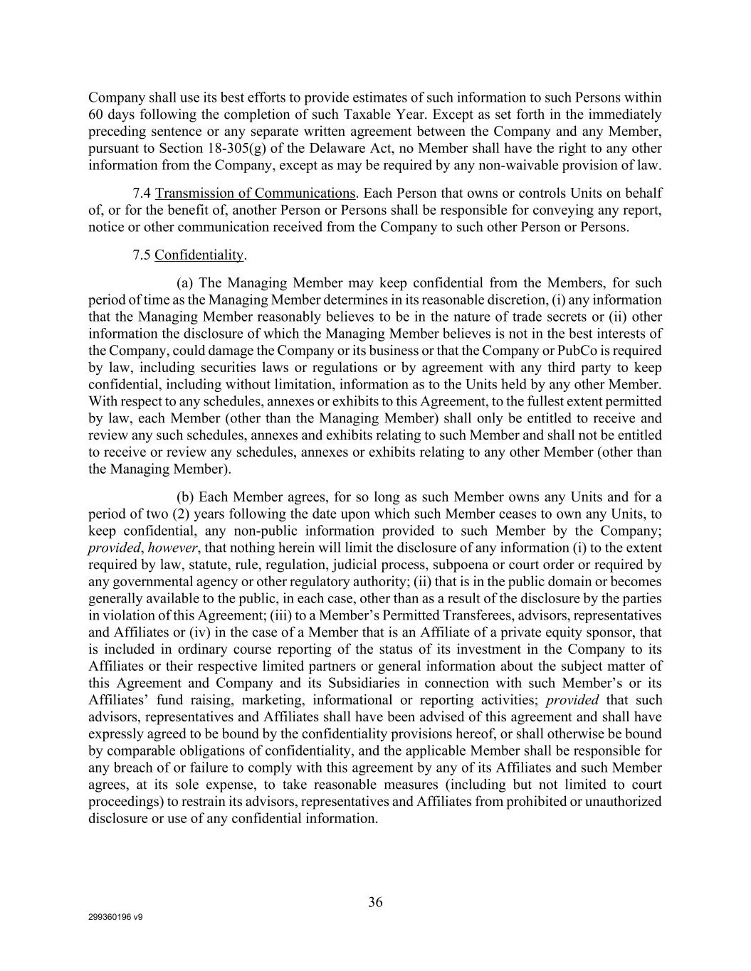 299360196 v9 36 Company shall use its best efforts to provide estimates of such information to such Persons within 60 days following the completion of such Taxable Year. Except as set forth in the immediately preceding sentence or any separate written agreement between the Company and any Member, pursuant to Section 18-305(g) of the Delaware Act, no Member shall have the right to any other information from the Company, except as may be required by any non-waivable provision of law. 7.4 Transmission of Communications. Each Person that owns or controls Units on behalf of, or for the benefit of, another Person or Persons shall be responsible for conveying any report, notice or other communication received from the Company to such other Person or Persons. 7.5 Confidentiality. (a) The Managing Member may keep confidential from the Members, for such period of time as the Managing Member determines in its reasonable discretion, (i) any information that the Managing Member reasonably believes to be in the nature of trade secrets or (ii) other information the disclosure of which the Managing Member believes is not in the best interests of the Company, could damage the Company or its business or that the Company or PubCo is required by law, including securities laws or regulations or by agreement with any third party to keep confidential, including without limitation, information as to the Units held by any other Member. With respect to any schedules, annexes or exhibits to this Agreement, to the fullest extent permitted by law, each Member (other than the Managing Member) shall only be entitled to receive and review any such schedules, annexes and exhibits relating to such Member and shall not be entitled to receive or review any schedules, annexes or exhibits relating to any other Member (other than the Managing Member). (b) Each Member agrees, for so long as such Member owns any Units and for a period of two (2) years following the date upon which such Member ceases to own any Units, to keep confidential, any non-public information provided to such Member by the Company; provided, however, that nothing herein will limit the disclosure of any information (i) to the extent required by law, statute, rule, regulation, judicial process, subpoena or court order or required by any governmental agency or other regulatory authority; (ii) that is in the public domain or becomes generally available to the public, in each case, other than as a result of the disclosure by the parties in violation of this Agreement; (iii) to a Member’s Permitted Transferees, advisors, representatives and Affiliates or (iv) in the case of a Member that is an Affiliate of a private equity sponsor, that is included in ordinary course reporting of the status of its investment in the Company to its Affiliates or their respective limited partners or general information about the subject matter of this Agreement and Company and its Subsidiaries in connection with such Member’s or its Affiliates’ fund raising, marketing, informational or reporting activities; provided that such advisors, representatives and Affiliates shall have been advised of this agreement and shall have expressly agreed to be bound by the confidentiality provisions hereof, or shall otherwise be bound by comparable obligations of confidentiality, and the applicable Member shall be responsible for any breach of or failure to comply with this agreement by any of its Affiliates and such Member agrees, at its sole expense, to take reasonable measures (including but not limited to court proceedings) to restrain its advisors, representatives and Affiliates from prohibited or unauthorized disclosure or use of any confidential information.
