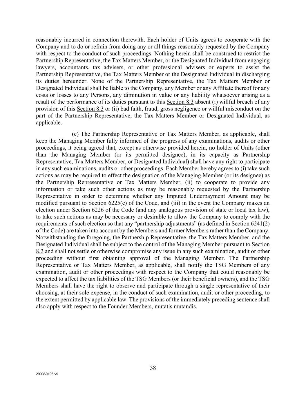 299360196 v9 38 reasonably incurred in connection therewith. Each holder of Units agrees to cooperate with the Company and to do or refrain from doing any or all things reasonably requested by the Company with respect to the conduct of such proceedings. Nothing herein shall be construed to restrict the Partnership Representative, the Tax Matters Member, or the Designated Individual from engaging lawyers, accountants, tax advisers, or other professional advisers or experts to assist the Partnership Representative, the Tax Matters Member or the Designated Individual in discharging its duties hereunder. None of the Partnership Representative, the Tax Matters Member or Designated Individual shall be liable to the Company, any Member or any Affiliate thereof for any costs or losses to any Persons, any diminution in value or any liability whatsoever arising as a result of the performance of its duties pursuant to this Section 8.3 absent (i) willful breach of any provision of this Section 8.3 or (ii) bad faith, fraud, gross negligence or willful misconduct on the part of the Partnership Representative, the Tax Matters Member or Designated Individual, as applicable. (c) The Partnership Representative or Tax Matters Member, as applicable, shall keep the Managing Member fully informed of the progress of any examinations, audits or other proceedings, it being agreed that, except as otherwise provided herein, no holder of Units (other than the Managing Member (or its permitted designee), in its capacity as Partnership Representative, Tax Matters Member, or Designated Individual) shall have any right to participate in any such examinations, audits or other proceedings. Each Member hereby agrees to (i) take such actions as may be required to effect the designation of the Managing Member (or its designee) as the Partnership Representative or Tax Matters Member, (ii) to cooperate to provide any information or take such other actions as may be reasonably requested by the Partnership Representative in order to determine whether any Imputed Underpayment Amount may be modified pursuant to Section 6225(c) of the Code, and (iii) in the event the Company makes an election under Section 6226 of the Code (and any analogous provision of state or local tax law), to take such actions as may be necessary or desirable to allow the Company to comply with the requirements of such election so that any “partnership adjustments” (as defined in Section 6241(2) of the Code) are taken into account by the Members and former Members rather than the Company. Notwithstanding the foregoing, the Partnership Representative, the Tax Matters Member, and the Designated Individual shall be subject to the control of the Managing Member pursuant to Section 8.2 and shall not settle or otherwise compromise any issue in any such examination, audit or other proceeding without first obtaining approval of the Managing Member. The Partnership Representative or Tax Matters Member, as applicable, shall notify the TSG Members of any examination, audit or other proceedings with respect to the Company that could reasonably be expected to affect the tax liabilities of the TSG Members (or their beneficial owners), and the TSG Members shall have the right to observe and participate through a single representative of their choosing, at their sole expense, in the conduct of such examination, audit or other proceeding, to the extent permitted by applicable law. The provisions of the immediately preceding sentence shall also apply with respect to the Founder Members, mutatis mutandis.