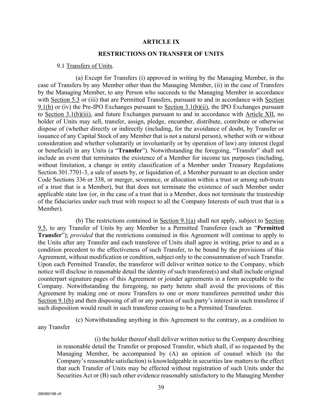 299360196 v9 39 ARTICLE IX RESTRICTIONS ON TRANSFER OF UNITS 9.1 Transfers of Units. (a) Except for Transfers (i) approved in writing by the Managing Member, in the case of Transfers by any Member other than the Managing Member, (ii) in the case of Transfers by the Managing Member, to any Person who succeeds to the Managing Member in accordance with Section 5.3 or (iii) that are Permitted Transfers, pursuant to and in accordance with Section 9.1(b) or (iv) the Pre-IPO Exchanges pursuant to Section 3.1(b)(ii), the IPO Exchanges pursuant to Section 3.1(b)(iii), and future Exchanges pursuant to and in accordance with Article XII, no holder of Units may sell, transfer, assign, pledge, encumber, distribute, contribute or otherwise dispose of (whether directly or indirectly (including, for the avoidance of doubt, by Transfer or issuance of any Capital Stock of any Member that is not a natural person), whether with or without consideration and whether voluntarily or involuntarily or by operation of law) any interest (legal or beneficial) in any Units (a “Transfer”). Notwithstanding the foregoing, “Transfer” shall not include an event that terminates the existence of a Member for income tax purposes (including, without limitation, a change in entity classification of a Member under Treasury Regulations Section 301.7701-3, a sale of assets by, or liquidation of, a Member pursuant to an election under Code Sections 336 or 338, or merger, severance, or allocation within a trust or among sub-trusts of a trust that is a Member), but that does not terminate the existence of such Member under applicable state law (or, in the case of a trust that is a Member, does not terminate the trusteeship of the fiduciaries under such trust with respect to all the Company Interests of such trust that is a Member). (b) The restrictions contained in Section 9.1(a) shall not apply, subject to Section 9.5, to any Transfer of Units by any Member to a Permitted Transferee (each an “Permitted Transfer”); provided that the restrictions contained in this Agreement will continue to apply to the Units after any Transfer and each transferee of Units shall agree in writing, prior to and as a condition precedent to the effectiveness of such Transfer, to be bound by the provisions of this Agreement, without modification or condition, subject only to the consummation of such Transfer. Upon each Permitted Transfer, the transferor will deliver written notice to the Company, which notice will disclose in reasonable detail the identity of such transferee(s) and shall include original counterpart signature pages of this Agreement or joinder agreements in a form acceptable to the Company. Notwithstanding the foregoing, no party hereto shall avoid the provisions of this Agreement by making one or more Transfers to one or more transferees permitted under this Section 9.1(b) and then disposing of all or any portion of such party’s interest in such transferee if such disposition would result in such transferee ceasing to be a Permitted Transferee. (c) Notwithstanding anything in this Agreement to the contrary, as a condition to any Transfer (i) the holder thereof shall deliver written notice to the Company describing in reasonable detail the Transfer or proposed Transfer, which shall, if so requested by the Managing Member, be accompanied by (A) an opinion of counsel which (to the Company’s reasonable satisfaction) is knowledgeable in securities law matters to the effect that such Transfer of Units may be effected without registration of such Units under the Securities Act or (B) such other evidence reasonably satisfactory to the Managing Member
