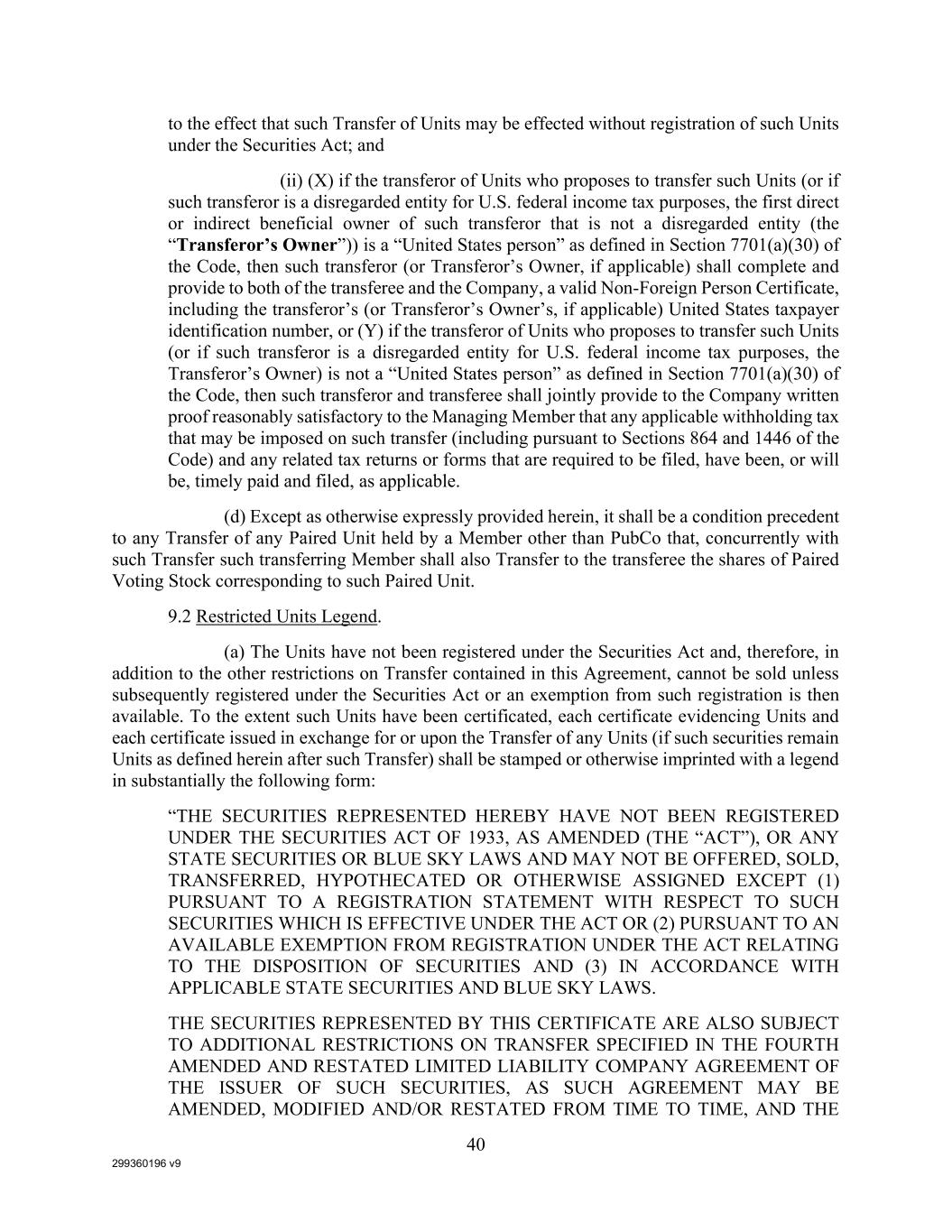 299360196 v9 40 to the effect that such Transfer of Units may be effected without registration of such Units under the Securities Act; and (ii) (X) if the transferor of Units who proposes to transfer such Units (or if such transferor is a disregarded entity for U.S. federal income tax purposes, the first direct or indirect beneficial owner of such transferor that is not a disregarded entity (the “Transferor’s Owner”)) is a “United States person” as defined in Section 7701(a)(30) of the Code, then such transferor (or Transferor’s Owner, if applicable) shall complete and provide to both of the transferee and the Company, a valid Non-Foreign Person Certificate, including the transferor’s (or Transferor’s Owner’s, if applicable) United States taxpayer identification number, or (Y) if the transferor of Units who proposes to transfer such Units (or if such transferor is a disregarded entity for U.S. federal income tax purposes, the Transferor’s Owner) is not a “United States person” as defined in Section 7701(a)(30) of the Code, then such transferor and transferee shall jointly provide to the Company written proof reasonably satisfactory to the Managing Member that any applicable withholding tax that may be imposed on such transfer (including pursuant to Sections 864 and 1446 of the Code) and any related tax returns or forms that are required to be filed, have been, or will be, timely paid and filed, as applicable. (d) Except as otherwise expressly provided herein, it shall be a condition precedent to any Transfer of any Paired Unit held by a Member other than PubCo that, concurrently with such Transfer such transferring Member shall also Transfer to the transferee the shares of Paired Voting Stock corresponding to such Paired Unit. 9.2 Restricted Units Legend. (a) The Units have not been registered under the Securities Act and, therefore, in addition to the other restrictions on Transfer contained in this Agreement, cannot be sold unless subsequently registered under the Securities Act or an exemption from such registration is then available. To the extent such Units have been certificated, each certificate evidencing Units and each certificate issued in exchange for or upon the Transfer of any Units (if such securities remain Units as defined herein after such Transfer) shall be stamped or otherwise imprinted with a legend in substantially the following form: “THE SECURITIES REPRESENTED HEREBY HAVE NOT BEEN REGISTERED UNDER THE SECURITIES ACT OF 1933, AS AMENDED (THE “ACT”), OR ANY STATE SECURITIES OR BLUE SKY LAWS AND MAY NOT BE OFFERED, SOLD, TRANSFERRED, HYPOTHECATED OR OTHERWISE ASSIGNED EXCEPT (1) PURSUANT TO A REGISTRATION STATEMENT WITH RESPECT TO SUCH SECURITIES WHICH IS EFFECTIVE UNDER THE ACT OR (2) PURSUANT TO AN AVAILABLE EXEMPTION FROM REGISTRATION UNDER THE ACT RELATING TO THE DISPOSITION OF SECURITIES AND (3) IN ACCORDANCE WITH APPLICABLE STATE SECURITIES AND BLUE SKY LAWS. THE SECURITIES REPRESENTED BY THIS CERTIFICATE ARE ALSO SUBJECT TO ADDITIONAL RESTRICTIONS ON TRANSFER SPECIFIED IN THE FOURTH AMENDED AND RESTATED LIMITED LIABILITY COMPANY AGREEMENT OF THE ISSUER OF SUCH SECURITIES, AS SUCH AGREEMENT MAY BE AMENDED, MODIFIED AND/OR RESTATED FROM TIME TO TIME, AND THE
