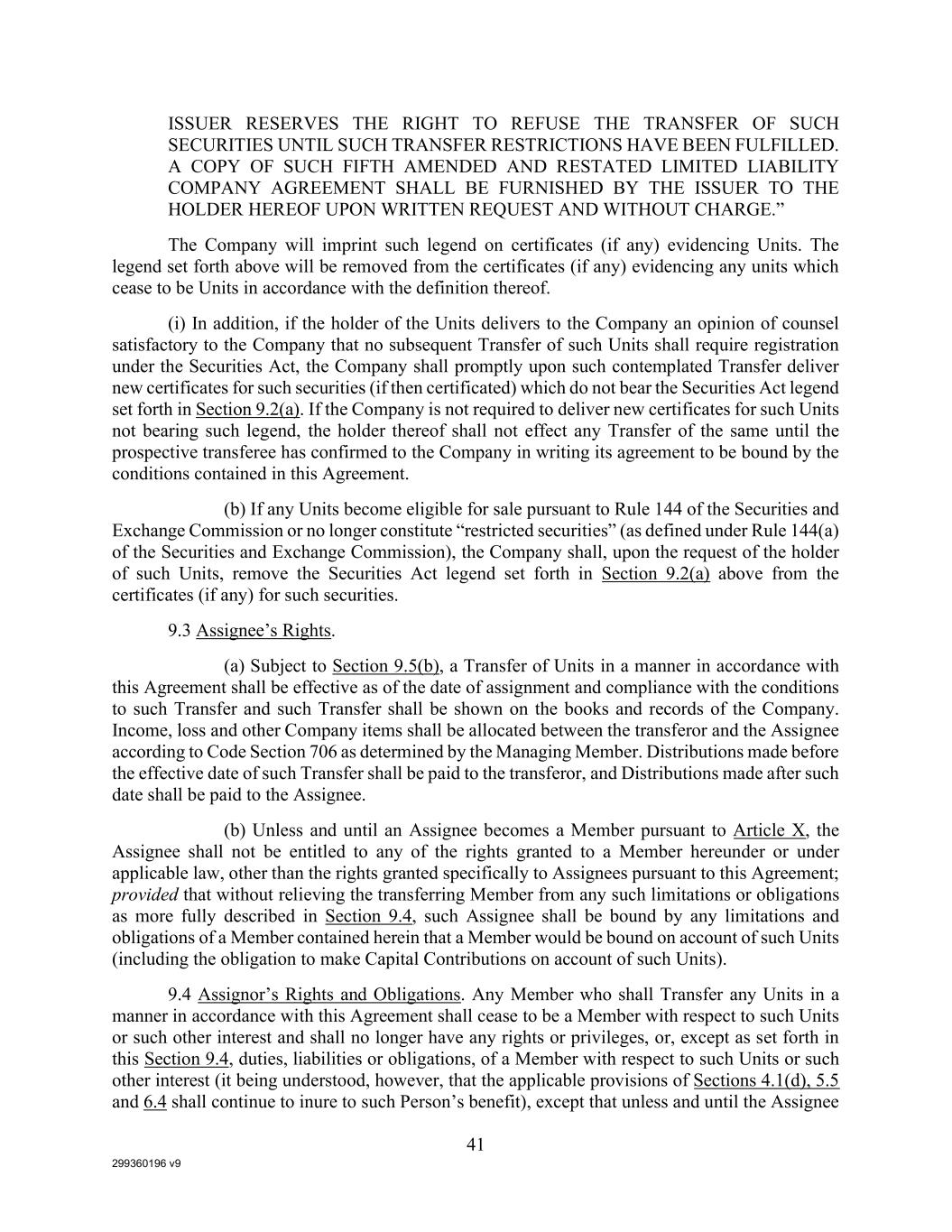 299360196 v9 41 ISSUER RESERVES THE RIGHT TO REFUSE THE TRANSFER OF SUCH SECURITIES UNTIL SUCH TRANSFER RESTRICTIONS HAVE BEEN FULFILLED. A COPY OF SUCH FIFTH AMENDED AND RESTATED LIMITED LIABILITY COMPANY AGREEMENT SHALL BE FURNISHED BY THE ISSUER TO THE HOLDER HEREOF UPON WRITTEN REQUEST AND WITHOUT CHARGE.” The Company will imprint such legend on certificates (if any) evidencing Units. The legend set forth above will be removed from the certificates (if any) evidencing any units which cease to be Units in accordance with the definition thereof. (i) In addition, if the holder of the Units delivers to the Company an opinion of counsel satisfactory to the Company that no subsequent Transfer of such Units shall require registration under the Securities Act, the Company shall promptly upon such contemplated Transfer deliver new certificates for such securities (if then certificated) which do not bear the Securities Act legend set forth in Section 9.2(a). If the Company is not required to deliver new certificates for such Units not bearing such legend, the holder thereof shall not effect any Transfer of the same until the prospective transferee has confirmed to the Company in writing its agreement to be bound by the conditions contained in this Agreement. (b) If any Units become eligible for sale pursuant to Rule 144 of the Securities and Exchange Commission or no longer constitute “restricted securities” (as defined under Rule 144(a) of the Securities and Exchange Commission), the Company shall, upon the request of the holder of such Units, remove the Securities Act legend set forth in Section 9.2(a) above from the certificates (if any) for such securities. 9.3 Assignee’s Rights. (a) Subject to Section 9.5(b), a Transfer of Units in a manner in accordance with this Agreement shall be effective as of the date of assignment and compliance with the conditions to such Transfer and such Transfer shall be shown on the books and records of the Company. Income, loss and other Company items shall be allocated between the transferor and the Assignee according to Code Section 706 as determined by the Managing Member. Distributions made before the effective date of such Transfer shall be paid to the transferor, and Distributions made after such date shall be paid to the Assignee. (b) Unless and until an Assignee becomes a Member pursuant to Article X, the Assignee shall not be entitled to any of the rights granted to a Member hereunder or under applicable law, other than the rights granted specifically to Assignees pursuant to this Agreement; provided that without relieving the transferring Member from any such limitations or obligations as more fully described in Section 9.4, such Assignee shall be bound by any limitations and obligations of a Member contained herein that a Member would be bound on account of such Units (including the obligation to make Capital Contributions on account of such Units). 9.4 Assignor’s Rights and Obligations. Any Member who shall Transfer any Units in a manner in accordance with this Agreement shall cease to be a Member with respect to such Units or such other interest and shall no longer have any rights or privileges, or, except as set forth in this Section 9.4, duties, liabilities or obligations, of a Member with respect to such Units or such other interest (it being understood, however, that the applicable provisions of Sections 4.1(d), 5.5 and 6.4 shall continue to inure to such Person’s benefit), except that unless and until the Assignee