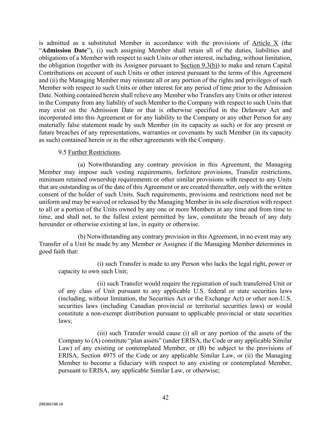 299360196 v9 42 is admitted as a substituted Member in accordance with the provisions of Article X (the “Admission Date”), (i) such assigning Member shall retain all of the duties, liabilities and obligations of a Member with respect to such Units or other interest, including, without limitation, the obligation (together with its Assignee pursuant to Section 9.3(b)) to make and return Capital Contributions on account of such Units or other interest pursuant to the terms of this Agreement and (ii) the Managing Member may reinstate all or any portion of the rights and privileges of such Member with respect to such Units or other interest for any period of time prior to the Admission Date. Nothing contained herein shall relieve any Member who Transfers any Units or other interest in the Company from any liability of such Member to the Company with respect to such Units that may exist on the Admission Date or that is otherwise specified in the Delaware Act and incorporated into this Agreement or for any liability to the Company or any other Person for any materially false statement made by such Member (in its capacity as such) or for any present or future breaches of any representations, warranties or covenants by such Member (in its capacity as such) contained herein or in the other agreements with the Company. 9.5 Further Restrictions. (a) Notwithstanding any contrary provision in this Agreement, the Managing Member may impose such vesting requirements, forfeiture provisions, Transfer restrictions, minimum retained ownership requirements or other similar provisions with respect to any Units that are outstanding as of the date of this Agreement or are created thereafter, only with the written consent of the holder of such Units. Such requirements, provisions and restrictions need not be uniform and may be waived or released by the Managing Member in its sole discretion with respect to all or a portion of the Units owned by any one or more Members at any time and from time to time, and shall not, to the fullest extent permitted by law, constitute the breach of any duty hereunder or otherwise existing at law, in equity or otherwise. (b) Notwithstanding any contrary provision in this Agreement, in no event may any Transfer of a Unit be made by any Member or Assignee if the Managing Member determines in good faith that: (i) such Transfer is made to any Person who lacks the legal right, power or capacity to own such Unit; (ii) such Transfer would require the registration of such transferred Unit or of any class of Unit pursuant to any applicable U.S. federal or state securities laws (including, without limitation, the Securities Act or the Exchange Act) or other non-U.S. securities laws (including Canadian provincial or territorial securities laws) or would constitute a non-exempt distribution pursuant to applicable provincial or state securities laws; (iii) such Transfer would cause (i) all or any portion of the assets of the Company to (A) constitute “plan assets” (under ERISA, the Code or any applicable Similar Law) of any existing or contemplated Member, or (B) be subject to the provisions of ERISA, Section 4975 of the Code or any applicable Similar Law, or (ii) the Managing Member to become a fiduciary with respect to any existing or contemplated Member, pursuant to ERISA, any applicable Similar Law, or otherwise;