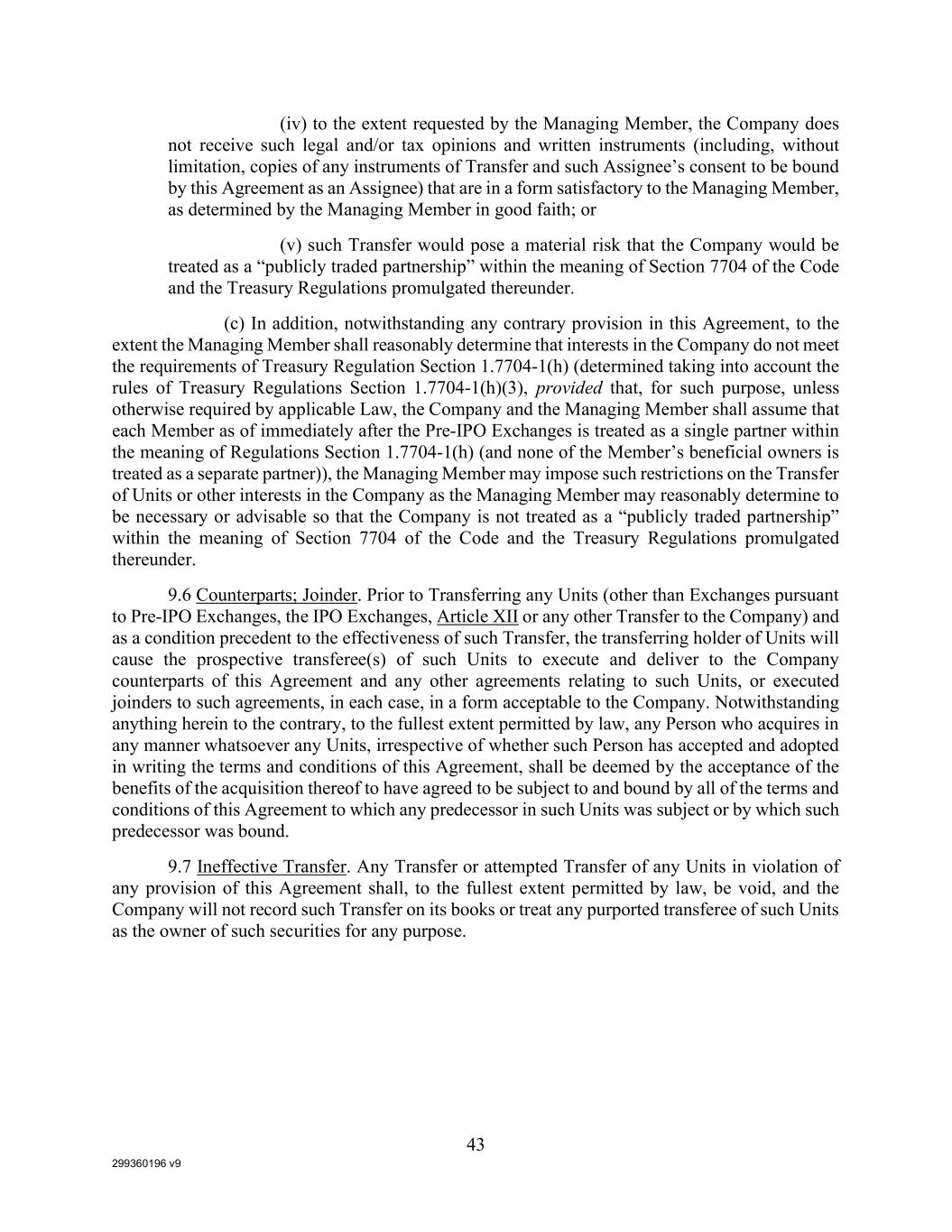 299360196 v9 43 (iv) to the extent requested by the Managing Member, the Company does not receive such legal and/or tax opinions and written instruments (including, without limitation, copies of any instruments of Transfer and such Assignee’s consent to be bound by this Agreement as an Assignee) that are in a form satisfactory to the Managing Member, as determined by the Managing Member in good faith; or (v) such Transfer would pose a material risk that the Company would be treated as a “publicly traded partnership” within the meaning of Section 7704 of the Code and the Treasury Regulations promulgated thereunder. (c) In addition, notwithstanding any contrary provision in this Agreement, to the extent the Managing Member shall reasonably determine that interests in the Company do not meet the requirements of Treasury Regulation Section 1.7704-1(h) (determined taking into account the rules of Treasury Regulations Section 1.7704-1(h)(3), provided that, for such purpose, unless otherwise required by applicable Law, the Company and the Managing Member shall assume that each Member as of immediately after the Pre-IPO Exchanges is treated as a single partner within the meaning of Regulations Section 1.7704-1(h) (and none of the Member’s beneficial owners is treated as a separate partner)), the Managing Member may impose such restrictions on the Transfer of Units or other interests in the Company as the Managing Member may reasonably determine to be necessary or advisable so that the Company is not treated as a “publicly traded partnership” within the meaning of Section 7704 of the Code and the Treasury Regulations promulgated thereunder. 9.6 Counterparts; Joinder. Prior to Transferring any Units (other than Exchanges pursuant to Pre-IPO Exchanges, the IPO Exchanges, Article XII or any other Transfer to the Company) and as a condition precedent to the effectiveness of such Transfer, the transferring holder of Units will cause the prospective transferee(s) of such Units to execute and deliver to the Company counterparts of this Agreement and any other agreements relating to such Units, or executed joinders to such agreements, in each case, in a form acceptable to the Company. Notwithstanding anything herein to the contrary, to the fullest extent permitted by law, any Person who acquires in any manner whatsoever any Units, irrespective of whether such Person has accepted and adopted in writing the terms and conditions of this Agreement, shall be deemed by the acceptance of the benefits of the acquisition thereof to have agreed to be subject to and bound by all of the terms and conditions of this Agreement to which any predecessor in such Units was subject or by which such predecessor was bound. 9.7 Ineffective Transfer. Any Transfer or attempted Transfer of any Units in violation of any provision of this Agreement shall, to the fullest extent permitted by law, be void, and the Company will not record such Transfer on its books or treat any purported transferee of such Units as the owner of such securities for any purpose.