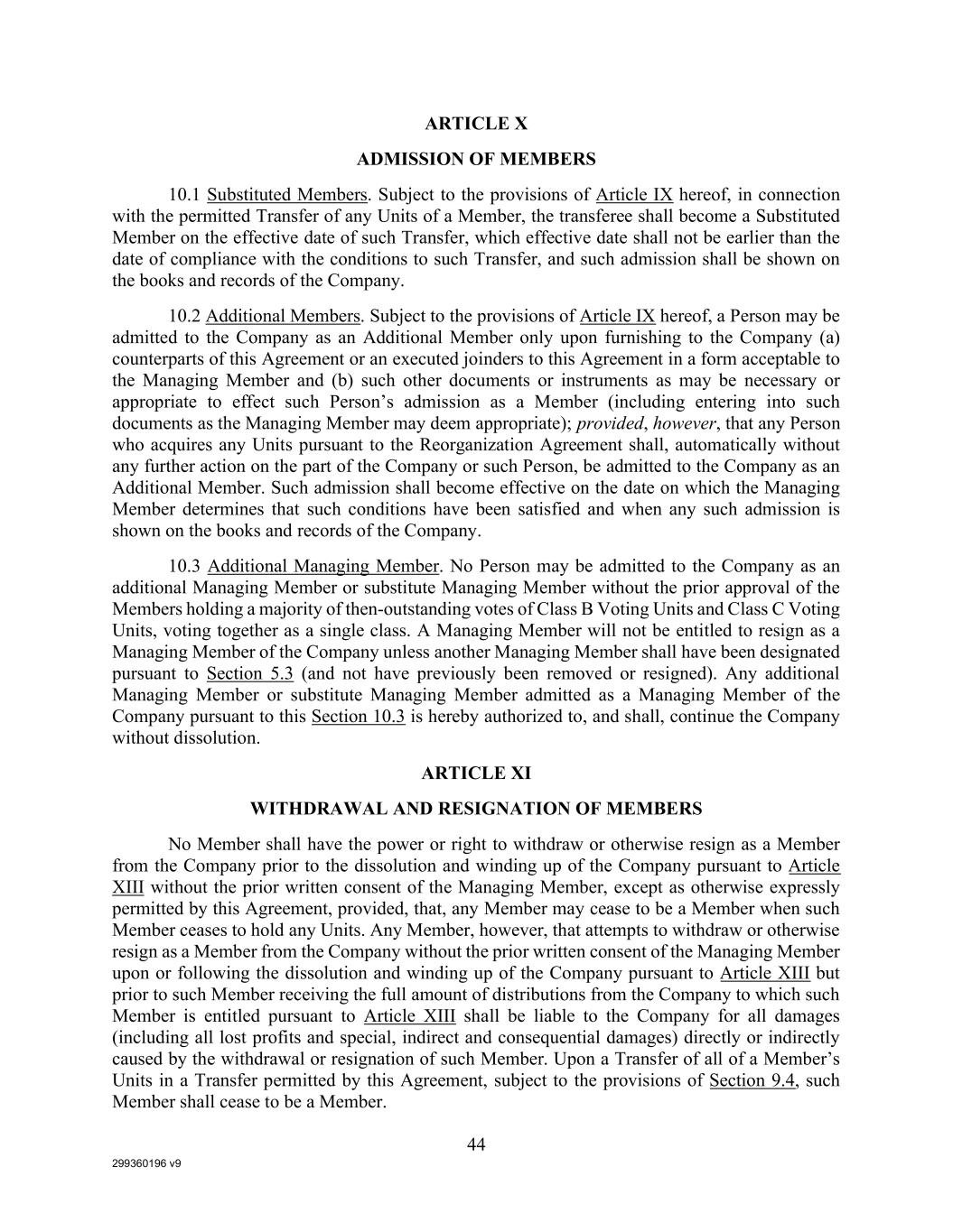 299360196 v9 44 ARTICLE X ADMISSION OF MEMBERS 10.1 Substituted Members. Subject to the provisions of Article IX hereof, in connection with the permitted Transfer of any Units of a Member, the transferee shall become a Substituted Member on the effective date of such Transfer, which effective date shall not be earlier than the date of compliance with the conditions to such Transfer, and such admission shall be shown on the books and records of the Company. 10.2 Additional Members. Subject to the provisions of Article IX hereof, a Person may be admitted to the Company as an Additional Member only upon furnishing to the Company (a) counterparts of this Agreement or an executed joinders to this Agreement in a form acceptable to the Managing Member and (b) such other documents or instruments as may be necessary or appropriate to effect such Person’s admission as a Member (including entering into such documents as the Managing Member may deem appropriate); provided, however, that any Person who acquires any Units pursuant to the Reorganization Agreement shall, automatically without any further action on the part of the Company or such Person, be admitted to the Company as an Additional Member. Such admission shall become effective on the date on which the Managing Member determines that such conditions have been satisfied and when any such admission is shown on the books and records of the Company. 10.3 Additional Managing Member. No Person may be admitted to the Company as an additional Managing Member or substitute Managing Member without the prior approval of the Members holding a majority of then-outstanding votes of Class B Voting Units and Class C Voting Units, voting together as a single class. A Managing Member will not be entitled to resign as a Managing Member of the Company unless another Managing Member shall have been designated pursuant to Section 5.3 (and not have previously been removed or resigned). Any additional Managing Member or substitute Managing Member admitted as a Managing Member of the Company pursuant to this Section 10.3 is hereby authorized to, and shall, continue the Company without dissolution. ARTICLE XI WITHDRAWAL AND RESIGNATION OF MEMBERS No Member shall have the power or right to withdraw or otherwise resign as a Member from the Company prior to the dissolution and winding up of the Company pursuant to Article XIII without the prior written consent of the Managing Member, except as otherwise expressly permitted by this Agreement, provided, that, any Member may cease to be a Member when such Member ceases to hold any Units. Any Member, however, that attempts to withdraw or otherwise resign as a Member from the Company without the prior written consent of the Managing Member upon or following the dissolution and winding up of the Company pursuant to Article XIII but prior to such Member receiving the full amount of distributions from the Company to which such Member is entitled pursuant to Article XIII shall be liable to the Company for all damages (including all lost profits and special, indirect and consequential damages) directly or indirectly caused by the withdrawal or resignation of such Member. Upon a Transfer of all of a Member’s Units in a Transfer permitted by this Agreement, subject to the provisions of Section 9.4, such Member shall cease to be a Member.