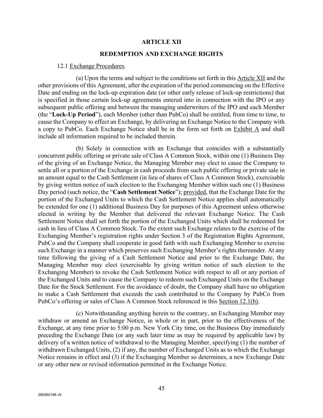 299360196 v9 45 ARTICLE XII REDEMPTION AND EXCHANGE RIGHTS 12.1 Exchange Procedures. (a) Upon the terms and subject to the conditions set forth in this Article XII and the other provisions of this Agreement, after the expiration of the period commencing on the Effective Date and ending on the lock-up expiration date (or other early release of lock-up restrictions) that is specified in those certain lock-up agreements entered into in connection with the IPO or any subsequent public offering and between the managing underwriters of the IPO and each Member (the “Lock-Up Period”), each Member (other than PubCo) shall be entitled, from time to time, to cause the Company to effect an Exchange, by delivering an Exchange Notice to the Company with a copy to PubCo. Each Exchange Notice shall be in the form set forth on Exhibit A and shall include all information required to be included therein. (b) Solely in connection with an Exchange that coincides with a substantially concurrent public offering or private sale of Class A Common Stock, within one (1) Business Day of the giving of an Exchange Notice, the Managing Member may elect to cause the Company to settle all or a portion of the Exchange in cash proceeds from such public offering or private sale in an amount equal to the Cash Settlement (in lieu of shares of Class A Common Stock), exercisable by giving written notice of such election to the Exchanging Member within such one (1) Business Day period (such notice, the “Cash Settlement Notice”); provided, that the Exchange Date for the portion of the Exchanged Units to which the Cash Settlement Notice applies shall automatically be extended for one (1) additional Business Day for purposes of this Agreement unless otherwise elected in writing by the Member that delivered the relevant Exchange Notice. The Cash Settlement Notice shall set forth the portion of the Exchanged Units which shall be redeemed for cash in lieu of Class A Common Stock. To the extent such Exchange relates to the exercise of the Exchanging Member’s registration rights under Section 3 of the Registration Rights Agreement, PubCo and the Company shall cooperate in good faith with such Exchanging Member to exercise such Exchange in a manner which preserves such Exchanging Member’s rights thereunder. At any time following the giving of a Cash Settlement Notice and prior to the Exchange Date, the Managing Member may elect (exercisable by giving written notice of such election to the Exchanging Member) to revoke the Cash Settlement Notice with respect to all or any portion of the Exchanged Units and to cause the Company to redeem such Exchanged Units on the Exchange Date for the Stock Settlement. For the avoidance of doubt, the Company shall have no obligation to make a Cash Settlement that exceeds the cash contributed to the Company by PubCo from PubCo’s offering or sales of Class A Common Stock referenced in this Section 12.1(b). (c) Notwithstanding anything herein to the contrary, an Exchanging Member may withdraw or amend an Exchange Notice, in whole or in part, prior to the effectiveness of the Exchange, at any time prior to 5:00 p.m. New York City time, on the Business Day immediately preceding the Exchange Date (or any such later time as may be required by applicable law) by delivery of a written notice of withdrawal to the Managing Member, specifying (1) the number of withdrawn Exchanged Units, (2) if any, the number of Exchanged Units as to which the Exchange Notice remains in effect and (3) if the Exchanging Member so determines, a new Exchange Date or any other new or revised information permitted in the Exchange Notice.