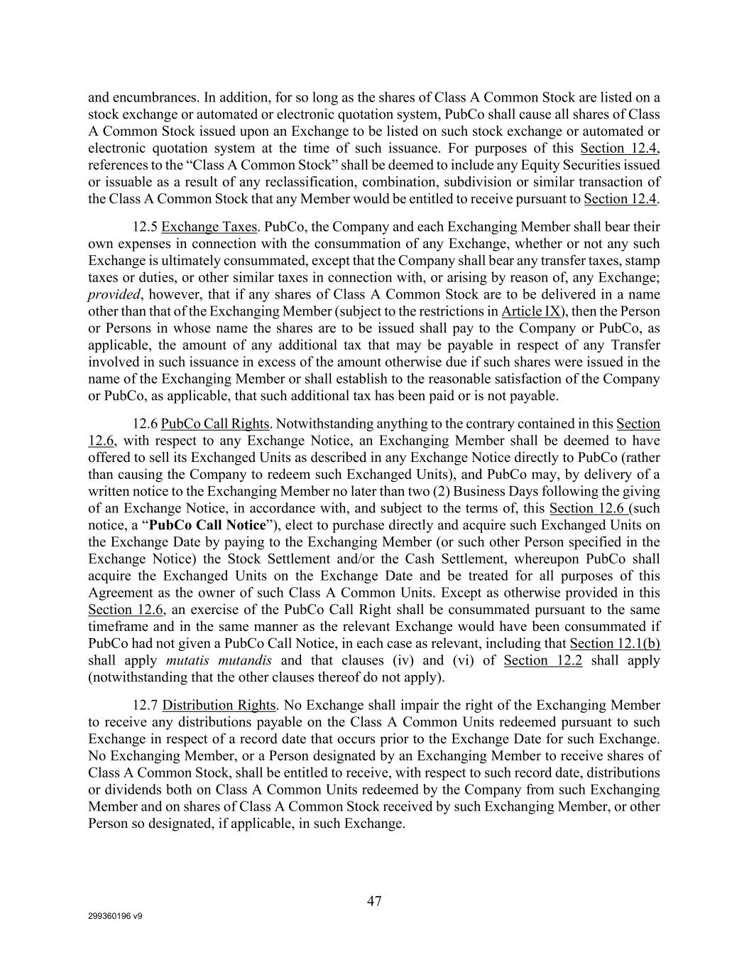 299360196 v9 47 and encumbrances. In addition, for so long as the shares of Class A Common Stock are listed on a stock exchange or automated or electronic quotation system, PubCo shall cause all shares of Class A Common Stock issued upon an Exchange to be listed on such stock exchange or automated or electronic quotation system at the time of such issuance. For purposes of this Section 12.4, references to the “Class A Common Stock” shall be deemed to include any Equity Securities issued or issuable as a result of any reclassification, combination, subdivision or similar transaction of the Class A Common Stock that any Member would be entitled to receive pursuant to Section 12.4. 12.5 Exchange Taxes. PubCo, the Company and each Exchanging Member shall bear their own expenses in connection with the consummation of any Exchange, whether or not any such Exchange is ultimately consummated, except that the Company shall bear any transfer taxes, stamp taxes or duties, or other similar taxes in connection with, or arising by reason of, any Exchange; provided, however, that if any shares of Class A Common Stock are to be delivered in a name other than that of the Exchanging Member (subject to the restrictions in Article IX), then the Person or Persons in whose name the shares are to be issued shall pay to the Company or PubCo, as applicable, the amount of any additional tax that may be payable in respect of any Transfer involved in such issuance in excess of the amount otherwise due if such shares were issued in the name of the Exchanging Member or shall establish to the reasonable satisfaction of the Company or PubCo, as applicable, that such additional tax has been paid or is not payable. 12.6 PubCo Call Rights. Notwithstanding anything to the contrary contained in this Section 12.6, with respect to any Exchange Notice, an Exchanging Member shall be deemed to have offered to sell its Exchanged Units as described in any Exchange Notice directly to PubCo (rather than causing the Company to redeem such Exchanged Units), and PubCo may, by delivery of a written notice to the Exchanging Member no later than two (2) Business Days following the giving of an Exchange Notice, in accordance with, and subject to the terms of, this Section 12.6 (such notice, a “PubCo Call Notice”), elect to purchase directly and acquire such Exchanged Units on the Exchange Date by paying to the Exchanging Member (or such other Person specified in the Exchange Notice) the Stock Settlement and/or the Cash Settlement, whereupon PubCo shall acquire the Exchanged Units on the Exchange Date and be treated for all purposes of this Agreement as the owner of such Class A Common Units. Except as otherwise provided in this Section 12.6, an exercise of the PubCo Call Right shall be consummated pursuant to the same timeframe and in the same manner as the relevant Exchange would have been consummated if PubCo had not given a PubCo Call Notice, in each case as relevant, including that Section 12.1(b) shall apply mutatis mutandis and that clauses (iv) and (vi) of Section 12.2 shall apply (notwithstanding that the other clauses thereof do not apply). 12.7 Distribution Rights. No Exchange shall impair the right of the Exchanging Member to receive any distributions payable on the Class A Common Units redeemed pursuant to such Exchange in respect of a record date that occurs prior to the Exchange Date for such Exchange. No Exchanging Member, or a Person designated by an Exchanging Member to receive shares of Class A Common Stock, shall be entitled to receive, with respect to such record date, distributions or dividends both on Class A Common Units redeemed by the Company from such Exchanging Member and on shares of Class A Common Stock received by such Exchanging Member, or other Person so designated, if applicable, in such Exchange.