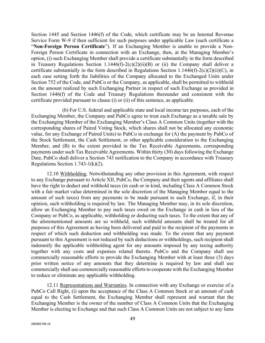 299360196 v9 49 Section 1445 and Section 1446(f) of the Code, which certificate may be an Internal Revenue Service Form W-9 if then sufficient for such purposes under applicable Law (such certificate a “Non-Foreign Person Certificate”). If an Exchanging Member is unable to provide a Non- Foreign Person Certificate in connection with an Exchange, then, at the Managing Member’s option, (i) such Exchanging Member shall provide a certificate substantially in the form described in Treasury Regulations Section 1.1446(f)-2(c)(2)(ii)(B) or (ii) the Company shall deliver a certificate substantially in the form described in Regulations Section 1.1446(f)-2(c)(2)(ii)(C), in each case setting forth the liabilities of the Company allocated to the Exchanged Units under Section 752 of the Code, and PubCo or the Company, as applicable, shall be permitted to withhold on the amount realized by such Exchanging Partner in respect of such Exchange as provided in Section 1446(f) of the Code and Treasury Regulations thereunder and consistent with the certificate provided pursuant to clause (i) or (ii) of this sentence, as applicable. (b) For U.S. federal and applicable state and local income tax purposes, each of the Exchanging Member, the Company and PubCo agree to treat each Exchange as a taxable sale by the Exchanging Member of the Exchanging Member’s Class A Common Units (together with the corresponding shares of Paired Voting Stock, which shares shall not be allocated any economic value, for any Exchange of Paired Units) to PubCo in exchange for (A) the payment by PubCo of the Stock Settlement, the Cash Settlement, or other applicable consideration to the Exchanging Member, and (B) to the extent provided in the Tax Receivable Agreements, corresponding payments under such Tax Receivable Agreements. Within thirty (30) days following the Exchange Date, PubCo shall deliver a Section 743 notification to the Company in accordance with Treasury Regulations Section 1.743-1(k)(2). 12.10 Withholding. Notwithstanding any other provision in this Agreement, with respect to any Exchange pursuant to Article XII, PubCo, the Company and their agents and affiliates shall have the right to deduct and withhold taxes (in cash or in kind, including Class A Common Stock with a fair market value determined in the sole discretion of the Managing Member equal to the amount of such taxes) from any payments to be made pursuant to such Exchange, if, in their opinion, such withholding is required by law. The Managing Member may, in its sole discretion, allow an Exchanging Member to pay such taxes owed on the Exchange in cash in lieu of the Company or PubCo, as applicable, withholding or deducting such taxes. To the extent that any of the aforementioned amounts are so withheld, such withheld amounts shall be treated for all purposes of this Agreement as having been delivered and paid to the recipient of the payments in respect of which such deduction and withholding was made. To the extent that any payment pursuant to this Agreement is not reduced by such deductions or withholdings, such recipient shall indemnify the applicable withholding agent for any amounts imposed by any taxing authority together with any costs and expenses related thereto. PubCo and the Company shall use commercially reasonable efforts to provide the Exchanging Member with at least three (3) days prior written notice of any amounts that they determine is required by law and shall use commercially shall use commercially reasonable efforts to cooperate with the Exchanging Member to reduce or eliminate any applicable withholding. 12.11 Representations and Warranties. In connection with any Exchange or exercise of a PubCo Call Right, (i) upon the acceptance of the Class A Common Stock or an amount of cash equal to the Cash Settlement, the Exchanging Member shall represent and warrant that the Exchanging Member is the owner of the number of Class A Common Units that the Exchanging Member is electing to Exchange and that such Class A Common Units are not subject to any liens