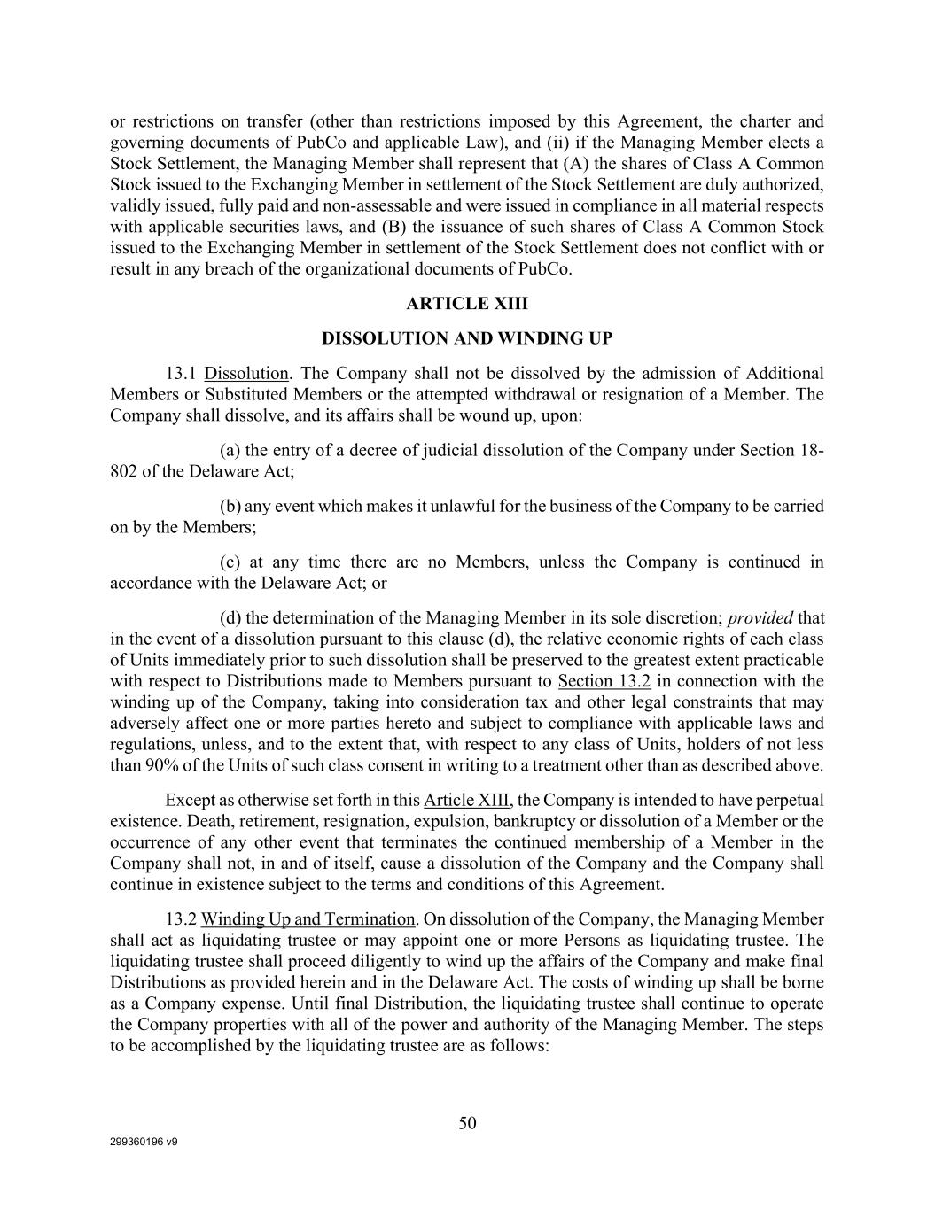 299360196 v9 50 or restrictions on transfer (other than restrictions imposed by this Agreement, the charter and governing documents of PubCo and applicable Law), and (ii) if the Managing Member elects a Stock Settlement, the Managing Member shall represent that (A) the shares of Class A Common Stock issued to the Exchanging Member in settlement of the Stock Settlement are duly authorized, validly issued, fully paid and non-assessable and were issued in compliance in all material respects with applicable securities laws, and (B) the issuance of such shares of Class A Common Stock issued to the Exchanging Member in settlement of the Stock Settlement does not conflict with or result in any breach of the organizational documents of PubCo. ARTICLE XIII DISSOLUTION AND WINDING UP 13.1 Dissolution. The Company shall not be dissolved by the admission of Additional Members or Substituted Members or the attempted withdrawal or resignation of a Member. The Company shall dissolve, and its affairs shall be wound up, upon: (a) the entry of a decree of judicial dissolution of the Company under Section 18- 802 of the Delaware Act; (b) any event which makes it unlawful for the business of the Company to be carried on by the Members; (c) at any time there are no Members, unless the Company is continued in accordance with the Delaware Act; or (d) the determination of the Managing Member in its sole discretion; provided that in the event of a dissolution pursuant to this clause (d), the relative economic rights of each class of Units immediately prior to such dissolution shall be preserved to the greatest extent practicable with respect to Distributions made to Members pursuant to Section 13.2 in connection with the winding up of the Company, taking into consideration tax and other legal constraints that may adversely affect one or more parties hereto and subject to compliance with applicable laws and regulations, unless, and to the extent that, with respect to any class of Units, holders of not less than 90% of the Units of such class consent in writing to a treatment other than as described above. Except as otherwise set forth in this Article XIII, the Company is intended to have perpetual existence. Death, retirement, resignation, expulsion, bankruptcy or dissolution of a Member or the occurrence of any other event that terminates the continued membership of a Member in the Company shall not, in and of itself, cause a dissolution of the Company and the Company shall continue in existence subject to the terms and conditions of this Agreement. 13.2 Winding Up and Termination. On dissolution of the Company, the Managing Member shall act as liquidating trustee or may appoint one or more Persons as liquidating trustee. The liquidating trustee shall proceed diligently to wind up the affairs of the Company and make final Distributions as provided herein and in the Delaware Act. The costs of winding up shall be borne as a Company expense. Until final Distribution, the liquidating trustee shall continue to operate the Company properties with all of the power and authority of the Managing Member. The steps to be accomplished by the liquidating trustee are as follows: