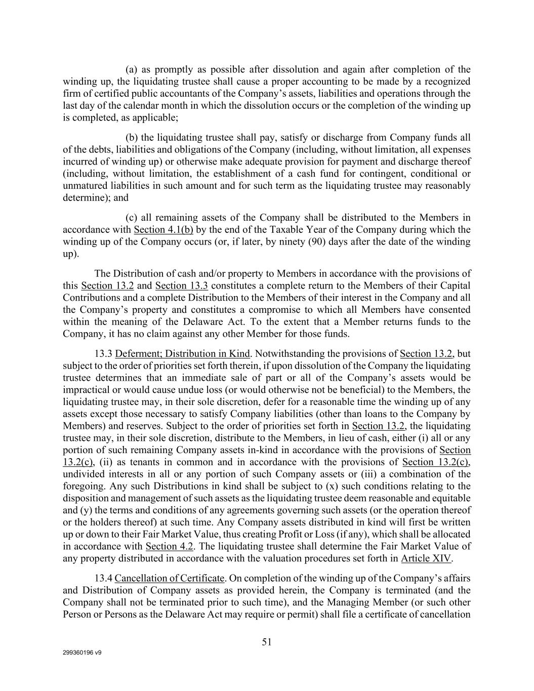 299360196 v9 51 (a) as promptly as possible after dissolution and again after completion of the winding up, the liquidating trustee shall cause a proper accounting to be made by a recognized firm of certified public accountants of the Company’s assets, liabilities and operations through the last day of the calendar month in which the dissolution occurs or the completion of the winding up is completed, as applicable; (b) the liquidating trustee shall pay, satisfy or discharge from Company funds all of the debts, liabilities and obligations of the Company (including, without limitation, all expenses incurred of winding up) or otherwise make adequate provision for payment and discharge thereof (including, without limitation, the establishment of a cash fund for contingent, conditional or unmatured liabilities in such amount and for such term as the liquidating trustee may reasonably determine); and (c) all remaining assets of the Company shall be distributed to the Members in accordance with Section 4.1(b) by the end of the Taxable Year of the Company during which the winding up of the Company occurs (or, if later, by ninety (90) days after the date of the winding up). The Distribution of cash and/or property to Members in accordance with the provisions of this Section 13.2 and Section 13.3 constitutes a complete return to the Members of their Capital Contributions and a complete Distribution to the Members of their interest in the Company and all the Company’s property and constitutes a compromise to which all Members have consented within the meaning of the Delaware Act. To the extent that a Member returns funds to the Company, it has no claim against any other Member for those funds. 13.3 Deferment; Distribution in Kind. Notwithstanding the provisions of Section 13.2, but subject to the order of priorities set forth therein, if upon dissolution of the Company the liquidating trustee determines that an immediate sale of part or all of the Company’s assets would be impractical or would cause undue loss (or would otherwise not be beneficial) to the Members, the liquidating trustee may, in their sole discretion, defer for a reasonable time the winding up of any assets except those necessary to satisfy Company liabilities (other than loans to the Company by Members) and reserves. Subject to the order of priorities set forth in Section 13.2, the liquidating trustee may, in their sole discretion, distribute to the Members, in lieu of cash, either (i) all or any portion of such remaining Company assets in-kind in accordance with the provisions of Section 13.2(c), (ii) as tenants in common and in accordance with the provisions of Section 13.2(c), undivided interests in all or any portion of such Company assets or (iii) a combination of the foregoing. Any such Distributions in kind shall be subject to (x) such conditions relating to the disposition and management of such assets as the liquidating trustee deem reasonable and equitable and (y) the terms and conditions of any agreements governing such assets (or the operation thereof or the holders thereof) at such time. Any Company assets distributed in kind will first be written up or down to their Fair Market Value, thus creating Profit or Loss (if any), which shall be allocated in accordance with Section 4.2. The liquidating trustee shall determine the Fair Market Value of any property distributed in accordance with the valuation procedures set forth in Article XIV. 13.4 Cancellation of Certificate. On completion of the winding up of the Company’s affairs and Distribution of Company assets as provided herein, the Company is terminated (and the Company shall not be terminated prior to such time), and the Managing Member (or such other Person or Persons as the Delaware Act may require or permit) shall file a certificate of cancellation