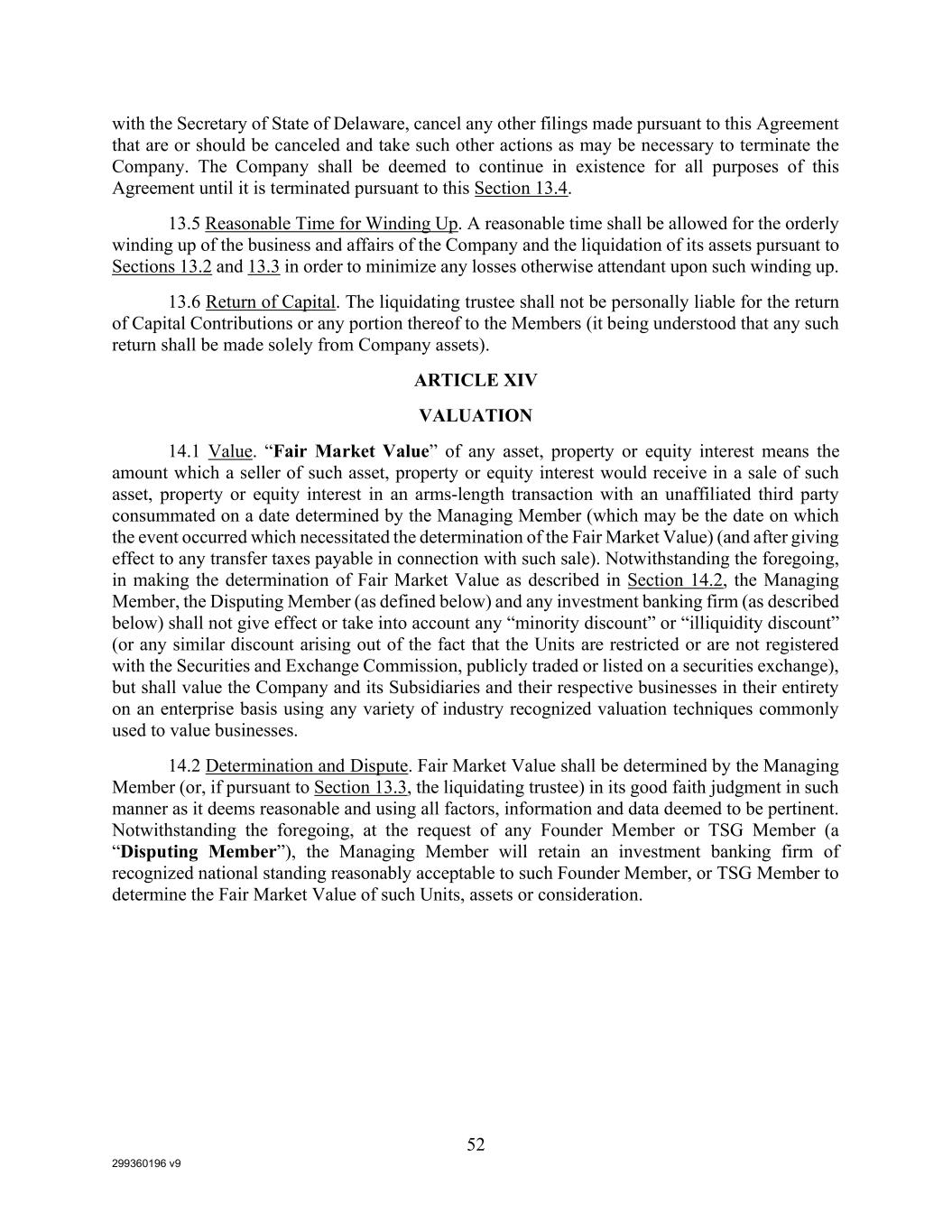 299360196 v9 52 with the Secretary of State of Delaware, cancel any other filings made pursuant to this Agreement that are or should be canceled and take such other actions as may be necessary to terminate the Company. The Company shall be deemed to continue in existence for all purposes of this Agreement until it is terminated pursuant to this Section 13.4. 13.5 Reasonable Time for Winding Up. A reasonable time shall be allowed for the orderly winding up of the business and affairs of the Company and the liquidation of its assets pursuant to Sections 13.2 and 13.3 in order to minimize any losses otherwise attendant upon such winding up. 13.6 Return of Capital. The liquidating trustee shall not be personally liable for the return of Capital Contributions or any portion thereof to the Members (it being understood that any such return shall be made solely from Company assets). ARTICLE XIV VALUATION 14.1 Value. “Fair Market Value” of any asset, property or equity interest means the amount which a seller of such asset, property or equity interest would receive in a sale of such asset, property or equity interest in an arms-length transaction with an unaffiliated third party consummated on a date determined by the Managing Member (which may be the date on which the event occurred which necessitated the determination of the Fair Market Value) (and after giving effect to any transfer taxes payable in connection with such sale). Notwithstanding the foregoing, in making the determination of Fair Market Value as described in Section 14.2, the Managing Member, the Disputing Member (as defined below) and any investment banking firm (as described below) shall not give effect or take into account any “minority discount” or “illiquidity discount” (or any similar discount arising out of the fact that the Units are restricted or are not registered with the Securities and Exchange Commission, publicly traded or listed on a securities exchange), but shall value the Company and its Subsidiaries and their respective businesses in their entirety on an enterprise basis using any variety of industry recognized valuation techniques commonly used to value businesses. 14.2 Determination and Dispute. Fair Market Value shall be determined by the Managing Member (or, if pursuant to Section 13.3, the liquidating trustee) in its good faith judgment in such manner as it deems reasonable and using all factors, information and data deemed to be pertinent. Notwithstanding the foregoing, at the request of any Founder Member or TSG Member (a “Disputing Member”), the Managing Member will retain an investment banking firm of recognized national standing reasonably acceptable to such Founder Member, or TSG Member to determine the Fair Market Value of such Units, assets or consideration.