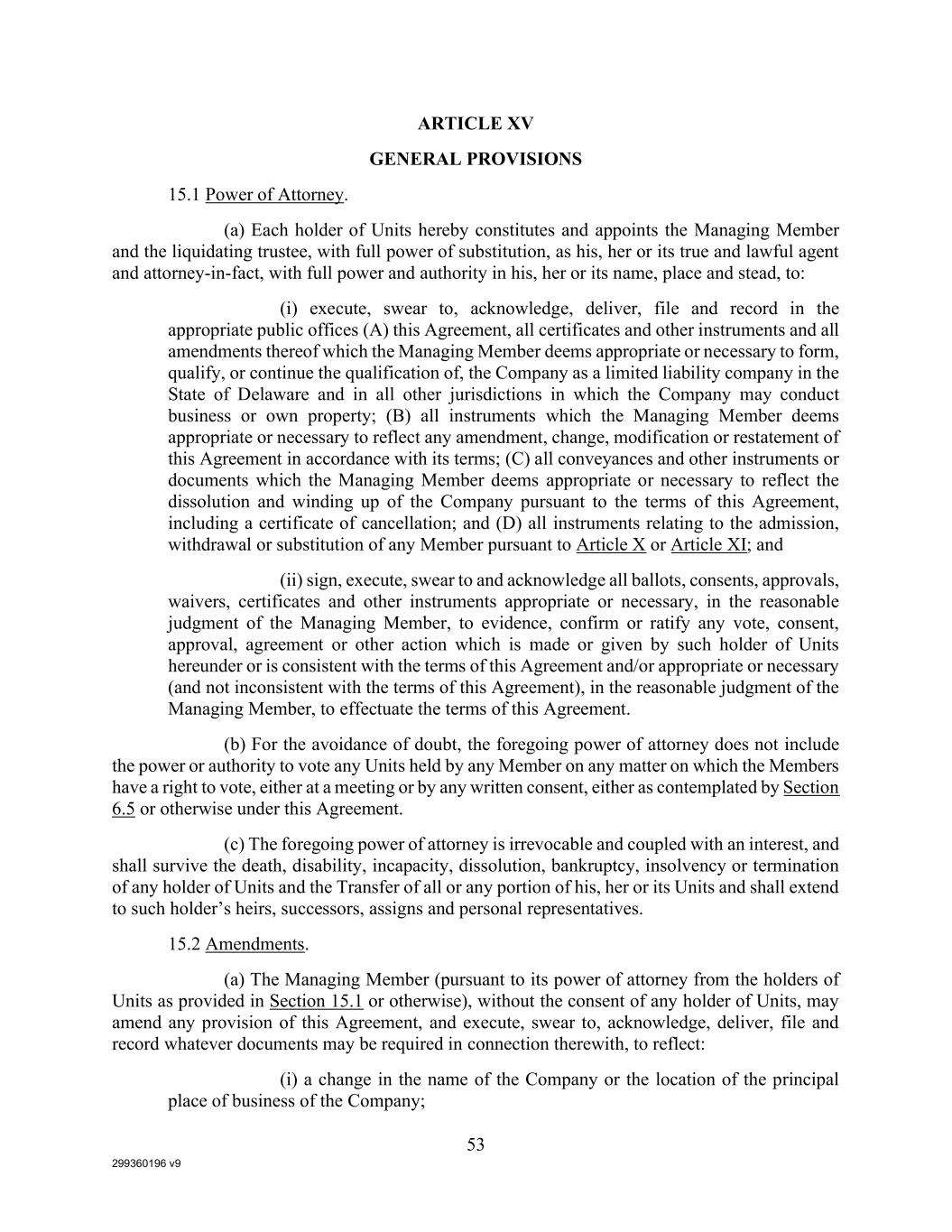 299360196 v9 53 ARTICLE XV GENERAL PROVISIONS 15.1 Power of Attorney. (a) Each holder of Units hereby constitutes and appoints the Managing Member and the liquidating trustee, with full power of substitution, as his, her or its true and lawful agent and attorney-in-fact, with full power and authority in his, her or its name, place and stead, to: (i) execute, swear to, acknowledge, deliver, file and record in the appropriate public offices (A) this Agreement, all certificates and other instruments and all amendments thereof which the Managing Member deems appropriate or necessary to form, qualify, or continue the qualification of, the Company as a limited liability company in the State of Delaware and in all other jurisdictions in which the Company may conduct business or own property; (B) all instruments which the Managing Member deems appropriate or necessary to reflect any amendment, change, modification or restatement of this Agreement in accordance with its terms; (C) all conveyances and other instruments or documents which the Managing Member deems appropriate or necessary to reflect the dissolution and winding up of the Company pursuant to the terms of this Agreement, including a certificate of cancellation; and (D) all instruments relating to the admission, withdrawal or substitution of any Member pursuant to Article X or Article XI; and (ii) sign, execute, swear to and acknowledge all ballots, consents, approvals, waivers, certificates and other instruments appropriate or necessary, in the reasonable judgment of the Managing Member, to evidence, confirm or ratify any vote, consent, approval, agreement or other action which is made or given by such holder of Units hereunder or is consistent with the terms of this Agreement and/or appropriate or necessary (and not inconsistent with the terms of this Agreement), in the reasonable judgment of the Managing Member, to effectuate the terms of this Agreement. (b) For the avoidance of doubt, the foregoing power of attorney does not include the power or authority to vote any Units held by any Member on any matter on which the Members have a right to vote, either at a meeting or by any written consent, either as contemplated by Section 6.5 or otherwise under this Agreement. (c) The foregoing power of attorney is irrevocable and coupled with an interest, and shall survive the death, disability, incapacity, dissolution, bankruptcy, insolvency or termination of any holder of Units and the Transfer of all or any portion of his, her or its Units and shall extend to such holder’s heirs, successors, assigns and personal representatives. 15.2 Amendments. (a) The Managing Member (pursuant to its power of attorney from the holders of Units as provided in Section 15.1 or otherwise), without the consent of any holder of Units, may amend any provision of this Agreement, and execute, swear to, acknowledge, deliver, file and record whatever documents may be required in connection therewith, to reflect: (i) a change in the name of the Company or the location of the principal place of business of the Company;