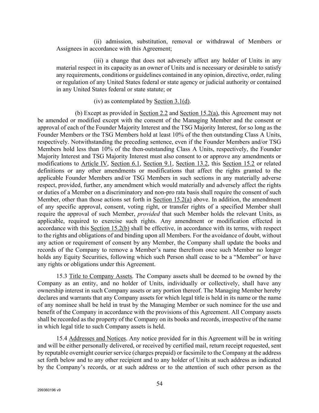 299360196 v9 54 (ii) admission, substitution, removal or withdrawal of Members or Assignees in accordance with this Agreement; (iii) a change that does not adversely affect any holder of Units in any material respect in its capacity as an owner of Units and is necessary or desirable to satisfy any requirements, conditions or guidelines contained in any opinion, directive, order, ruling or regulation of any United States federal or state agency or judicial authority or contained in any United States federal or state statute; or (iv) as contemplated by Section 3.1(d). (b) Except as provided in Section 2.2 and Section 15.2(a), this Agreement may not be amended or modified except with the consent of the Managing Member and the consent or approval of each of the Founder Majority Interest and the TSG Majority Interest, for so long as the Founder Members or the TSG Members hold at least 10% of the then outstanding Class A Units, respectively. Notwithstanding the preceding sentence, even if the Founder Members and/or TSG Members hold less than 10% of the then-outstanding Class A Units, respectively, the Founder Majority Interest and TSG Majority Interest must also consent to or approve any amendments or modifications to Article IV, Section 6.1, Section 9.1, Section 13.2, this Section 15.2 or related definitions or any other amendments or modifications that affect the rights granted to the applicable Founder Members and/or TSG Members in such sections in any materially adverse respect, provided, further, any amendment which would materially and adversely affect the rights or duties of a Member on a discriminatory and non-pro rata basis shall require the consent of such Member, other than those actions set forth in Section 15.2(a) above. In addition, the amendment of any specific approval, consent, voting right, or transfer rights of a specified Member shall require the approval of such Member, provided that such Member holds the relevant Units, as applicable, required to exercise such rights. Any amendment or modification effected in accordance with this Section 15.2(b) shall be effective, in accordance with its terms, with respect to the rights and obligations of and binding upon all Members. For the avoidance of doubt, without any action or requirement of consent by any Member, the Company shall update the books and records of the Company to remove a Member’s name therefrom once such Member no longer holds any Equity Securities, following which such Person shall cease to be a “Member” or have any rights or obligations under this Agreement. 15.3 Title to Company Assets. The Company assets shall be deemed to be owned by the Company as an entity, and no holder of Units, individually or collectively, shall have any ownership interest in such Company assets or any portion thereof. The Managing Member hereby declares and warrants that any Company assets for which legal title is held in its name or the name of any nominee shall be held in trust by the Managing Member or such nominee for the use and benefit of the Company in accordance with the provisions of this Agreement. All Company assets shall be recorded as the property of the Company on its books and records, irrespective of the name in which legal title to such Company assets is held. 15.4 Addresses and Notices. Any notice provided for in this Agreement will be in writing and will be either personally delivered, or received by certified mail, return receipt requested, sent by reputable overnight courier service (charges prepaid) or facsimile to the Company at the address set forth below and to any other recipient and to any holder of Units at such address as indicated by the Company’s records, or at such address or to the attention of such other person as the