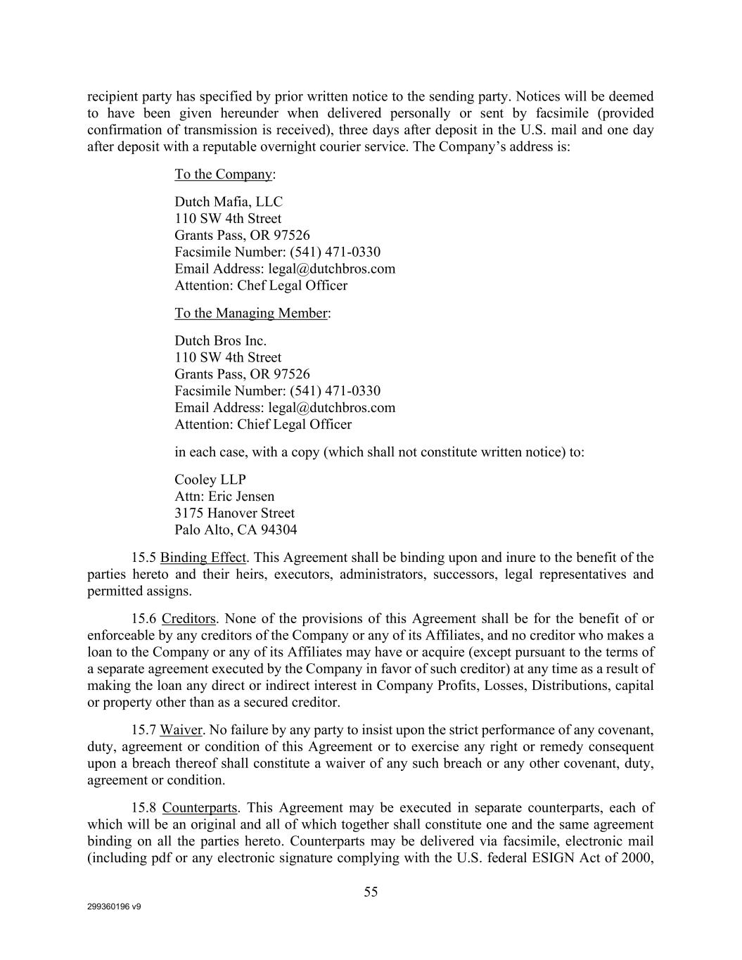 299360196 v9 55 recipient party has specified by prior written notice to the sending party. Notices will be deemed to have been given hereunder when delivered personally or sent by facsimile (provided confirmation of transmission is received), three days after deposit in the U.S. mail and one day after deposit with a reputable overnight courier service. The Company’s address is: To the Company: Dutch Mafia, LLC 110 SW 4th Street Grants Pass, OR 97526 Facsimile Number: (541) 471-0330 Email Address: legal@dutchbros.com Attention: Chef Legal Officer To the Managing Member: Dutch Bros Inc. 110 SW 4th Street Grants Pass, OR 97526 Facsimile Number: (541) 471-0330 Email Address: legal@dutchbros.com Attention: Chief Legal Officer in each case, with a copy (which shall not constitute written notice) to: Cooley LLP Attn: Eric Jensen 3175 Hanover Street Palo Alto, CA 94304 15.5 Binding Effect. This Agreement shall be binding upon and inure to the benefit of the parties hereto and their heirs, executors, administrators, successors, legal representatives and permitted assigns. 15.6 Creditors. None of the provisions of this Agreement shall be for the benefit of or enforceable by any creditors of the Company or any of its Affiliates, and no creditor who makes a loan to the Company or any of its Affiliates may have or acquire (except pursuant to the terms of a separate agreement executed by the Company in favor of such creditor) at any time as a result of making the loan any direct or indirect interest in Company Profits, Losses, Distributions, capital or property other than as a secured creditor. 15.7 Waiver. No failure by any party to insist upon the strict performance of any covenant, duty, agreement or condition of this Agreement or to exercise any right or remedy consequent upon a breach thereof shall constitute a waiver of any such breach or any other covenant, duty, agreement or condition. 15.8 Counterparts. This Agreement may be executed in separate counterparts, each of which will be an original and all of which together shall constitute one and the same agreement binding on all the parties hereto. Counterparts may be delivered via facsimile, electronic mail (including pdf or any electronic signature complying with the U.S. federal ESIGN Act of 2000,