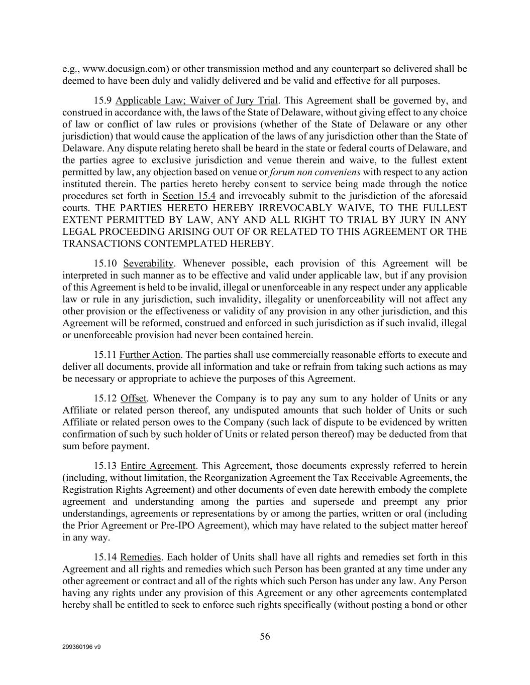 299360196 v9 56 e.g., www.docusign.com) or other transmission method and any counterpart so delivered shall be deemed to have been duly and validly delivered and be valid and effective for all purposes. 15.9 Applicable Law; Waiver of Jury Trial. This Agreement shall be governed by, and construed in accordance with, the laws of the State of Delaware, without giving effect to any choice of law or conflict of law rules or provisions (whether of the State of Delaware or any other jurisdiction) that would cause the application of the laws of any jurisdiction other than the State of Delaware. Any dispute relating hereto shall be heard in the state or federal courts of Delaware, and the parties agree to exclusive jurisdiction and venue therein and waive, to the fullest extent permitted by law, any objection based on venue or forum non conveniens with respect to any action instituted therein. The parties hereto hereby consent to service being made through the notice procedures set forth in Section 15.4 and irrevocably submit to the jurisdiction of the aforesaid courts. THE PARTIES HERETO HEREBY IRREVOCABLY WAIVE, TO THE FULLEST EXTENT PERMITTED BY LAW, ANY AND ALL RIGHT TO TRIAL BY JURY IN ANY LEGAL PROCEEDING ARISING OUT OF OR RELATED TO THIS AGREEMENT OR THE TRANSACTIONS CONTEMPLATED HEREBY. 15.10 Severability. Whenever possible, each provision of this Agreement will be interpreted in such manner as to be effective and valid under applicable law, but if any provision of this Agreement is held to be invalid, illegal or unenforceable in any respect under any applicable law or rule in any jurisdiction, such invalidity, illegality or unenforceability will not affect any other provision or the effectiveness or validity of any provision in any other jurisdiction, and this Agreement will be reformed, construed and enforced in such jurisdiction as if such invalid, illegal or unenforceable provision had never been contained herein. 15.11 Further Action. The parties shall use commercially reasonable efforts to execute and deliver all documents, provide all information and take or refrain from taking such actions as may be necessary or appropriate to achieve the purposes of this Agreement. 15.12 Offset. Whenever the Company is to pay any sum to any holder of Units or any Affiliate or related person thereof, any undisputed amounts that such holder of Units or such Affiliate or related person owes to the Company (such lack of dispute to be evidenced by written confirmation of such by such holder of Units or related person thereof) may be deducted from that sum before payment. 15.13 Entire Agreement. This Agreement, those documents expressly referred to herein (including, without limitation, the Reorganization Agreement the Tax Receivable Agreements, the Registration Rights Agreement) and other documents of even date herewith embody the complete agreement and understanding among the parties and supersede and preempt any prior understandings, agreements or representations by or among the parties, written or oral (including the Prior Agreement or Pre-IPO Agreement), which may have related to the subject matter hereof in any way. 15.14 Remedies. Each holder of Units shall have all rights and remedies set forth in this Agreement and all rights and remedies which such Person has been granted at any time under any other agreement or contract and all of the rights which such Person has under any law. Any Person having any rights under any provision of this Agreement or any other agreements contemplated hereby shall be entitled to seek to enforce such rights specifically (without posting a bond or other