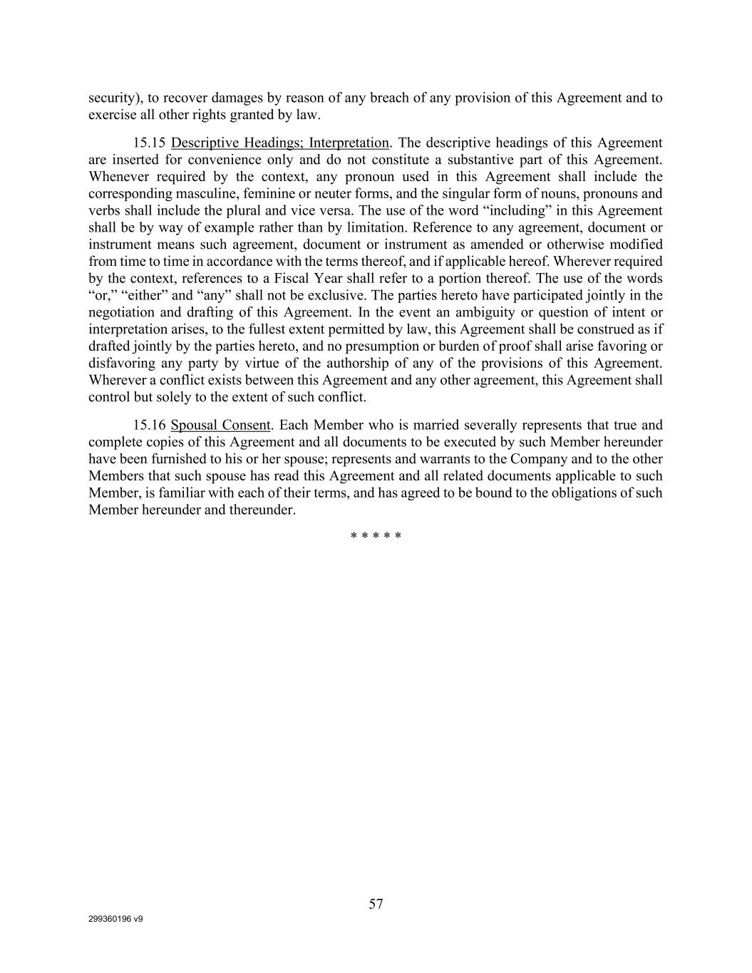 299360196 v9 57 security), to recover damages by reason of any breach of any provision of this Agreement and to exercise all other rights granted by law. 15.15 Descriptive Headings; Interpretation. The descriptive headings of this Agreement are inserted for convenience only and do not constitute a substantive part of this Agreement. Whenever required by the context, any pronoun used in this Agreement shall include the corresponding masculine, feminine or neuter forms, and the singular form of nouns, pronouns and verbs shall include the plural and vice versa. The use of the word “including” in this Agreement shall be by way of example rather than by limitation. Reference to any agreement, document or instrument means such agreement, document or instrument as amended or otherwise modified from time to time in accordance with the terms thereof, and if applicable hereof. Wherever required by the context, references to a Fiscal Year shall refer to a portion thereof. The use of the words “or,” “either” and “any” shall not be exclusive. The parties hereto have participated jointly in the negotiation and drafting of this Agreement. In the event an ambiguity or question of intent or interpretation arises, to the fullest extent permitted by law, this Agreement shall be construed as if drafted jointly by the parties hereto, and no presumption or burden of proof shall arise favoring or disfavoring any party by virtue of the authorship of any of the provisions of this Agreement. Wherever a conflict exists between this Agreement and any other agreement, this Agreement shall control but solely to the extent of such conflict. 15.16 Spousal Consent. Each Member who is married severally represents that true and complete copies of this Agreement and all documents to be executed by such Member hereunder have been furnished to his or her spouse; represents and warrants to the Company and to the other Members that such spouse has read this Agreement and all related documents applicable to such Member, is familiar with each of their terms, and has agreed to be bound to the obligations of such Member hereunder and thereunder. * * * * *
