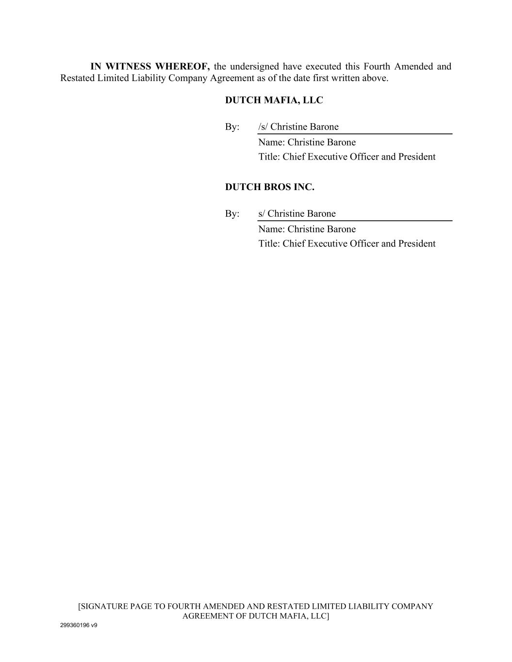299360196 v9 [SIGNATURE PAGE TO FOURTH AMENDED AND RESTATED LIMITED LIABILITY COMPANY AGREEMENT OF DUTCH MAFIA, LLC] IN WITNESS WHEREOF, the undersigned have executed this Fourth Amended and Restated Limited Liability Company Agreement as of the date first written above. DUTCH MAFIA, LLC By: /s/ Christine Barone Name: Christine Barone Title: Chief Executive Officer and President DUTCH BROS INC. By: s/ Christine Barone Name: Christine Barone Title: Chief Executive Officer and President