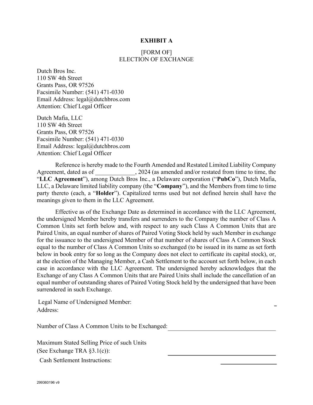 299360196 v9 EXHIBIT A [FORM OF] ELECTION OF EXCHANGE Dutch Bros Inc. 110 SW 4th Street Grants Pass, OR 97526 Facsimile Number: (541) 471-0330 Email Address: legal@dutchbros.com Attention: Chief Legal Officer Dutch Mafia, LLC 110 SW 4th Street Grants Pass, OR 97526 Facsimile Number: (541) 471-0330 Email Address: legal@dutchbros.com Attention: Chief Legal Officer Reference is hereby made to the Fourth Amended and Restated Limited Liability Company Agreement, dated as of _____________, 2024 (as amended and/or restated from time to time, the “LLC Agreement”), among Dutch Bros Inc., a Delaware corporation (“PubCo”), Dutch Mafia, LLC, a Delaware limited liability company (the “Company”), and the Members from time to time party thereto (each, a “Holder”). Capitalized terms used but not defined herein shall have the meanings given to them in the LLC Agreement. Effective as of the Exchange Date as determined in accordance with the LLC Agreement, the undersigned Member hereby transfers and surrenders to the Company the number of Class A Common Units set forth below and, with respect to any such Class A Common Units that are Paired Units, an equal number of shares of Paired Voting Stock held by such Member in exchange for the issuance to the undersigned Member of that number of shares of Class A Common Stock equal to the number of Class A Common Units so exchanged (to be issued in its name as set forth below in book entry for so long as the Company does not elect to certificate its capital stock), or, at the election of the Managing Member, a Cash Settlement to the account set forth below, in each case in accordance with the LLC Agreement. The undersigned hereby acknowledges that the Exchange of any Class A Common Units that are Paired Units shall include the cancellation of an equal number of outstanding shares of Paired Voting Stock held by the undersigned that have been surrendered in such Exchange. Legal Name of Undersigned Member: Address: Number of Class A Common Units to be Exchanged: Maximum Stated Selling Price of such Units (See Exchange TRA §3.1(c)): Cash Settlement Instructions: