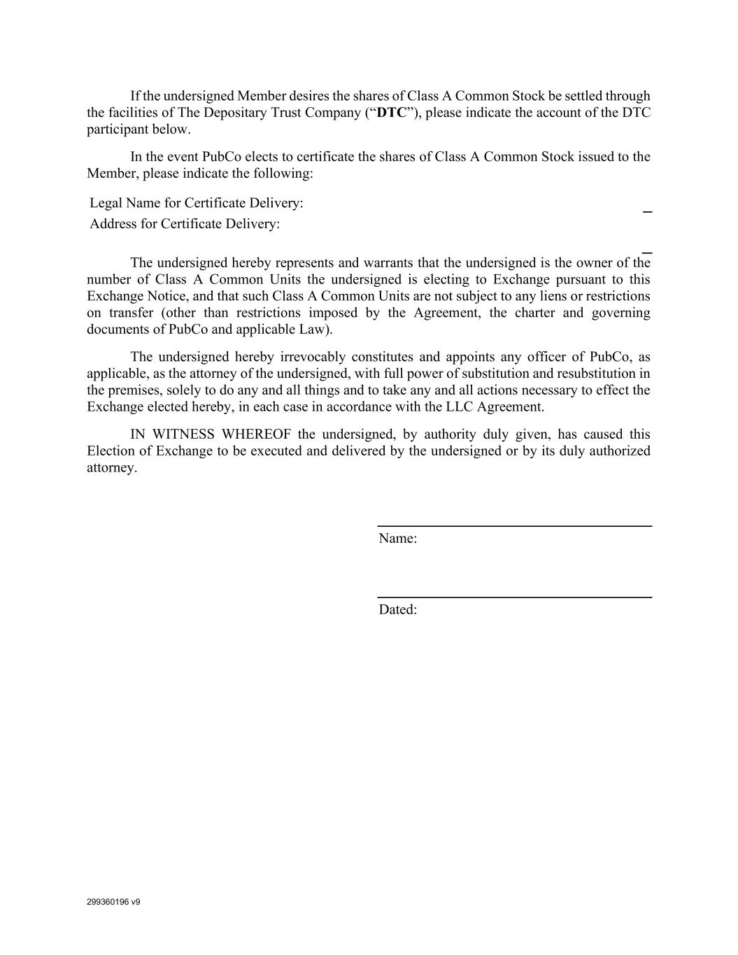 299360196 v9 If the undersigned Member desires the shares of Class A Common Stock be settled through the facilities of The Depositary Trust Company (“DTC”), please indicate the account of the DTC participant below. In the event PubCo elects to certificate the shares of Class A Common Stock issued to the Member, please indicate the following: Legal Name for Certificate Delivery: Address for Certificate Delivery: The undersigned hereby represents and warrants that the undersigned is the owner of the number of Class A Common Units the undersigned is electing to Exchange pursuant to this Exchange Notice, and that such Class A Common Units are not subject to any liens or restrictions on transfer (other than restrictions imposed by the Agreement, the charter and governing documents of PubCo and applicable Law). The undersigned hereby irrevocably constitutes and appoints any officer of PubCo, as applicable, as the attorney of the undersigned, with full power of substitution and resubstitution in the premises, solely to do any and all things and to take any and all actions necessary to effect the Exchange elected hereby, in each case in accordance with the LLC Agreement. IN WITNESS WHEREOF the undersigned, by authority duly given, has caused this Election of Exchange to be executed and delivered by the undersigned or by its duly authorized attorney. Name: Dated: