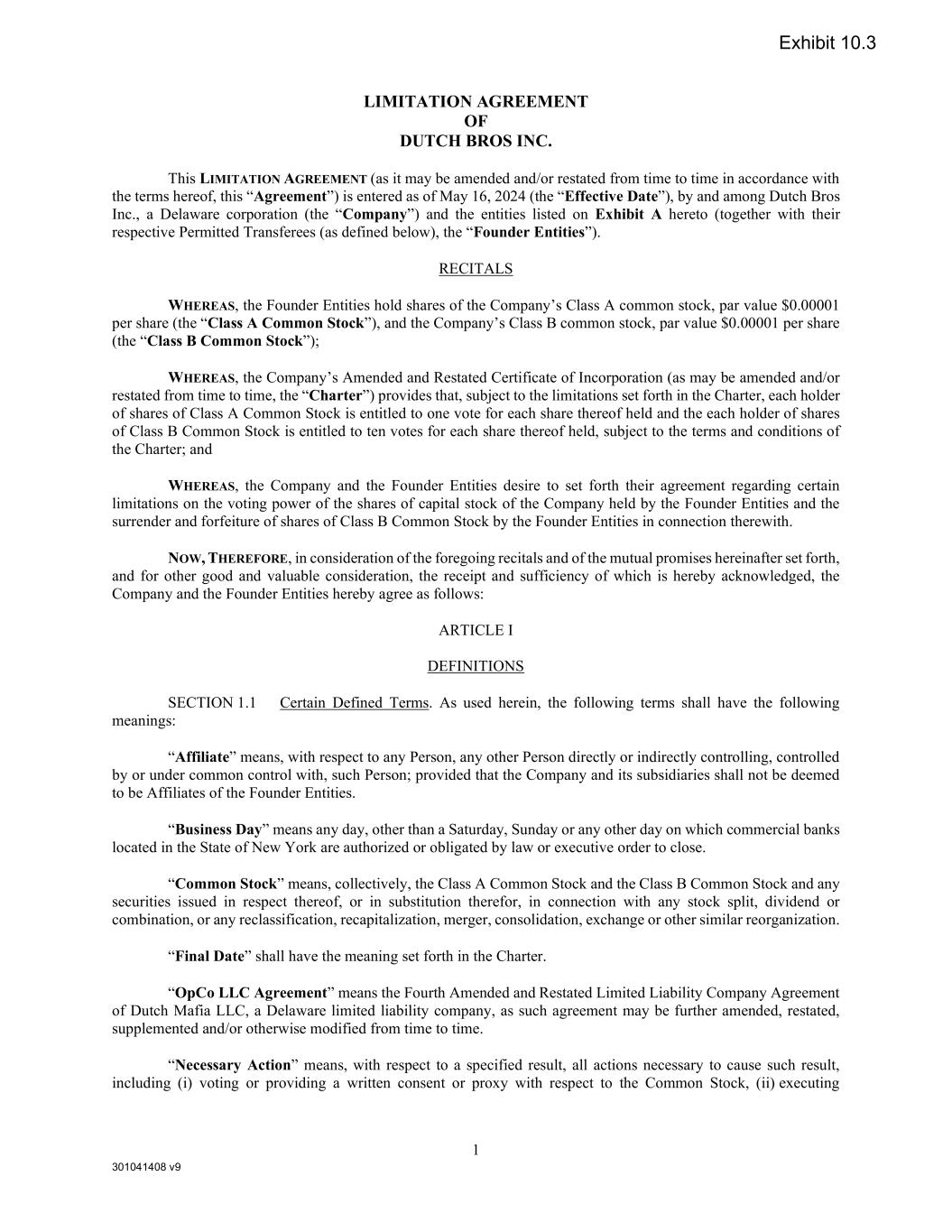 301041408 v9 1 LIMITATION AGREEMENT OF DUTCH BROS INC. This LIMITATION AGREEMENT (as it may be amended and/or restated from time to time in accordance with the terms hereof, this “Agreement”) is entered as of May 16, 2024 (the “Effective Date”), by and among Dutch Bros Inc., a Delaware corporation (the “Company”) and the entities listed on Exhibit A hereto (together with their respective Permitted Transferees (as defined below), the “Founder Entities”). RECITALS WHEREAS, the Founder Entities hold shares of the Company’s Class A common stock, par value $0.00001 per share (the “Class A Common Stock”), and the Company’s Class B common stock, par value $0.00001 per share (the “Class B Common Stock”); WHEREAS, the Company’s Amended and Restated Certificate of Incorporation (as may be amended and/or restated from time to time, the “Charter”) provides that, subject to the limitations set forth in the Charter, each holder of shares of Class A Common Stock is entitled to one vote for each share thereof held and the each holder of shares of Class B Common Stock is entitled to ten votes for each share thereof held, subject to the terms and conditions of the Charter; and WHEREAS, the Company and the Founder Entities desire to set forth their agreement regarding certain limitations on the voting power of the shares of capital stock of the Company held by the Founder Entities and the surrender and forfeiture of shares of Class B Common Stock by the Founder Entities in connection therewith. NOW, THEREFORE, in consideration of the foregoing recitals and of the mutual promises hereinafter set forth, and for other good and valuable consideration, the receipt and sufficiency of which is hereby acknowledged, the Company and the Founder Entities hereby agree as follows: ARTICLE I DEFINITIONS SECTION 1.1 Certain Defined Terms. As used herein, the following terms shall have the following meanings: “Affiliate” means, with respect to any Person, any other Person directly or indirectly controlling, controlled by or under common control with, such Person; provided that the Company and its subsidiaries shall not be deemed to be Affiliates of the Founder Entities. “Business Day” means any day, other than a Saturday, Sunday or any other day on which commercial banks located in the State of New York are authorized or obligated by law or executive order to close. “Common Stock” means, collectively, the Class A Common Stock and the Class B Common Stock and any securities issued in respect thereof, or in substitution therefor, in connection with any stock split, dividend or combination, or any reclassification, recapitalization, merger, consolidation, exchange or other similar reorganization. “Final Date” shall have the meaning set forth in the Charter. “OpCo LLC Agreement” means the Fourth Amended and Restated Limited Liability Company Agreement of Dutch Mafia LLC, a Delaware limited liability company, as such agreement may be further amended, restated, supplemented and/or otherwise modified from time to time. “Necessary Action” means, with respect to a specified result, all actions necessary to cause such result, including (i) voting or providing a written consent or proxy with respect to the Common Stock, (ii) executing Exhibit 10.3