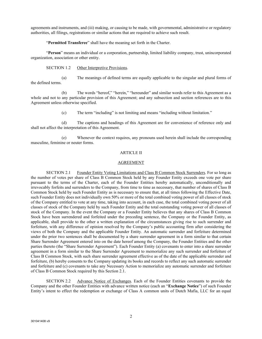 301041408 v9 2 agreements and instruments, and (iii) making, or causing to be made, with governmental, administrative or regulatory authorities, all filings, registrations or similar actions that are required to achieve such result. “Permitted Transferee” shall have the meaning set forth in the Charter. “Person” means an individual or a corporation, partnership, limited liability company, trust, unincorporated organization, association or other entity. SECTION 1.2 Other Interpretive Provisions. (a) The meanings of defined terms are equally applicable to the singular and plural forms of the defined terms. (b) The words “hereof,” “herein,” “hereunder” and similar words refer to this Agreement as a whole and not to any particular provision of this Agreement; and any subsection and section references are to this Agreement unless otherwise specified. (c) The term “including” is not limiting and means “including without limitation.” (d) The captions and headings of this Agreement are for convenience of reference only and shall not affect the interpretation of this Agreement. (e) Whenever the context requires, any pronouns used herein shall include the corresponding masculine, feminine or neuter forms. ARTICLE II AGREEMENT SECTION 2.1 Founder Entity Voting Limitations and Class B Common Stock Surrenders. For so long as the number of votes per share of Class B Common Stock held by any Founder Entity exceeds one vote per share pursuant to the terms of the Charter, each of the Founder Entities hereby automatically, unconditionally and irrevocably forfeits and surrenders to the Company, from time to time as necessary, that number of shares of Class B Common Stock held by such Founder Entity as is necessary to ensure that, at all times following the Effective Date, such Founder Entity does not individually own 50% or more of the total combined voting power of all classes of stock of the Company entitled to vote at any time, taking into account, in each case, the total combined voting power of all classes of stock of the Company held by such Founder Entity and the total outstanding voting power of all classes of stock of the Company. In the event the Company or a Founder Entity believes that any shares of Class B Common Stock have been surrendered and forfeited under the preceding sentence, the Company or the Founder Entity, as applicable, shall provide to the other a written explanation of the circumstances giving rise to such surrender and forfeiture, with any difference of opinion resolved by the Company’s public accounting firm after considering the views of both the Company and the applicable Founder Entity. An automatic surrender and forfeiture determined under the prior two sentences shall be documented by a share surrender agreement in a form similar to that certain Share Surrender Agreement entered into on the date hereof among the Company, the Founder Entities and the other parties thereto (the “Share Surrender Agreement”). Each Founder Entity (a) covenants to enter into a share surrender agreement in a form similar to the Share Surrender Agreement to memorialize any such surrender and forfeiture of Class B Common Stock, with such share surrender agreement effective as of the date of the applicable surrender and forfeiture, (b) hereby consents to the Company updating its books and records to reflect any such automatic surrender and forfeiture and (c) covenants to take any Necessary Action to memorialize any automatic surrender and forfeiture of Class B Common Stock required by this Section 2.1. SECTION 2.2 Advance Notice of Exchanges. Each of the Founder Entities covenants to provide the Company and the other Founder Entities with advance written notice (each an “Exchange Notice”) of such Founder Entity’s intent to effect the redemption or exchange of Class A common units of Dutch Mafia, LLC for an equal