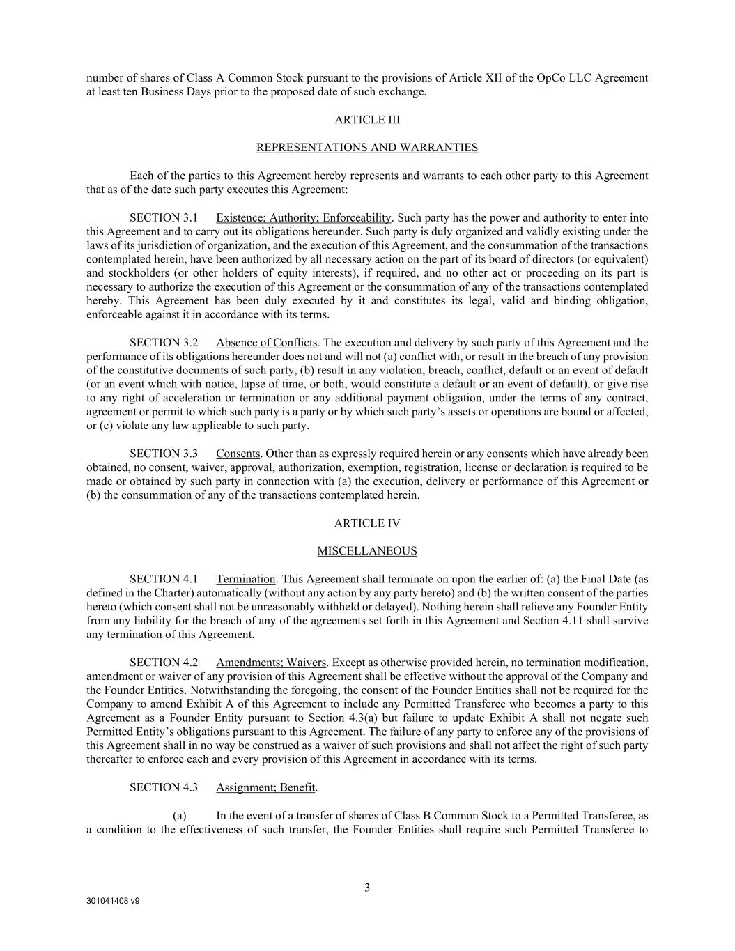 301041408 v9 3 number of shares of Class A Common Stock pursuant to the provisions of Article XII of the OpCo LLC Agreement at least ten Business Days prior to the proposed date of such exchange. ARTICLE III REPRESENTATIONS AND WARRANTIES Each of the parties to this Agreement hereby represents and warrants to each other party to this Agreement that as of the date such party executes this Agreement: SECTION 3.1 Existence; Authority; Enforceability. Such party has the power and authority to enter into this Agreement and to carry out its obligations hereunder. Such party is duly organized and validly existing under the laws of its jurisdiction of organization, and the execution of this Agreement, and the consummation of the transactions contemplated herein, have been authorized by all necessary action on the part of its board of directors (or equivalent) and stockholders (or other holders of equity interests), if required, and no other act or proceeding on its part is necessary to authorize the execution of this Agreement or the consummation of any of the transactions contemplated hereby. This Agreement has been duly executed by it and constitutes its legal, valid and binding obligation, enforceable against it in accordance with its terms. SECTION 3.2 Absence of Conflicts. The execution and delivery by such party of this Agreement and the performance of its obligations hereunder does not and will not (a) conflict with, or result in the breach of any provision of the constitutive documents of such party, (b) result in any violation, breach, conflict, default or an event of default (or an event which with notice, lapse of time, or both, would constitute a default or an event of default), or give rise to any right of acceleration or termination or any additional payment obligation, under the terms of any contract, agreement or permit to which such party is a party or by which such party’s assets or operations are bound or affected, or (c) violate any law applicable to such party. SECTION 3.3 Consents. Other than as expressly required herein or any consents which have already been obtained, no consent, waiver, approval, authorization, exemption, registration, license or declaration is required to be made or obtained by such party in connection with (a) the execution, delivery or performance of this Agreement or (b) the consummation of any of the transactions contemplated herein. ARTICLE IV MISCELLANEOUS SECTION 4.1 Termination. This Agreement shall terminate on upon the earlier of: (a) the Final Date (as defined in the Charter) automatically (without any action by any party hereto) and (b) the written consent of the parties hereto (which consent shall not be unreasonably withheld or delayed). Nothing herein shall relieve any Founder Entity from any liability for the breach of any of the agreements set forth in this Agreement and Section 4.11 shall survive any termination of this Agreement. SECTION 4.2 Amendments; Waivers. Except as otherwise provided herein, no termination modification, amendment or waiver of any provision of this Agreement shall be effective without the approval of the Company and the Founder Entities. Notwithstanding the foregoing, the consent of the Founder Entities shall not be required for the Company to amend Exhibit A of this Agreement to include any Permitted Transferee who becomes a party to this Agreement as a Founder Entity pursuant to Section 4.3(a) but failure to update Exhibit A shall not negate such Permitted Entity’s obligations pursuant to this Agreement. The failure of any party to enforce any of the provisions of this Agreement shall in no way be construed as a waiver of such provisions and shall not affect the right of such party thereafter to enforce each and every provision of this Agreement in accordance with its terms. SECTION 4.3 Assignment; Benefit. (a) In the event of a transfer of shares of Class B Common Stock to a Permitted Transferee, as a condition to the effectiveness of such transfer, the Founder Entities shall require such Permitted Transferee to