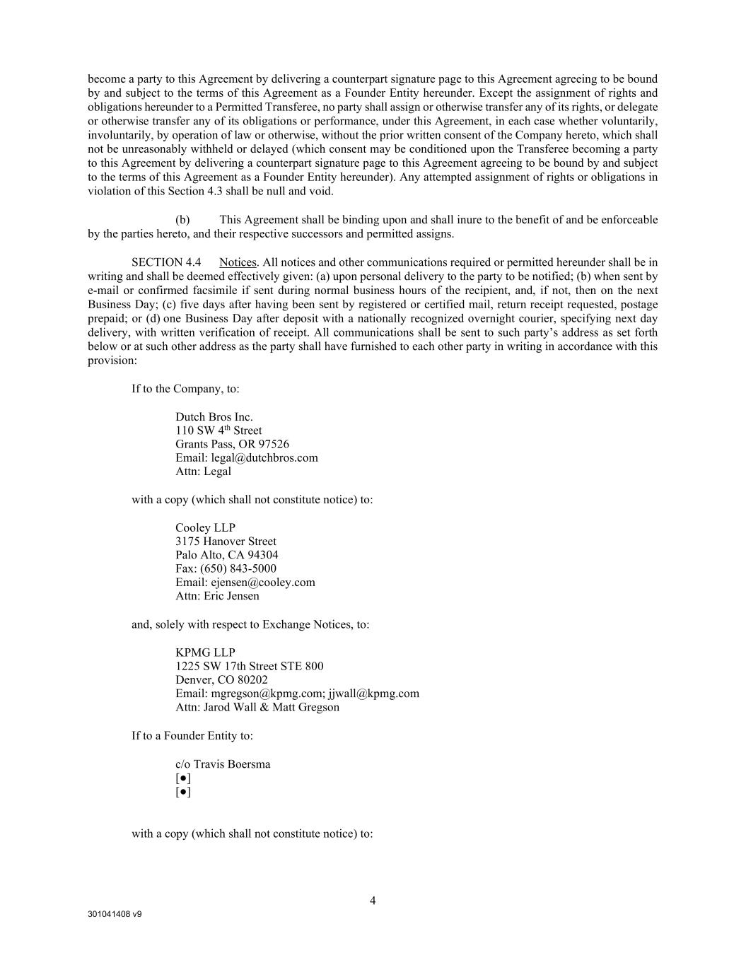 301041408 v9 4 become a party to this Agreement by delivering a counterpart signature page to this Agreement agreeing to be bound by and subject to the terms of this Agreement as a Founder Entity hereunder. Except the assignment of rights and obligations hereunder to a Permitted Transferee, no party shall assign or otherwise transfer any of its rights, or delegate or otherwise transfer any of its obligations or performance, under this Agreement, in each case whether voluntarily, involuntarily, by operation of law or otherwise, without the prior written consent of the Company hereto, which shall not be unreasonably withheld or delayed (which consent may be conditioned upon the Transferee becoming a party to this Agreement by delivering a counterpart signature page to this Agreement agreeing to be bound by and subject to the terms of this Agreement as a Founder Entity hereunder). Any attempted assignment of rights or obligations in violation of this Section 4.3 shall be null and void. (b) This Agreement shall be binding upon and shall inure to the benefit of and be enforceable by the parties hereto, and their respective successors and permitted assigns. SECTION 4.4 Notices. All notices and other communications required or permitted hereunder shall be in writing and shall be deemed effectively given: (a) upon personal delivery to the party to be notified; (b) when sent by e-mail or confirmed facsimile if sent during normal business hours of the recipient, and, if not, then on the next Business Day; (c) five days after having been sent by registered or certified mail, return receipt requested, postage prepaid; or (d) one Business Day after deposit with a nationally recognized overnight courier, specifying next day delivery, with written verification of receipt. All communications shall be sent to such party’s address as set forth below or at such other address as the party shall have furnished to each other party in writing in accordance with this provision: If to the Company, to: Dutch Bros Inc. 110 SW 4th Street Grants Pass, OR 97526 Email: legal@dutchbros.com Attn: Legal with a copy (which shall not constitute notice) to: Cooley LLP 3175 Hanover Street Palo Alto, CA 94304 Fax: (650) 843-5000 Email: ejensen@cooley.com Attn: Eric Jensen and, solely with respect to Exchange Notices, to: KPMG LLP 1225 SW 17th Street STE 800 Denver, CO 80202 Email: mgregson@kpmg.com; jjwall@kpmg.com Attn: Jarod Wall & Matt Gregson If to a Founder Entity to: c/o Travis Boersma [●] [●] with a copy (which shall not constitute notice) to: